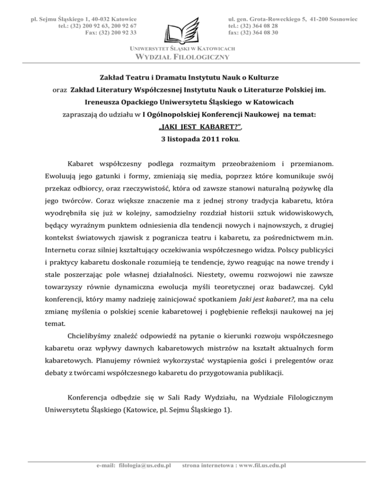 pl. Sejmu Śląskiego 1, 40-032 Katowice tel.: (32) 200 92 63, 200 92 67 Fax: (32) 200 92 33 ul. gen. Grota-Roweckiego 5, 41-200 Sosnowiec tel.: (32) 364 08 28 fax: (32) 364 08 30 UNIWERSYTET ŚLĄSKI W KATOWICACH WYDZIAŁ FILOLOGICZNY Zakład Teatru i Dramatu Instytutu Nauk o Kulturze oraz Zakład Literatury Współczesnej Instytutu Nauk o Literaturze Polskiej im. Ireneusza Opackiego Uniwersytetu Śląskiego w Katowicach zapraszają do udziału w I Ogólnopolskiej Konferencji Naukowej na temat: „JAKI JEST KABARET?”, 3 listopada 2011 roku. Kabaret współczesny podlega rozmaitym przeobrażeniom i przemianom. Ewoluują jego gatunki i formy, zmieniają się media, poprzez które komunikuje swój przekaz odbiorcy, oraz rzeczywistość, która od zawsze stanowi naturalną pożywkę dla jego twórców. Coraz większe znaczenie ma z jednej strony tradycja kabaretu, która wyodrębniła się już w kolejny, samodzielny rozdział historii sztuk widowiskowych, będący wyraźnym punktem odniesienia dla tendencji nowych i najnowszych, z drugiej kontekst światowych zjawisk z pogranicza teatru i kabaretu, za pośrednictwem m.in. Internetu coraz silniej kształtujący oczekiwania współczesnego widza. Polscy publicyści i praktycy kabaretu doskonale rozumieją te tendencje, żywo reagując na nowe trendy i stale poszerzając pole własnej działalności. Niestety, owemu rozwojowi nie zawsze towarzyszy równie dynamiczna ewolucja myśli teoretycznej oraz badawczej. Cykl konferencji, który mamy nadzieję zainicjować spotkaniem Jaki jest kabaret?, ma na celu zmianę myślenia o polskiej scenie kabaretowej i pogłębienie refleksji naukowej na jej temat. Chcielibyśmy znaleźć odpowiedź na pytanie o kierunki rozwoju współczesnego kabaretu oraz wpływy dawnych kabaretowych mistrzów na kształt aktualnych form kabaretowych. Planujemy również wykorzystać wystąpienia gości i prelegentów oraz debaty z twórcami współczesnego kabaretu do przygotowania publikacji. Konferencja odbędzie się w Sali Rady Wydziału, na Wydziale Filologicznym Uniwersytetu Śląskiego (Katowice, pl. Sejmu Śląskiego 1). e-mail: [email protected] strona internetowa : www.fil.us.edu.pl pl. Sejmu Śląskiego 1, 40-032 Katowice tel.: (32) 200 92 63, 200 92 67 Fax: (32) 200 92 33 ul. gen. Grota-Roweckiego 5, 41-200 Sosnowiec tel.: (32) 364 08 28 fax: (32) 364 08 30 UNIWERSYTET ŚLĄSKI W KATOWICACH WYDZIAŁ FILOLOGICZNY PROGRAM: Godz. 9.00-12.00, Sala Rady Wydziału Powitanie uczestników i rozpoczęcie konferencji – Marian Kisiel Marek Piechota (Uniwersytet Śląski w Katowicach): Dolimeryczenia, odRzeczypospolitki i inne bajdełejki, czyli jak nawiedzają nas stare i nowe gatunki parakabaretowe Władysław Chłopicki (Uniwersytet Jagielloński w Krakowie): Standup w Polsce a tradycja kabaretu literackiego Agnieszka Uścińska (Instytut Sztuki PAN w Warszawie): Elegia starozakonna, czyli szmonces w kabarecie polskim jako żart z pogranicza kultur Dorota Fox (Uniwersytet Śląski w Katowicach): Zrozumieć popularność współczesnego kabaretu Rozmowa z Jackiem Borusińskim – prowadzenie: Dorota Fox Dyskusja Godz. 12.30-15.00, Sala Rady Wydziału Anna Wypych-Gawrońska (Akademia im. Jana Długosza w Częstochowie): Muzyka w kabarecie – funkcje kulturowe i komunikacyjne na przykładzie pierwszych polskich kabaretów Marek Bielacki (Uniwersytet Łódzki): Polimorfizm w spektaklu „Pieśń nad pieśniami…”, czyli Skaldowie w Piwnicy pod Baranami Jacek Mikołajczyk (Uniwersytet Śląski w Katowicach): Nie tylko „Kabaret”. Kabaretowanie w musicalu Izabela Mikrut (Uniwersytet Śląski w Katowicach): Kierunki rozwoju współczesnego kabaret Aleksandra Michalska (Uniwersytet Śląski w Katowicach): Kabaret – czyli co? O problemach definicyjnych polskiego kabaretu współczesnego Dyskusja Godz. 15.00-16.00 – przerwa na obiad e-mail: [email protected] strona internetowa : www.fil.us.edu.pl pl. Sejmu Śląskiego 1, 40-032 Katowice tel.: (32) 200 92 63, 200 92 67 Fax: (32) 200 92 33 ul. gen. Grota-Roweckiego 5, 41-200 Sosnowiec tel.: (32) 364 08 28 fax: (32) 364 08 30 UNIWERSYTET ŚLĄSKI W KATOWICACH WYDZIAŁ FILOLOGICZNY Godz. 16.00-18.00, Sala Rady Wydziału Robert Pysz (Akademia Techniczno-Humanistyczna w Bielsku-Białej): Ferment w Bielsku-Białej. Festiwal kabaretowy jakich (nie)wiele Agnieszka Pobratyn (Akademia im. Jana Długosza w Częstochowie): Częstochowskie życie kabaretowe Magdalena Figzał (Uniwersytet Śląski w Katowicach): Od dada do makabreski. Kabaretowe przedstawienia na scenie Teatru Witkacego w Zakopanem Maciej Bukłaga (Uniwersytet w Białymstoku): „Potem” – kabaret nowego pokolenia? Dyskusja Godz. 18.30-19.30, Sala Rady Wydziału Kabaretowa niespodzianka – prowadzenie: Izabela Mikrut Organizatorzy: Zakład Teatru i Dramatu Instytutu Nauk o Kulturze, Zakład Literatury Współczesnej Instytutu Nauk o Literaturze Polskiej im. Ireneusza Opackiego Uniwersytetu Śląskiego w Katowicach Komitet Naukowy: prof. zw. dr hab. Marian Kisiel dr Dorota Fox dr Jacek Mikołajczyk mgr Izabela Mikrut (sekretarz) e-mail: [email protected] strona internetowa : www.fil.us.edu.pl