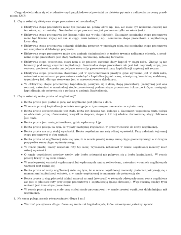 Czego dowiedziałam się od studentów czyli przykładowe odpowiedzi na niektóre pytania z zaliczenia na ocenę przedmiotu EMF: 1. Czym różni się efektywna stopa procentowa od nominalnej? • Efektywna stopa procentowa może być podana na pewny okres np. rok, ale może być naliczona częściej niż ten okres, np. co miesiąc. Nominalna stopa procentowa jest podawana tylko na okres (rok). • Efektywna stopa procentowa jest liczona tylko raz w roku (okresie). Natomiast nominalna stopa procentowa może być liczona więcej niż raz w ciągu roku (okresu) np. nominalna stopa procentowa z kapitalizacją kwartalną. • Efektywna stopa procentowa pokazuje dokładny przyrost w przeciągu roku, zaś nominalna stopa procentowa nie uzmysławia dokładnego przyrostu. • Efektywna stopa procentowa może ulec zmianie (minimalnej) w trakcie trwania naliczania odsetek, a nominalna stopa procentowa jest stałą wartością, narzuconą, ustaloną formalnie. • Efektywna stopa procentowa mówi nam o ile procent wzrośnie dany kapitał w ciągu roku. Znając ją nie bierzemy pod uwagę częstości kapitalizacji. Nominalna stopa procentowa nie jest tak naprawdę stopą procentową, ponieważ wyraża ona jedynie sumę stóp procentowych przy kapitalizacji częstszej niż roczna. • Efektywna stopa procentowa stosowana jest w oprocentowaniu prostym gdyż wyrażana jest w skali roku, natomiast nominalna stopa procentowa może być z kapitalizacją półroczną, miesięczną, kwartalną, codzienną, tygodniową itd., dlatego stosowana jest w oprocentowaniu składanym. • W efektywnej stopie procentowej kapitalizacją pokrywa się z daną stopą procentową (zazwyczaj jest ona roczna), natomiast w nominalnej stopie procentowej podana stopa procentowa i okres po którym następuje kapitalizacja nie pokrywa się z podaną w zadaniu kapitalizacją. 2. Czym różni się renta prosta od uogólnionej? • Renta prosta jest płatna z góry, zaś uogólniona jest płatna z dołu. • W rencie prostej kapitalizacja odsetek następuje w tym samym momencie co wpłata renty. • Renta prosta oprocentowanie jest stałe, renta jest liczona wg. jednego i. Natomiast uogólniona renta polega na obliczeniu jednej równoważnej wszystkim stopom, stopie i. Od tej właśnie równoważnej stopy obliczona jest renta. • Renta prosta jest rentą jednostkową, gdzie wpłacamy 1 jp. • Renta prosta polega na tym, że wpłaty następują regularnie, w przeciwieństwie do renty uogólnionej. • Renta prosta ma raty stałej wysokości. Renta uogólniona ma raty różnej wysokości. Przy założeniu tej samej stopy procentowej w obu rentach. • Renta prosta od uogólnionej różni się tym, że w rencie prostej mamy sumę ciągu geometrycznego a w drugim przypadku sumę ciągu arytmetycznego. • W rencie prostej mamy wszystkie raty tej samej wysokości, natomiast w rencie uogólnionej możemy mieć różnej wysokości. • O rencie uogólnionej mówimy wtedy, gdy liczba płatności nie pokrywa się z liczbą kapitalizacji. W rencie prostej liczby te są sobie równe. • W rencie prostej wartości wypłacanych lub wpłacanych rent są sobie równe, natomiast w rentach uogólnionych wartości rent różnią się. • Renta prosta od renty uogólnionej różni się tym, że w rencie uogólnionej momenty płatności pokrywają się z momentami kapitalizacji odsetek, a w rencie uogólnionej te momenty nie pokrywają się. • Renta prosta to ciąg płatności takimi samymi ratami (równymi) w równych odstępach czasu, renta uogólniona zaś jest to płatność raty przy stopie procentowej z kapitalizacją (jakąś okresową). Więc różnicą między tymi rentami jest inna stopa procentowa. • W rencie prostej raty są stałe przy stałej stopie procentowej i w rencie prostej wynik jest dokładniejszy niż uogólnionej. 3. Na czym polega zasada równoważności długu i rat? • Wartość początkowa długu równa się sumie rat kapitałowych, które zobowiązani jesteśmy spłacić. • Przy określonej stopie procentowej oraz długości spłacania, w pewnym określonym momencie wysokość długu jest taka sama jak rata. • Zasada równoważności długu i rat polega na tym, że przy takich samych wartościach początkowych i ratach otrzymamy takie same wartości końcowe. • Zasada równoważności długu i rat polega na tym, że po zapłaceniu ostatniej raty wartość długu wynosi 0. • Zasada ta polega na równoważności raty kapitałowej oraz odsetek za dług, przez co zadłużenie ani nie wzrasta ani nie maleje. • Zasada równoważności długu i rat polega na tym, że przez określoną liczbę rat musimy spłacić cały kredyt. • Zasada równoważności długu i rat polega na tym, że dług maleje proporcjonalnie jak rata się zwiększa. • Suma wszystkich rat ma spłacać dług, czyli nie może być większa niż dług (ani mniejsza). • Zasada równoważności długu i rat polega na takiej samej wartości początkowej raty i wartości końcowej długu. • Długi są równoważne, gdy ich wartości bieżące danego dnia są równe. • Równoważność długu i rat następuje kiedy w momencie t1 suma pozostałych rat jest równa spłaconym. • Zasada równoważności długu i rat polega na tym, że określone liczby długów i rat, które mają określony moment spłaty zastąpione jednym długiem czy ratą, którego spłata jest określona na konkretny dzień. • Jeżeli dług spłacany jest równymi ratami kapitałowymi, to S = R1 + R2 + . . . + Rk natomiast jeżeli spłacany jest równymi ratami annuitetowymi to dług możemy traktować jako rentę. • Zasada równoważności długu i rat polega na tym, że raty są równej wielkości. • polega na tym, że raty wraz z ustaloną stopą procentową i liczbą rat równoważą się wysokości zaciągniętego długu. 4. Jak się wyznacza dług bieżący metodą retrospektywną? • Polega na oprocentowaniu na moment k pozostałych do zapłacenia rat. • 
