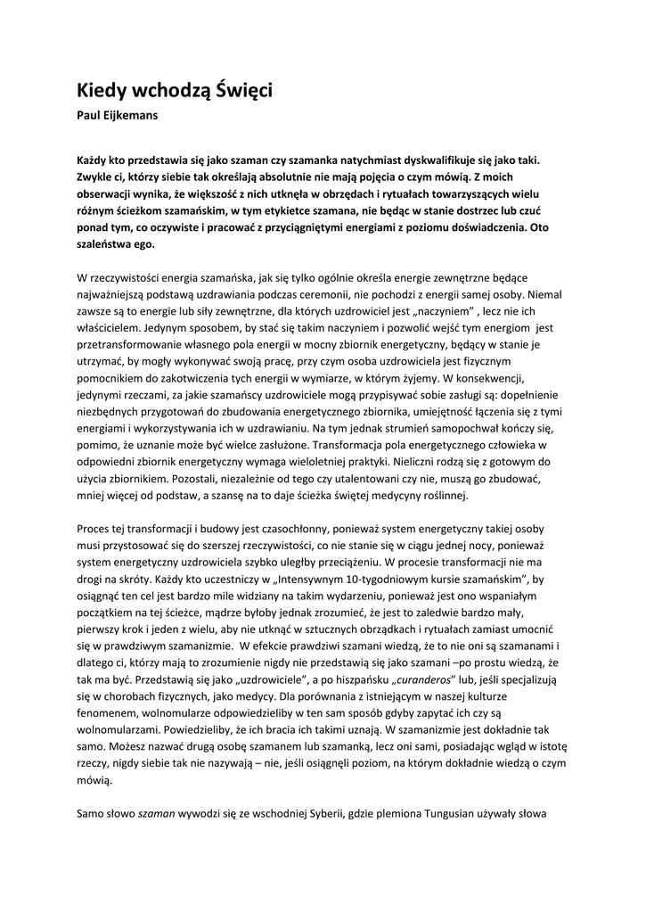 Kiedy wchodzą Święci Paul Eijkemans Każdy kto przedstawia się jako szaman czy szamanka natychmiast dyskwalifikuje się jako taki. Zwykle ci, którzy siebie tak określają absolutnie nie mają pojęcia o czym mówią. Z moich obserwacji wynika, że większość z nich utknęła w obrzędach i rytuałach towarzyszących wielu różnym ścieżkom szamańskim, w tym etykietce szamana, nie będąc w stanie dostrzec lub czuć ponad tym, co oczywiste i pracować z przyciągniętymi energiami z poziomu doświadczenia. Oto szaleństwa ego. W rzeczywistości energia szamańska, jak się tylko ogólnie określa energie zewnętrzne będące najważniejszą podstawą uzdrawiania podczas ceremonii, nie pochodzi z energii samej osoby. Niemal zawsze są to energie lub siły zewnętrzne, dla których uzdrowiciel jest „naczyniem” , lecz nie ich właścicielem. Jedynym sposobem, by stać się takim naczyniem i pozwolić wejść tym energiom jest przetransformowanie własnego pola energii w mocny zbiornik energetyczny, będący w stanie je utrzymać, by mogły wykonywać swoją pracę, przy czym osoba uzdrowiciela jest fizycznym pomocnikiem do zakotwiczenia tych energii w wymiarze, w którym żyjemy. W konsekwencji, jedynymi rzeczami, za jakie szamańscy uzdrowiciele mogą przypisywać sobie zasługi są: dopełnienie niezbędnych przygotowań do zbudowania energetycznego zbiornika, umiejętność łączenia się z tymi energiami i wykorzystywania ich w uzdrawianiu. Na tym jednak strumień samopochwał kończy się, pomimo, że uznanie może być wielce zasłużone. Transformacja pola energetycznego człowieka w odpowiedni zbiornik energetyczny wymaga wieloletniej praktyki. Nieliczni rodzą się z gotowym do użycia zbiornikiem. Pozostali, niezależnie od tego czy utalentowani czy nie, muszą go zbudować, mniej więcej od podstaw, a szansę na to daje ścieżka świętej medycyny roślinnej. Proces tej transformacji i budowy jest czasochłonny, ponieważ system energetyczny takiej osoby musi przystosować się do szerszej rzeczywistości, co nie stanie się w ciągu jednej nocy, ponieważ system energetyczny uzdrowiciela szybko uległby przeciążeniu. W procesie transformacji nie ma drogi na skróty. Każdy kto uczestniczy w „Intensywnym 10-tygodniowym kursie szamańskim”, by osiągnąć ten cel jest bardzo mile widziany na takim wydarzeniu, ponieważ jest ono wspaniałym początkiem na tej ścieżce, mądrze byłoby jednak zrozumieć, że jest to zaledwie bardzo mały, pierwszy krok i jeden z wielu, aby nie utknąć w sztucznych obrządkach i rytuałach zamiast umocnić się w prawdziwym szamanizmie. W efekcie prawdziwi szamani wiedzą, że to nie oni są szamanami i dlatego ci, którzy mają to zrozumienie nigdy nie przedstawią się jako szamani –po prostu wiedzą, że tak ma być. Przedstawią się jako „uzdrowiciele”, a po hiszpańsku „curanderos” lub, jeśli specjalizują się w chorobach fizycznych, jako medycy. Dla porównania z istniejącym w naszej kulturze fenomenem, wolnomularze odpowiedzieliby w ten sam sposób gdyby zapytać ich czy są wolnomularzami. Powiedzieliby, że ich bracia ich takimi uznają. W szamanizmie jest dokładnie tak samo. Możesz nazwać drugą osobę szamanem lub szamanką, lecz oni sami, posiadając wgląd w istotę rzeczy, nigdy siebie tak nie nazywają – nie, jeśli osiągnęli poziom, na którym dokładnie wiedzą o czym mówią. Samo słowo szaman wywodzi się ze wschodniej Syberii, gdzie plemiona Tungusian używały słowa šaman dla wskazania osób potrafiących osiągnąć odmienne stany świadomości, by wchodząc w interakcję ze światem duchów, połączyć się z rzeczywistością energetyczną ponad fizyczną. Praktyka ta sama w sobie nie należy wyłącznie plemienia Tungusian. Jest stara jak świat i można ją spotkać w dowolnym czasie i miejscu, w jakim kiedykolwiek byli ludzie, włącznie z kulturą Szuarów, w której taka osoba nazywana jest Uwishin. Słowo szaman sprowadził do Europy duński odkrywca E. Ysbrants Ides, który w latach 1692-1695, towarzyszył konwojowi ambasady wysłanemu przez cara Piotra Wielkiego. W swojej książce Driejaarige Reize naar China, czyli “Trzyletnia podróż do Chin”, po raz pierwszy opublikowanej w Amsterdamie w 1698 roku, opisuje szamanów z plemienia Tungusian, których nazywa Duivelskonstenaar – artystami diabła. Nie klasyfikuję szamana jako artysty diabła, ale dla mnie najważniejszy jest aspekt dotyczący umiejętności wchodzenia w odmienne stany świadomości i stanie się pewnego rodzaju zbiornikiem, do którego wchodzą wspomagające energie uzdrawiające. Naturalnie, każdy ma prawo do swojej własnej definicji, a moja nie jest lepsza niż czyjaś inna. Radzę jednak unikać tych bardzo szerokich, poszerzonych tak, by można było zawrzeć w niej siebie. Jeśli ktokolwiek chciałby zdefiniować szamana jako osobę wymachującą wiązką gałązek bez żadnych umiejętności połączenia się z nieograniczoną rzeczywistością energetyczną ponad fizyczną, proszę bardzo. Jestem pewien, że posiadasz zdolność wglądu w siebie żeby zdać sobie sprawę, że taka praktyka sama w sobie nie ma nic wspólnego z szamanizmem. Samo stukanie w bęben, wymachiwanie piórami czy nucenie odpowiednich pieśni jest niczym bez ustanowienia namacalnego połączenia z energetyczną rzeczywistością obecną ponad fizyczną. Pierwszą osobą, jaką widziałem posługującą się umiejętnością wchodzenia w odmienne stany świadomości podczas zajęć była uzdrowicielka energetyczna Barbara Brennan. Na pierwszych zajęciach, w których uczestniczyłem w jej szkole w Stanach Zjednoczonych, weszła na scenę, usiadła na krześle, zharmonizowała się, a następnie przywołała energię swojego Wyższego Ja – energięprzewodnika, który w jej przypadku ma na imię Heyoan –„Wiatr Odwiecznie Szepczący Prawdę”. Jak wyjaśniła na jednych ze swoich zajęć, jest to związana z ni