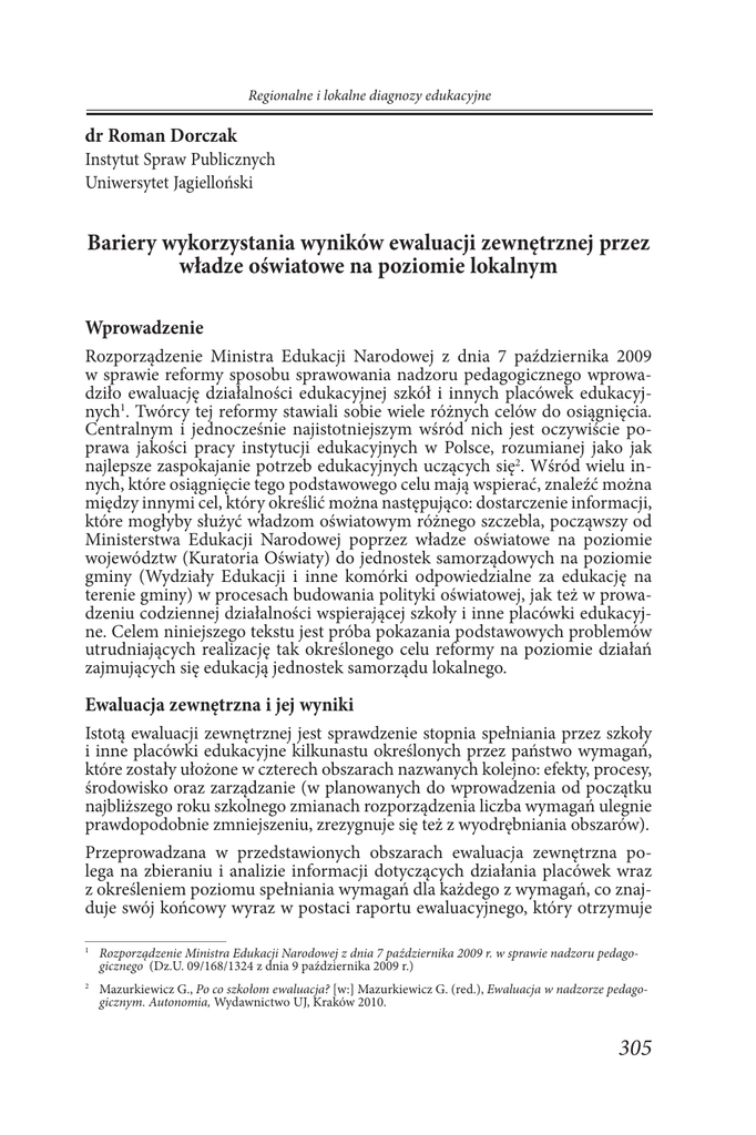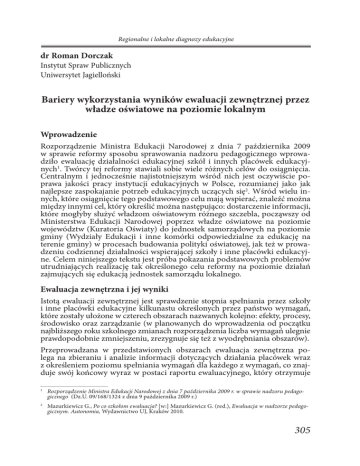 Regionalne i lokalne diagnozy edukacyjne dr Roman Dorczak Instytut Spraw Publicznych Uniwersytet Jagielloński Bariery wykorzystania wyników ewaluacji zewnętrznej przez władze oświatowe na poziomie lokalnym Wprowadzenie Rozporządzenie Ministra Edukacji Narodowej z dnia 7 października 2009 w sprawie reformy sposobu sprawowania nadzoru pedagogicznego wprowadziło ewaluację działalności edukacyjnej szkół i innych placówek edukacyjnych1. Twórcy tej reformy stawiali sobie wiele różnych celów do osiągnięcia. Centralnym i jednocześnie najistotniejszym wśród nich jest oczywiście poprawa jakości pracy instytucji edukacyjnych w Polsce, rozumianej jako jak najlepsze zaspokajanie potrzeb edukacyjnych uczących się2. Wśród wielu innych, które osiągnięcie tego podstawowego celu mają wspierać, znaleźć można między innymi cel, który określić można następująco: dostarczenie informacji, które mogłyby służyć władzom oświatowym różnego szczebla, począwszy od Ministerstwa Edukacji Narodowej poprzez władze oświatowe na poziomie województw (Kuratoria Oświaty) do jednostek samorządowych na poziomie gminy (Wydziały Edukacji i inne komórki odpowiedzialne za edukację na terenie gminy) w procesach budowania polityki oświatowej, jak też w prowadzeniu codziennej działalności wspierającej szkoły i inne placówki edukacyjne. Celem niniejszego tekstu jest próba pokazania podstawowych problemów utrudniających realizację tak określonego celu reformy na poziomie działań zajmujących się edukacją jednostek samorządu lokalnego. Ewaluacja zewnętrzna i jej wyniki Istotą ewaluacji zewnętrznej jest sprawdzenie stopnia spełniania przez szkoły i inne placówki edukacyjne kilkunastu określonych przez państwo wymagań, które zostały ułożone w czterech obszarach nazwanych kolejno: efekty, procesy, środowisko oraz zarządzanie (w planowanych do wprowadzenia od początku najbliższego roku szkolnego zmianach rozporządzenia liczba wymagań ulegnie prawdopodobnie zmniejszeniu, zrezygnuje się też z wyodrębniania obszarów). Przeprowadzana w przedstawionych obszarach ewaluacja zewnętrzna polega na zbieraniu i analizie informacji dotyczących działania placówek wraz z określeniem poziomu spełniania wymagań dla każdego z wymagań, co znajduje swój końcowy wyraz w postaci raportu ewaluacyjnego, który otrzymuje Rozporządzenie Ministra Edukacji Narodowej z dnia 7 października 2009 r. w sprawie nadzoru pedagogicznego (Dz.U. 09/168/1324 z dnia 9 października 2009 r.) 1 Mazurkiewicz G., Po co szkołom ewaluacja? [w:] Mazurkiewicz G. (red.), Ewaluacja w nadzorze pedagogicznym. Autonomia, Wydawnictwo UJ, Kraków 2010. 2 305 XVIII Konferencja Diagnostyki Edukacyjnej, Wrocław 2012 placówka poddana ewaluacji oraz odpowiedni organ prowadzący. W raporcie tym zawarte są analizy zebranych w trakcie ewaluacji danych dla każdego z wymagań, komentarz do zebranych danych wraz z określeniem poziomu spełniania wymagania. Zawiera on też podstawowe dane o placówce i opis jej sytuacji. Raporty ewaluacyjne, w przedstawionej wyżej postaci, zamieszczane są też na ogólnodostępnej platformie elektronicznej3. Od początku prowadzenia ewaluacji w całej Polsce przeprowadzono 4750 ewaluacji zakończonych przedstawieniem raportu ewaluacyjnego i ich liczba coraz szybciej rośnie, gdyż stale zwiększa się grupa przeszkolonych wizytatorów do spraw ewaluacji w Kuratoriach Oświaty4. Liczby te przekonują, że zawarte w raportach dane mogą być i powinny bardzo istotnym źródłem informacji przy kształtowaniu polityki oświatowej i bieżącym podejmowaniu decyzji przez władze oświatowe różnego szczebla, w tym w szczególności przez organy prowadzące szkół i innych placówek edukacyjnych. Polityka oświatowa i lokalna polityka oświatowa Politykę oświatową najprościej można określić tak, jak zrobił to Dobromir Dziewulak, czyli jako: „dokonywanie wyboru i podejmowanie decyzji w sprawach celu, kierunku, treści i organizacji oświaty oraz wychowania, a także planowanie działalności oświatowo-wychowawczej”5. Polityka oświatowa na poziomie krajowym (oczywiście też na kolejnych poziomach aż do poziomu samorządu lokalnego włącznie), określona jest przez Ustawę z dnia 7 września 1991 r. o systemie oświaty6. Polski system oświaty zapewniać ma zgodnie z nią: 1. respektowanie praw obywatelskich (np. prawo do kształcenia, dokształcania; zmniejszanie różnic w warunkach kształcenia), 2. wspomaganie wychowawczej roli rodziny, 3. zapewnienie struktury organizacyjnej oświaty, 4. nowoczesny zakres treści kształcenia, 5. tworzenie warunków kształcenia (w tym dla dzieci o różnych poziomach uzdolnień i niepełnosprawności oraz różnych sytuacjach socjalnych). Jak zwraca uwagę Aleksander Noworól, istotną cechą systemu edukacyjnego w Polsce, wynikającą z przeświadczenia, że na szczeblu lokalnym lepiej można określić potrzeby edukacyjne, jest zasada świadczenia usług edukacyjnych przez samorząd lokalny7. Wśród głównych jego zadań w dziedzinie edukacji można wyróżnić następujące: 1. określanie sieci placówek edukacyjnych, 2. kontrola spełniania obowiązku szkolnego, Mazurkiewicz, G., Berdzik, J., Modernizowanie nadzoru pedagogicznego: Ewaluacja jako podstawowa strategia rozwoju edukacji [w:] Mazurkiewicz, G. (red.), Ewaluacja w nadzorze pedagogicznym. Konteksty, Wydawnictwo UJ, Kraków 2010. 3 www.platforma.npseo.pl/stats.php, [dostęp: 25.07. 2012] 4 Dziewulak D., Systemy szkolne Unii Europejskiej, Wydawnictwo Żak, Warszawa 1997, s. 11. 5 Ustawa o systemie oświaty z dnia 7 września 1991 r. (Dz. U. 07/95/425 z późn. zm.) 6 Noworól A., Jak czytać raport z ewaluacji zewnętrznej szkoły lub placówki edukacyjnej[ w:] Mazurkiewicz G. (red.), Jakość edukacji. Różnorodne perspektywy, Wydawnictwo UJ, Kraków 2012, s. 374-388. 7 306 Regionalne i lokalne diagnozy edukacyjne 3. współpraca z organe