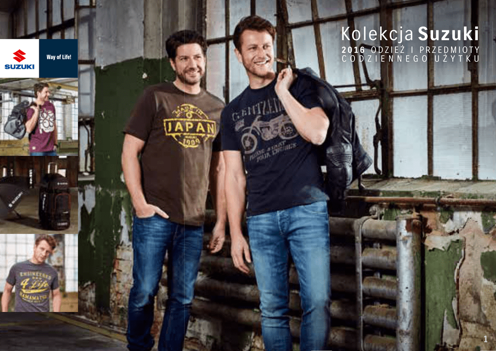 Kolekcja Suzuki 2016 ODZIEŻ I PRZEDMIOTY CODZIENNEGO UŻYTKU 1 1 ZUPEŁNIE NOWA. KOLEKCJA SUZUKI 2016. NARESZCIE JEST: ZUPEŁNIE NOWA KOLEKCJA SUZUKI. INSPIROWANA FASCYNACJĄ WIELKĄ MARKĄ, DUCHEM GLOBALNEJ SPOŁECZNOŚCI I JEDNYM Z NAJPIĘKNIEJSZYCH DOZNAŃ – PRZYJEMNOŚCIĄ JAZDY. Nie trzeba chyba dodawać, że tu nie ma miejsca na jakikolwiek kompromis. To nie przypadek, że każdy ze starannie wyselekcjonowanych artykułów opatrzony jest specjalnym znakiem jakości: logo Suzuki. A zatem nie ma co zwlekać. Pokaż światu, co Cię kręci. 04 | MODA I DZIEDZICTWO 28 | VITARA Lubisz szybkość, jesteś za pan brat ze wszystkimi torami wyścigowymi i każdą swoją cząstką czujesz się fanem Suzuki? A zatem jesteś we właściwym miejscu. WIWAT VITARA! Suzuki Vitara symbolizuje niezwykłą radość życia, której możesz doświadczać nawet z dala od szosy. 12 | MIEJSKA KLASYKA Oto nowa, klasyczna linia miejska. Ekstra stylistyka i ekstra materiały dla ekstra osób. 16 | KOLEKCJA KEVINA SCHWANTZA Nazwisko, które jest marką. I inspiracją dla każdego entuzjasty wyścigów. 30 | V-STROM Wciąż zbyt mało V-Stroma? Tu znajdziesz więcej. 32 | JAZDA Nie ma czegoś takiego jak zła pogoda, jeśli się ma odpowiedni strój. 18 | DZIECI Pragniesz, aby Twoje latorośle pokazały dobry smak? Mamy właśnie to, czego szukasz. 20 | PRZEDMIOTY CODZIENNEGO UŻYTKU Każdy, kto jeździ Suzuki, zna zalety naszej marki. I dlatego obdarza ją pełnym zaufaniem także w innych obszarach swojego życia. 2 3 LUBISZ SZYBKOŚĆ, JESTEŚ ZA PAN BRAT ZE WSZYSTKIMI TORAMI WYŚCIGOWYMI I KAŻDĄ SWOJĄ CZĄSTKĄ CZUJESZ SIĘ FANEM SUZUKI? A ZATEM JESTEŚ RÓWNIE SZALONY JAK MY I TRAFIŁEŚ WE WŁAŚCIWE MIEJSCE. POZOSTAŁO ODPOWIEDNIO SIĘ UBRAĆ. NOWE WZORY KOSZULEK, BLUZ I CZAPEK, KTÓRE OFERUJĄ COŚ ZNACZNIE WIĘCEJ NIŻ MATERIAŁ, Z KTÓREGO SĄ WYKONANE. DLA CIEBIE WYRAŻAJĄ COŚ SPECJALNEGO I WŁĄCZAJĄ CIĘ DO WIELKIEJ RODZINY. POKAŻ, CO CI W DUSZY GRA – ZA POMOCĄ NASZYCH FAWORYTÓW SEZONU. 04 MODA I DZIEDZICTWO 5 BLUZA Z KAPTUREM „HAMAMATSU” Czarna bluza „Hamamatsu” z kapturem, czarno-czerwony nadruk, dwuwarstwowy kaptur. 80% bawełna, 20% poliester. S/M/L/XL/XXL 990F0-FHM03-rozmiar KOSZULKA „HAMAMATSU” KOSZULKA „GENTLEMEN” KOSZULKA „RIDE FAST” KOSZULKA „GSX-S 1000” Czarna koszulka „Hamamatsu” z czerwonym i białym nadrukiem może stać się Twoim codziennym towarzyszem. 100% bawełna. S/M/L/XL/XXL 990F0-FTS15-rozmiar Ciemnoszara z brązowym nadrukiem i paskiem w części szyjnej, stylizowany odręczny szkic krosowca Suzuki z lat 70., bardzo miękka w dotyku. 100% bawełna. S/M/L/XL/XXL 990F0-FTS17-rozmiar Czerwona koszulka z białym nadrukiem i paskiem w części szyjnej. 100% bawełna. S/M/L/XL/XXL 990F0-FTS18-rozmiar Czarna koszulka z białym zarysem motocykla GSX-S1000. 100% bawełna. S/M/L/XL/XXL 990F0-GSTS2-rozmiar BLUZA Z KAPTUREM „ISLE OF MAN” Szara bluza „Isle of Man” z kapturem, z podszewką w kratę typu tartan (tylko kaptur), upamiętniająca zwycięstwo Ernsta Degnera w wyścigu TT na wyspie Man w 1962 roku oraz zdobycie przez niego mistrzostwa świata w klasie 50 cm3 w barwach Suzuki. 80% bawełna, 20% poliester. S/M/L/XL/XXL 990F0-HHM01-rozmiar 6 KOSZULKA „ISLE OF MAN” KOSZULKA „MADE IN JAPAN” KOSZULKA „GSX1100S KATANA” KOSZULKA SWOOSH Koszulka „Isle of Man” w tonacji brązowego melanżu, wzór retro, doskonale pasuje do bluzy z kapturem Isle of Man. 65% bawełna, 35% poliester. S/M/L/XL/XXL 990F0-HTS11-rozmiar Ciemnobrązowa koszulka z żółtym nadrukiem i paskiem w części szyjnej. Stamtąd to wszystko się wywodzi – od 1909 roku. 100% bawełna. S/M/L/XL/XXL 990F0-FTS21-rozmiar Koszulka retro w kolorze szarego melanżu, stylowy ubiór nie tylko dla posiadaczy i fanów jednegoz najbardziej legendarnych motocykli, jakie kiedykolwiek powstały. 100% bawełna. S/M/L/XL/XXL 990F0-HTS13-rozmiar Koszulka w tonacji szarego melanżu z ładnym wielokolorowym nadrukiem i czerwonym paskiem w części szyjnej. 50% bawełna, 50% poliester. S/M/L/XL/XXL 990F0-FTS20-rozmiar 7 KOSZULKA DAMSKA „ENGINEERED4LIFE” CZARNA Czarno-różowa wersja damskiej koszulki „Engineered4Life”. 100% bawełna. XS/S/M/L/XL 990F0-FTL05-rozmiar KOSZULKA GSX-R RETRO Biała koszulka GSX-R retro, z aplikacją wyścigową w trzech odcieniach niebieskiego, ponadczasowy rarytas dla fana GSX-R. 100% bawełna. S/M/L/XL/XXL 990F0-HTS12-rozmiar SWETER DAMSKI „HAMAMATSU” Modny sweter z aplikacjami z czerwonej podszewki, białe ściągacze, czerwono-biały nadruk. 80% bawełna, 20% poliester. XS/S/M/L/XL 990F0-FSL01-rozmiar BLUZA GSX-R RETRO Klasyczna niebiesko-biała bluza GSX-R retro, swymi barwami odzwierciedlająca ponadtrzydziestoletnią dominację tego modelu w wyścigach na torach całego świata, z wysokiej jakości naszywkami, haftami i nadrukami, 2 kieszenie. 80% bawełna, 20% poliester. S/M/L/XL/XXL 990F0-HGRJ1-rozmiar 8 KOSZULKA DAMSKA „HAMAMATSU” KOSZULKA Z MOTYWEM DEKORACYJNYM ZBIORNIKA PALIWA TM250 Biała, z zielonym wzorem inspirowanym motywem umieszczonym na zbiorniku paliwa mistrzowskiego modelu motocykla krosowego TM250 z 1974 roku. 100% bawełna. S/M/L/XL/XXL 990F0-HTS03-rozmiar Biała, modna koszula damska z estetycznym, czerwono-czarnym nadrukiem oraz aplikacją w formie serca wykonaną z imitacji diamentów, dodatkowe aplikacje na ramionach/rękawach. 100% wiskoza. XS/S/M/L/XL 990F0-FTL07-rozmiar KOSZULKA DAMSKA „ENGINEERED4LIFE” NIEBIESKA Jasnoniebiesko-biała wersja damskiej koszulki „Engineered4Life”. 100% bawełna. XS/S/M/L/XL 990F0-FTL06-rozmiar 9 10 KOSZULA Z DŁUGIM RĘKAWEM „SPIRITED” KOSZULKA „ENGINEERED4LIFE” CZERWONA KOSZULKA „ENGINEERED4LIFE” SZARY MELANŻ KOSZULKA „ENGINEERED4LIFE” SZARA SWETER SKANDINAVIAN Ciemnoniebieska koszula „Spirited” z długim rękawem, wyściółką na łokciach i czerwonym, kontrastowym szwem, nadrukami oraz naszywką japońskiej formuły 1. 100% bawełna. S/M/
