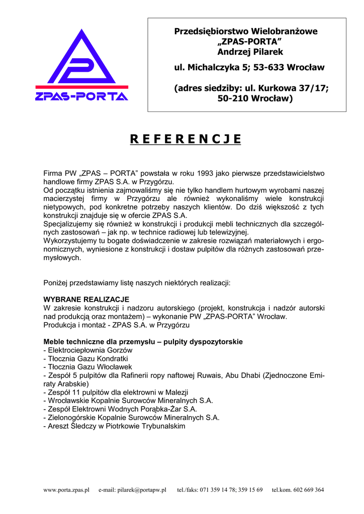 Przedsiębiorstwo WielobranŜowe „ZPAS-PORTA” Andrzej Pilarek ul. Michalczyka 5; 53-633 Wrocław (adres siedziby: ul. Kurkowa 37/17; 50-210 Wrocław) REFERENCJE Firma PW „ZPAS – PORTA” powstała w roku 1993 jako pierwsze przedstawicielstwo handlowe firmy ZPAS S.A. w Przygórzu. Od początku istnienia zajmowaliśmy się nie tylko handlem hurtowym wyrobami naszej macierzystej firmy w Przygórzu ale równieŜ wykonaliśmy wiele konstrukcji nietypowych, pod konkretne potrzeby naszych klientów. Do dziś większość z tych konstrukcji znajduje się w ofercie ZPAS S.A. Specjalizujemy się równieŜ w konstrukcji i produkcji mebli technicznych dla szczególnych zastosowań – jak np. w technice radiowej lub telewizyjnej. Wykorzystujemy tu bogate doświadczenie w zakresie rozwiązań materiałowych i ergonomicznych, wyniesione z konstrukcji i dostaw pulpitów dla róŜnych zastosowań przemysłowych. PoniŜej przedstawiamy listę naszych niektórych realizacji: WYBRANE REALIZACJE W zakresie konstrukcji i nadzoru autorskiego (projekt, konstrukcja i nadzór autorski nad produkcją oraz montaŜem) – wykonanie PW „ZPAS-PORTA” Wrocław. Produkcja i montaŜ - ZPAS S.A. w Przygórzu Meble techniczne dla przemysłu – pulpity dyspozytorskie - Elektrociepłownia Gorzów - Tłocznia Gazu Kondratki - Tłocznia Gazu Włocławek - Zespół 5 pulpitów dla Rafinerii ropy naftowej Ruwais, Abu Dhabi (Zjednoczone Emiraty Arabskie) - Zespół 11 pulpitów dla elektrowni w Malezji - Wrocławskie Kopalnie Surowców Mineralnych S.A. - Zespół Elektrowni Wodnych Porąbka-śar S.A. - Zielonogórskie Kopalnie Surowców Mineralnych S.A. - Areszt Śledczy w Piotrkowie Trybunalskim www.porta.zpas.pl e-mail: [email protected] tel./faks: 071 359 14 78; 359 15 69 tel.kom. 602 669 364 Meble techniczne dla radia i telewizji Zespół czterech mebli: - Stół studyjny - Konsola MW - Stolik fonii - Stojak na monitory dla Telewizji Polskiej S.A. Oddział we Wrocławiu REALIZACJE SAMODZIELNE – „ZPAS-PORTA” (Projekt, konstrukcja, wykonanie i montaŜ na obiekcie) Meble techniczne dla przemysłu – pulpity dyspozytorskie - Convert Laboratories – Kopalnia Miedzi Lubin - ElektromontaŜ Wrocław – KGHM Legnica - ElektromontaŜ Wrocław – Kopalnia Miedzi Rudna - Elektro - Tim Wrocław – KGHM Legnica Meble techniczne dla radia i telewizji Zestaw czterech mebli studyjnych dla Polskiego Radia we Wrocławiu - Pulpit reŜyserski - Pulpit studyjny - Pulpit w pokoju aparatury - Pulpit producenta Zestaw trzech mebli technicznych dla Radia Zachód w Zielonej Górze - Pulpit realizatora - Pulpit spikerski - Szafka socjalna Zestaw dla TVP3 w Warszawie – dostawa via Firma TESS Poland - Pulpit studyjny - Stojak na monitory Zestaw dla Telewizji Polsat w Warszawie – dostawa via Firma TESS Poland - Dwa pulpity studyjne Dostawa bezpośrednia dla Telewizji Polsat w Warszawie - Pulpit pomiarowy - Pulpit Ingest - Pulpit emisyjny Zestaw pulpitów dla Telewizji Puls w Warszawie - Master Control - Camera Control - Control Room News - Ingest - Production Studio - 2 pulpity pomocnicze Zestaw dla TVP3 we Wrocławiu - Pulpit studyjny - Stojak na monitory www.porta.zpas.pl e-mail: [email protected] tel./faks: 071 359 14 78; 359 15 69 tel.kom. 602 669 364 Załączamy skany dwóch listów referencyjnych oraz galerie zdjęć mebli technicznych. O dodatkowe oceny naszej firmy moŜna dowiedzieć się u: Pana inŜ. Andrzeja Słomki Pana inŜ. Mirosława Ostrowskiego Pana inŜ. Krzysztofa Raszowskiego Pana inŜ. Pawła Oleksińskiego Pana inŜ. Marka Grzywnowicza Pana inŜ. Macieja Kapkowskiego www.porta.zpas.pl e-mail: [email protected] – w Radiu Zachód – w Radiu Wrocław – w Telewizji Wrocław – w Firmie TESS Poland – w Telewizji Polsat – w Telewizji Puls tel./faks: 071 359 14 78; 359 15 69 tel.kom. 602 669 364 z powaŜaniem Andrzej Pilarek www.porta.zpas.pl e-mail: [email protected] tel./faks: 071 359 14 78; 359 15 69 tel.kom. 602 669 364