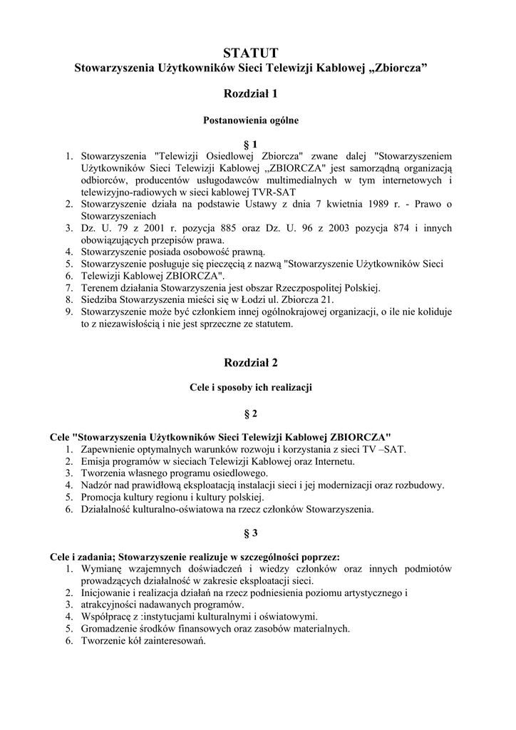 STATUT Stowarzyszenia Użytkowników Sieci Telewizji Kablowej „Zbiorcza” Rozdział 1 Postanowienia ogólne 1. 2. 3. 4. 5. 6. 7. 8. 9. §1 Stowarzyszenia "Telewizji Osiedlowej Zbiorcza" zwane dalej "Stowarzyszeniem Użytkowników Sieci Telewizji Kablowej ,,ZBIORCZA" jest samorządną organizacją odbiorców, producentów usługodawców multimedialnych w tym internetowych i telewizyjno-radiowych w sieci kablowej TVR-SAT Stowarzyszenie działa na podstawie Ustawy z dnia 7 kwietnia 1989 r. - Prawo o Stowarzyszeniach Dz. U. 79 z 2001 r. pozycja 885 oraz Dz. U. 96 z 2003 pozycja 874 i innych obowiązujących przepisów prawa. Stowarzyszenie posiada osobowość prawną. Stowarzyszenie posługuje się pieczęcią z nazwą "Stowarzyszenie Użytkowników Sieci Telewizji Kablowej ZBIORCZA". Terenem działania Stowarzyszenia jest obszar Rzeczpospolitej Polskiej. Siedziba Stowarzyszenia mieści się w Łodzi ul. Zbiorcza 21. Stowarzyszenie może być członkiem innej ogólnokrajowej organizacji, o ile nie koliduje to z niezawisłością i nie jest sprzeczne ze statutem. Rozdział 2 Cele i sposoby ich realizacji §2 Cele "Stowarzyszenia Użytkowników Sieci Telewizji Kablowej ZBIORCZA" 1. Zapewnienie optymalnych warunków rozwoju i korzystania z sieci TV –SAT. 2. Emisja programów w sieciach Telewizji Kablowej oraz Internetu. 3. Tworzenia własnego programu osiedlowego. 4. Nadzór nad prawidłową eksploatacją instalacji sieci i jej modernizacji oraz rozbudowy. 5. Promocja kultury regionu i kultury polskiej. 6. Działalność kulturalno-oświatowa na rzecz członków Stowarzyszenia. §3 Cele i zadania; Stowarzyszenie realizuje w szczególności poprzez: 1. Wymianę wzajemnych doświadczeń i wiedzy członków oraz innych podmiotów prowadzących działalność w zakresie eksploatacji sieci. 2. Inicjowanie i realizacja działań na rzecz podniesienia poziomu artystycznego i 3. atrakcyjności nadawanych programów. 4. Współpracę z :instytucjami kulturalnymi i oświatowymi. 5. Gromadzenie środków finansowych oraz zasobów materialnych. 6. Tworzenie kół zainteresowań. 7. Organizowanie spotkań i imprez kulturalnych, oświatowych, turystycznych, sportowych dla członków Stowarzyszenia Użytkowników Sieci Telewizji Kablowej „Zbiorcza”. Rozdział 3 Członkowie, ich prawa i obowiązki §4 1. Członkowie Stowarzyszenia dzielną się na: a/ członków zwyczajnych b/ członków wspierających 2. Członkiem zwyczajnym Stowarzyszenia może być osoba fizyczna, posiadająca pełną zdolność do czynności prawnych, nie pozbawiona praw publicznych, która popiera cele Stowarzyszenia oraz deklaruje chęć ich wspierania. 3. Członkiem wspierającym Stowarzyszenie może być osoba prawna, wspierająca Stowarzyszenie finansowo, organizacyjnie, sprzętowo lub w inny zadeklarowany sposób. §5 1. Nabycie członkostwa następuje po złożeniu deklaracji członkowskiej (umowy) i wpłaceniu wpisowego. 2. W razie ubiegania się o ponowne przyjęcie w poczet członków Stowarzyszenia, przyjęcie następuje po złożeniu nowej deklaracji członkowskiej (umowy) oraz ponownym wpłaceniu wpisowego, ustalonego przez Zarząd Stowarzyszenia. 3. Obowiązujących opłat nie wnosi pełnoletni członek rodziny wstępujący do Stowarzyszenia w miejsce dotychczasowego członka, zamieszkującego ten sam lokal. §6 Członkostwo w Stowarzyszeniu wygasa przez: a/ rozwiązanie Stowarzyszenia b/ wystąpienie członka ze Stowarzyszenia c/ pozbawienie członkostwa d/ śmierć §7 Pozbawienie członkostwa może nastąpić Uchwałą Zarządu Stowarzyszenia w razie rażącego naruszenia postanowień Statutu lub uchwały władz Stowarzyszenia albo nieopłacenia składek członkowskich przez jeden okres kwartalny lub szkodzenie, niegodne zachowanie członka, godzące w dobre imię Stowarzyszenia. §8 Od Uchwały Zarządu o pozbawieniu z członkostwa służy odwołanie do Zebrania Delegatów Stowarzyszenia w terminie 14 dni od daty doręczenia członkowi odpisu uchwały. Odwołanie podlega rozpatrzeniu na najbliższym Zebraniu Delegatów Stowarzyszenia. §9 Utrata członkostwa powoduje utratę wszelkich praw członka Stowarzyszenia oraz pozbawia możliwości odbioru programów TV –SAT i Internetu. § 10 Członkowie, którzy wystąpili ze Stowarzyszenia lub zostali pozbawieni członkostwa, mogą ubiegać się o ponowne przyjęcie po poprzednim uregulowaniu składek członkowskich zaległych na dzień ustania członkostwa. § 11 Członkowie Stowarzyszenia mają prawo: 1. Wybierać i być wybieranym do władz Stowarzyszenia, Członek wspierający posiada wszystkie prawa członka zwyczajnego, z wyjątkiem czynnego i biernego prawa wyborczego, 2. Korzystać z odbioru pakietów programów nadawanych w sieci telewizji kablowej, 3. Uczestniczyć w tworzeniu i realizacji programów telewizji kablowej, 4. Uczestniczyć w pracach społecznych Stowarzyszenia, 5. Organizować i brać udział w imprezach kulturalnych, turystycznych i sportowych, a także 6. uczestniczyć w pracach kół zainteresowań tworzonych. przez Stowarzyszenie, 7. Zgłaszać występujące zakłócenia w odbiorze programów TV -SA T i Internetu. § 12 Członkowie Stowarzyszenia zobowiązani są do: 1. Przestrzegania postanowień Statutu, Uchwał władz Stowarzyszenia oraz regulaminu Stowarzyszenia, 2. Dbania o interesy Stowarzyszenia i działanie na jego rzecz, 3. Dbania o majątek Stowarzyszenia, a szczególności o stan sieci kablowej i internetowej w budynku 4. Terminowe płacenie obowiązujących opłat (wpisowego i składek członkowskich). § 13 W przypadku niezapłacenia obowiązujących w Stowarzyszeniu wpisowego i składek prze+ okres dwóch miesięcy, prawa członka zostają zawieszone do czasu spłaty zadłużenia, nie dłużej jednak niż jeden kwartał, gdyż po upływie tego okresu następuje pozbawienie członkostwa. Rozdział 4 Władze Stowarzyszenia § 14 1. Władzami Stowarzyszenia są: a/ Walne Zebranie Członków / Walne Zebranie Delegatów b/ Zarzą
