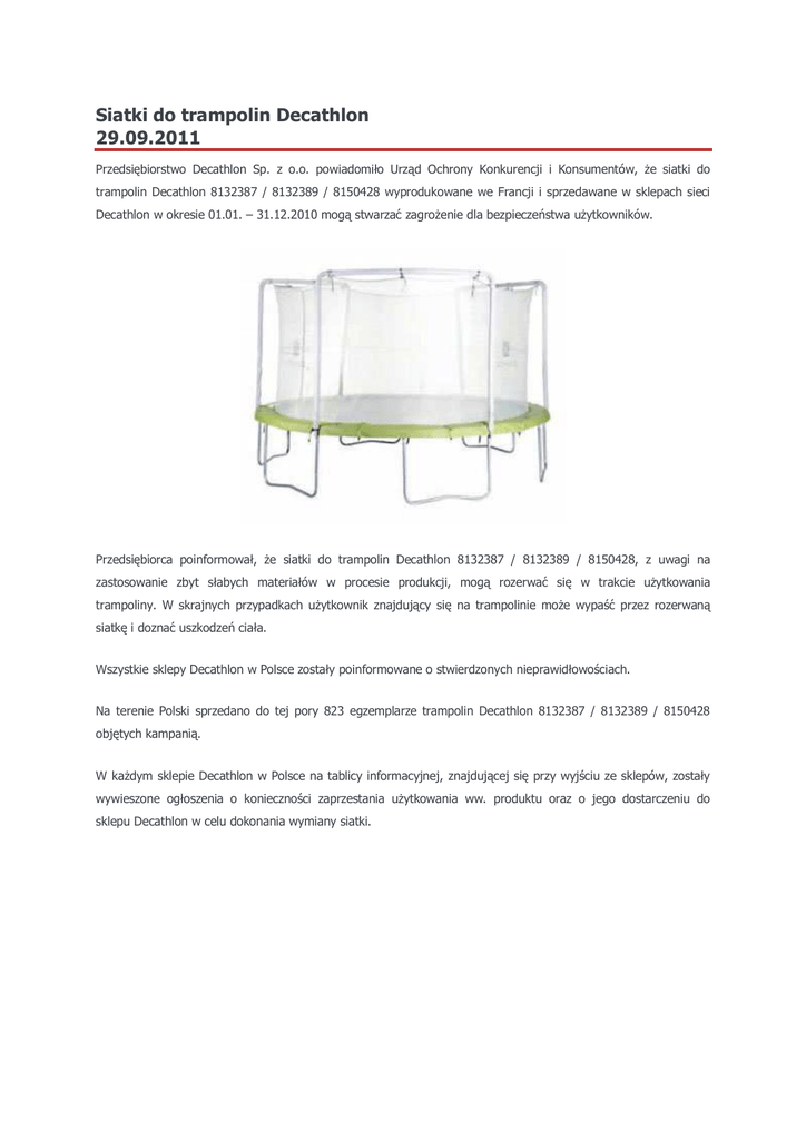 Siatki do trampolin Decathlon 29.09.2011 Przedsiębiorstwo Decathlon Sp. z o.o. powiadomiło Urząd Ochrony Konkurencji i Konsumentów, Ŝe siatki do trampolin Decathlon 8132387 / 8132389 / 8150428 wyprodukowane we Francji i sprzedawane w sklepach sieci Decathlon w okresie 01.01. – 31.12.2010 mogą stwarzać zagroŜenie dla bezpieczeństwa uŜytkowników. Przedsiębiorca poinformował, Ŝe siatki do trampolin Decathlon 8132387 / 8132389 / 8150428, z uwagi na zastosowanie zbyt słabych materiałów w procesie produkcji, mogą rozerwać się w trakcie uŜytkowania trampoliny. W skrajnych przypadkach uŜytkownik znajdujący się na trampolinie moŜe wypaść przez rozerwaną siatkę i doznać uszkodzeń ciała. Wszystkie sklepy Decathlon w Polsce zostały poinformowane o stwierdzonych nieprawidłowościach. Na terenie Polski sprzedano do tej pory 823 egzemplarze trampolin Decathlon 8132387 / 8132389 / 8150428 objętych kampanią. W kaŜdym sklepie Decathlon w Polsce na tablicy informacyjnej, znajdującej się przy wyjściu ze sklepów, zostały wywieszone ogłoszenia o konieczności zaprzestania uŜytkowania ww. produktu oraz o jego dostarczeniu do sklepu Decathlon w celu dokonania wymiany siatki.