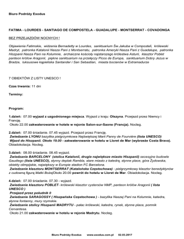 Biuro Podróży Exodus FATIMA - LOURDES - SANTIAGO DE COMPOSTELA - GUADALUPE - MONTSERRAT - COVADONGA BEZ PRZEJAZDÓW NOCNYCH ! Objawienia Fatimskie, widzenia Bernadetty w Lourdes, sanktuarium Św.Jakuba w Composteli, królewski Madryt, patronka Katalonii Nasza Pani z Montserratu, patronka Ameryki Nasza Pani z Guadalupe, patronka Hiszpanii Nasza Pani na Kolumnie, archaiczne kościoły najstarszego królestwa Asturii, klasztor Poblet panteon królow Aragonii, piękne sanktuarium na przełęczy Picos de Europa, sanktuarium Dobry Jezus w Bradze, luksusowe kąpieliska Santander i San Sebastian, miasta bocianów w Extramadurze 7 OBIEKTÓW Z LISTY UNESCO ! Czas trwania: 11 dni Terminy: Program: 1.dzień: 07.00 wyjazd z uzgodnionego miejsca. Wyjazd z kraju: Olszyna. Przejazd przez Niemcy i Francję. Około 22.00 zakwaterowanie w hotele w rejonie Salon-sur-Saone (Francja). Nocleg. 2.dzień: 07.00 śniadanie. 07.45 wyjazd. Przejazd przez Francję. Zwiedzanie LYONU bazylika pielgrzymkowa Najświętszej Marii Panny de Fourviére (lista UNESCO) Wjazd do Hiszpanii. Około 19.00 - zakwaterowanie w hotelu w Lloret de Mar (wybrzeże Costa Brava). Obiadokolacja. Nocleg. 3.dzień: 08.00 śniadanie. 08.45 wyjazd. Zwiedzanie BARCELONY (stolica Katalonii, drugie największe miasto Hiszpanii) secesyjne budowle Gaudiego (lista UNESCO), słynny deptak Rambla, stare miasto z katedrą, słynne place, góra Żydowska, obiekty olimpijskie, największy w Europie stadion FC Barcelona. Zwiedzanie klasztoru MONTSERRAT (Katalońska Częstochowa) - pielgrzymkowy klasztor benedyktynów z cudowną figurą Matki BożejOkoło 20.00 powrót do hotelu w Lloret de Mar. Obiadokolacja. Nocleg. 4.dzień: 07.00 śniadanie. 07.30 - wyjazd. Zwiedzanie klasztoru POBLET- królewski klasztor cystersów NMP, panteon królów Aragonii ( lista UNESCO ) Przejazd przez południk 0 Zwiedzanie SARAGOSSY ( Hiszpańska Częstochowa ) - bazylika Naszej Pani na Kolumnie, katedra, słynne fontanny, mury rzymskie. Zwiedzanie stolicy Hiszpanii MADRYTU - pałac królewski, katedra, rynek, słynne place, pomnik Cervantesa. Około 21.00 zakwaterowanie w hotelu w rejonie Madrytu. Nocleg. Biuro Podróży Exodus www.exodus.com.pl 02.03.2017 5.dzień: 07.00 śniadanie. 07.45 - wyjazd. Zwiedzanie GUADALUPE pielgrzymkowy królewski klasztorsanktuarium z cudowną figurą Matki Bożej z Guadalupe ( lista UNESCO ) Przejazd przez EKSTRAMADURĘ, krainę tysięcy bocianów Wjazd do Portugalii. Około 20.30 zakwaterowanie w hotelu w Fatimie. Obiadokolacja. Nocleg. 6.dzień: 07.00 śniadanie. 07.45 - wyjazd. Zwiedzanie FATIMY, sanktuarium maryjnego, słynnego miejsca pielgrzymkowego - bazylika, plac pielgrzymi, kaplica Objawień, pamiątkarski dom towarowy. Około 20.00 powrót do hotelu w Fatimie. Obiadokolacja. Możliwość udziału w nocnej procesji ze świecami Nocleg. 7.dzień: 07.00 śniadanie. 07.45 wyjazd. Zwiedzanie PORTO, drugiego największego miasta Portugalii (lista UNESCO) romańska katedra, stare miasto, mosty na rzece Douro. Przystanek przy sanktuarium Bon Jesus w BRADZE, siedzibie głowy kościoła zwiedzanie uroczego miejsca pielgrzymkowego. Wjazd do Hiszpanii. Przejazd przez VIGO - duży port nad Atlantykiem. Zwiedzanie PADRON miejsce gdzie wylądowała łódź ze zwłokami Św.Jakuba. Około 20.00 zakwaterowanie w hotelu w Padron. Obiadokolacja. Nocleg. 8.dzień: 07.00 śniadanie. 07.45 wyjazd. Zwiedzanie SANTIAGO DE COMPOSTELA, sanktuarium Św.Jakuba Apostoła Starszego (lista UNESCO) - katedra z grobem Św.Jakuba słynne miejsce pielgrzymkowe, stare miasto. Zwiedzanie stolicy Asturii OVIEDO ( lista UNESCO ) katedra ze skarbcem Asturii, kościółki przedromańskie. Około 20.00 zakwaterowanie w hotelu w rejonie Cangas de Onis. Obiadokolacja. Nocleg. 9.dzień: 07.00 śniadanie. 07.45 wyjazd. Przystanek na przełęczy COVADONGA, w znanym sanktuarium maryjnym - malowniczo położone w górach miejsce ważnej bitwy z Maurami - święta grota, bazylika, święte źródło. Przejazd przez góry PICOS DE EUROPA Przejazd przez stolicę Kantabrii SANTANDER, luksusowy kurort nadmorski widok na pałac królewski. Spacer promenadą nadmorską luksusowego kurortu SAN SEBASTIAN plaża nad malowniczą zatoką Muszla. Wjazd do Francji. Zwiedzanie LOURDES, słynnego sanktuarium maryjnego bazylika, plac pielgrzymi, grota Objawień, święta woda.Około 20.00 zakwaterowanie w hotelu w Lourdes. Obiadokolacja. Możliwość udziału w nocnej procesji ze świecami. Nocleg. 10.dzień: 06.00 możliwość uczestnictwa we mszy świętej i pobrania świętej wody08.00 - śniadanie. 09.00 wyjazd. Przejazd przez Francję. Około 21.30 zakwaterowanie w hotelu w rejonie Chalon-sur-Saone. Nocleg. 11.dzień: 07.00 śniadanie. 07.45 wyjazd. Przejazd przez Francję i Niemcy. Wjazd do kraju: Olszyna. Około 23.00 rozwiązanie pielgrzymki w uzgodnionym miejscu. W cenie: autokar: wysokopokładowy, klimatyzacja, WC, video, napoje zimne i gorące (płatne) około 7150 km noclegi: 7 x hotele **/***- pokoje 2,3-osobowe z łazienką/WC, 3 x hotele Formula 1- pokoje 2-osobowe, Biuro Podróży Exodus www.exodus.com.pl 02.03.2017 łazienki i WC na korytarzu. wyżywienie: 10 śniadań (w większości kontynentalne) + 7 obiadokolacji. pilot BP EXODUS. ubezpieczenie NW, KL, bagaż. podatek VAT. Dodatkowe opłaty: wejściówki do obiektów turystycznych około 20 Eur taxa klimatyczna w Hiszpanii 0,50 /dzień napiwki Uwaga: Uwaga: przy długich przejazdach autokar zatrzymuje się na 15-minutowe postoje każdorazowo po ok. 4-godzinnej jeździe. Nie bierzemy odpowiedzialności za punkty programu niezrealizowane z przyczyn od nas niezależnych. Biuro Podróży Exodus www.exodus.com.pl 02.03.2017