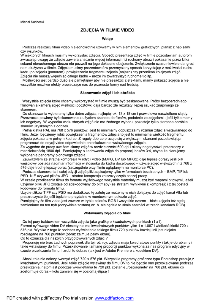 Michał Suchecki ZDJĘCIA W FILMIE VIDEO Wstęp Podczas realizacji filmu video niejednokrotnie używamy w nim elementów graficznych, plansz z napisami czy rysunków. W niektórych filmach musimy wykorzystać zdjęcia. Sposób prezentacji zdjęć w filmie pozostawiam autorom zwracając uwagę że zdjęcie zawiera znacznie więcej informacji niż ruchomy obraz i pokazanie przez kilka sekund nieruchomego obrazu nie pozwoli na jego dokładne obejrzenie. Zwiększenie czasu niewiele da, grozi nam dłużyzna w filmie. Zdjęcia musimy prezentować w przemyślany sposób korzystając z możliwości ruchu kadru po zdjęciu (panoram), powiększania fragmentu zdjęcia (najazd) czy przenikań kolejnych zdjęć. Zdjęcia nie muszą wypełniać całego kadru – może im towarzyszyć ruchome tło itp. Możliwości jest bardzo dużo ale pamiętajmy aby nie przesadzić z efektami, mamy pokazać zdjęcia a nie wszystkie możliwe efekty prowadzące nas do przerostu formy nad treścią. Skanowanie zdjęć i ich obróbka Wszystkie zdjęcia które chcemy wykorzystać w filmie muszą być zeskanowane. Próby bezpośredniego filmowania kamerą zdjęć wielkości pocztówki dają bardzo złe rezultaty, lepiej szukać znajomego ze skanerem. Do skanowania wybieramy tylko dobre zdjęcia, najlepiej ok. 13 x 18 cm i prawidłowo naświetlone slajdy. Przezrocza powinny być skanowane z użyciem skanera do filmów, podobnie ze zdjęciami - jeśli tylko mamy ich negatywy. W wypadku wielu starych zdjęć nie ma żadnego wyboru, pozostaje tylko staranna obróbka skanów uzyskanych z odbitek. Pełna klatka PAL ma 768 x 576 punktów. Jest to minimalny dopuszczalny rozmiar zdjęcia wstawianego do filmu. Jeżeli będziemy robić powiększenia fragmentów zdjęcia to jest to minimalna wielkość fragmentu zdjęcia pokazana w pełnym kadrze. Z reguły dobrze pracuje się z większymi skanami pozostawiając programowi do edycji video odpowiednie przeskalowanie wstawionego zdjęcia. Za wygodne do pracy uważam skany zdjęć w rozdzielczości 600 dpi i skany negatywów i przezroczy z rozdzielczością 1800 dpi. Pamiętajmy o kadrowaniu zdjęć do proporcji boków 3:4, chyba że planujemy wykonanie panoramy pionowego zdjęcia. Zauważyłem że stratna kompresja w edycji video (MJPG, DV lub MPG2) daje lepsze obrazy jeśli plik wejściowy posiada nadmiar informacji w stosunku do kadru docelowego – użycie zdjęć większych niż 768 x 576 daje trochę lepszy obraz (szczególnie przy filmie oglądanym na monitorze PC). Podczas skanowania i całej edycji zdjęć pliki zapisujemy tylko w formatach bezstratnych – BMP, TIF lub PSD. NIE używać plików JPG – stratna kompresja zniszczy część naszej pracy. W czasie przeliczania filmu do formatu wyjściowego wszystkie materiały muszą być mapami bitowymi, jeżeli użyjemy pliku JPG zostaje od zdekodowany do bitmapy (ze stratami wynikłymi z kompresji) i z tej postaci kodowany do formatu filmu. Użycie plików TIFF czy PSD ma dodatkowo tę zaletę że możemy w nich dołączyć do zdjęć kanał Alfa lub przezroczyste tło jeśli będzie to przydatne w montowanym pokazie zdjęć. Pamiętajmy że film video jest zawsze w trybie kolorów RGB i wszystkie czarno – białe zdjęcia też będą zamieniane na ten tryb (oczywiście zostaną cz. b. ale będzie to skala szarości w trzech kanałach RGB). Wstawiamy zdjęcia do filmu Do tej pory traktowałem wszystkie zdjęcia jako grafikę o kwadratowych punktach (1 x1). Format cyfrowego video DV niestety nie ma kwadratowych punktów tylko 1 x 1.067 i wielkość klatki 720 x 576 pkt. Wynika z tego iż podczas wyświetlania takiego filmu 720 punktów każdej linii jest niejako rozciągane na 768 punktów (obraz zajmuje pełny ekran). Co to oznacza dla naszych przygotowywanych zdjęć ? Proponuję nie brać żadnych poprawek dla tej różnicy, zdjęcia mają kwadratowe punkty i tak je obrabiamy i takie wstawiamy do filmu. Przeskalowanie i zmianę proporcji punktów wykona za nas program edycyjny w czasie przeliczania filmu. I zrobi to dobrze (tak jest w Adobe Premiere z kodekiem DV). Absolutnie nie należy tworzyć zdjęć 720 x 576 pkt. Wszystkie programy graficzne typu Photoshop pracują z kwadratowymi punktami. Jeśli takie zdjęcie wstawimy do filmu DV to nie będzie ono przeskalowane podczas przeliczania, natomiast podczas wyświetlania te 720 pkt. zostanie „rozciągnięte” na 768 pkt. ekranu co zdeformuje obraz – koło zamieni się w poziomą elipsę ! PDF created with pdfFactory Pro trial version www.pdffactory.com Przygotowałem przykładowe zdjęcie wstawiane do filmu DV i ich wygląd w filmie po użyciu dwukrotnego powiększenia. Jednak różnica na tych zdjęciach, po przeliczeniu ich do PDF (kompresja JPG) jest słabo widoczna, w obrazie na ekranie było to widać lepiej. Wstawione zdjęcie TIFF 1536 x 1152 pkt. pełna klatka Klatka eksportowana z filmu 768 x 576 pkt. zoom x 2 -----------------------------------------------------------------------------------------------------------------------------------------------Wstawione zdjęcie TIFF 768 x 576 pkt. pełna klatka Klatka eksportowana z filmu 768 x 576 pkt. zoom x 2 -----------------------------------------------------------------------------------------------------------------------------------------------Mało widoczna różnica między tymi zdjęciami i klatkami może tylko cieszyć. Kompresja DV nie pogorszyła w wyraźny sposób zdjęć, nawet gdy ich fragment jest powiększany. Skanery Pora przyznać się jakich skanerów używam. Jak przystało na amatorską działalność – żadnych szaleństw cenowych, wybór musi być rozsądnym kompromisem. Płaski skaner A4 to posiadany od dawna Microtek ScanMaker 3600. Format ponad A4, rozdzielczość optyczna 1200 x 600 dpi. Złącze USB-1. Skaner ma ponad trzy lata i pracuje niezawodnie. Jako bardzo dobry uważam dołączany do skanera program Scan Wizard 5. W trybie zaawansowanym pozwala na bardzo rozbudowaną korekcję 