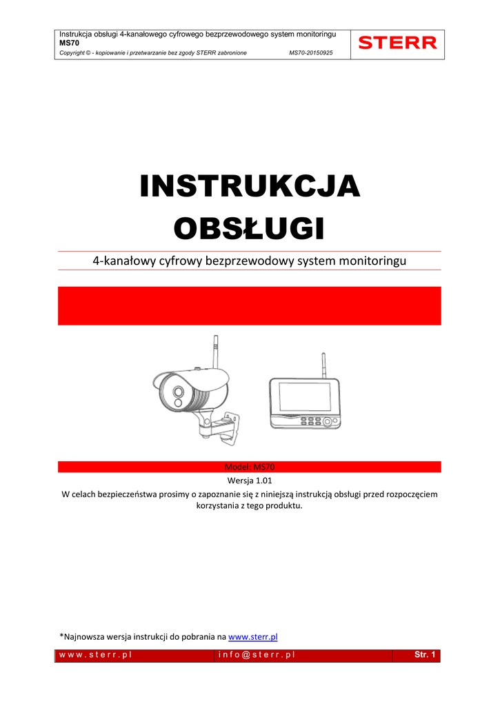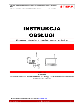 Instrukcja obs ugi 4-kana owego cyfrowego bezprzewodowego system monitoringu MS70 Copyright © - kopiowanie i przetwarzanie bez zgody STERR zabronione MS70-20150925 STERR INSTRUKCJA OBS UGI 4-kana owy cyfrowy bezprzewodowy system monitoringu Model: MS70 Wersja 1.01 W celach bezpiecze stwa prosimy o zapoznanie si z niniejsz instrukcj obs ugi przed rozpocz ciem korzystania z tego produktu. *Najnowsza wersja instrukcji do pobrania na www.sterr.pl www.sterr.pl [email protected] Str. 1 Instrukcja obs ugi 4-kana owego cyfrowego bezprzewodowego system monitoringu MS70 Copyright © - kopiowanie i przetwarzanie bez zgody STERR zabronione MS70-20150925 STERR Spis tre ci Spis tre ci ...........................................................................................................................................2 Wst p .................................................................................................................................................4 Funkcje ...............................................................................................................................................4 Lista zawarto ci...................................................................................................................................4 Konstrukcja .........................................................................................................................................5 Opcjonalnie.....................................................................................................................................5 Monta ...............................................................................................................................................6 Obs uga ..............................................................................................................................................7 Podstawowe czynno ci obs ugi .......................................................................................................7 Nagrywanie obrazu wideo...............................................................................................................8 Odtwarzanie .................................................................................................................................10 Usuwania pliku wideo ................................................................................................................... 11 Wyj cie wideo ...............................................................................................................................11 Ustawienia systemowe ..................................................................................................................... 11 Sie ...............................................................................................................................................13 Data/ godzina ...............................................................................................................................13 zyk ............................................................................................................................................. 13 Tryb nagrywania ........................................................................................................................... 13 Formatowanie karty SD/pami ci USB ............................................................................................14 Pami nagra wideo ....................................................................................................................14 Wy wietlane opcje ........................................................................................................................14 System TV .....................................................................................................................................14 Informacje o systemie ...................................................................................................................16 Aktualizacja systemu.....................................................................................................................16 Czas cyklicznej zmiany wy wietlanego obrazu ............................................................................... 16 Wyciszenie ....................................................................................................................................16 Przywracanie ustawie domy lnych .............................................................................................. 16 Jasno .........................................................................................................................................16 Poziom g no ci........................................................................................................................... 16 Poziom g no ci alarmu...............................................................................................................16 Tryb oszcz dzania energii ..............................................................................................................16 Nagrywanie ......................................................................................................................................17 Nagrywanie zaprogramowane.......................................................................................................17 Wykrywanie ruchu ........................................................................................................................ 17 Nagrywanie aktywowane czujnikiem PIR .......................................................................................17 Odtwarzanie .................................................................................................................................17 Kamera .........................................................................................................................................17 Parowanie......................................................