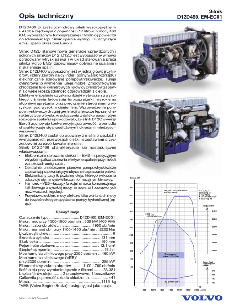 Silnik D12D460, EM-EC01 Opis techniczny D12D460 to sześciocylindrowy silnik wysokoprężny w układzie rzędowym o pojemności 12 litrów, o mocy 460 KM, wyposażony w turbosprężarkę i chłodnicę powietrza doładowywanego. Silnik spełnia wymogi UE dotyczące emisji spalin określone Euro 3. Silnik D12D stanowi nową generację sprawdzonych i solidnych silników D12. D12D jest wyposażony w nowo opracowany wtrysk paliwa i w układ sterowania pracą silnika Volvo EMS, zapewniający optymalne spalanie i niską emisję spalin. Silnik D12D460 wyposażony jest w jedną głowicę cylindrów, cztery zawory na cylinder, górny wałek rozrządu i elektronicznie sterowane pompowtryskiwacze. Tuleje cylindrowe to wymienne tuleje mokre. Zmodyfikowane chłodzenie tulei cylindrowych i głowicy cylindrów zapewnia o wiele lepszą zdolność odprowadzania ciepła. Efektywne spalanie uzyskano dzięki wytworzeniu wysokiego ciśnienia ładowania turbosprężarki, wysokiemu stopniowi sprężania oraz precyzyjnie sterowanemu wtryskowi pod wysokim ciśnieniem. Wprowadzenie pompowtryskiwaczy drugiej generacji o jeszcze lepszej charakterystyce wtrysku w połączeniu z daleko posuniętym rozwojem spalania spowodowało, że silnik D12C w wersji Euro 3 zachowuje konkurencyjną sprawność, a ponadto charakteryzuje się przedłużonymi okresami międzyserwisowymi. Silnik D12D460 został opracowany z myślą o ciężkich i wymagających przewozach ciężkimi zestawami przyczepowymi po pagórkowatym terenie. Silnik D12D460 charakteryzuje się następującymi właściwościami: • Elektroniczne sterowanie silnikiem – EMS – z precyzyjnym wtryskiem paliwa zapewnia efektywne spalanie przy niskich wartościach emisji spalin. • Centralnie umieszczone pionowe pompowtryskiwacze zapewniają zapewniają symetryczne rozpraszanie paliwa. • Elektroniczny czujnik poziomu oleju, którego wskazania odczytuje się na wyświetlaczu informacyjnym kierowcy. • Hamulec – VEB – łączący funkcje hamulca kompresyjnego i silnikowego o wysokiej mocy hamowania i poprawionych możliwościach regulacji. • Przystawka odbioru mocy silnika w kilku wariantach mocy do bezpośredniego napędzania pompy hydraulicznej (opcja). Specyfikacja Oznaczenie typu ........................... D12D460, EM-EC01 Maks. moc przy 1500-1800 obr/min .. 338 kW (460 KM) Maks. liczba obrotów ............................... 1900 obr/min Maks. moment obr. przy 1100-1450 obr/min .. 2200 Nm Liczba cylindrów ........................................................ 6 Średnica cylindra ............................................. 131 mm Skok tłoka ....................................................... 150 mm Pojemność skokowa ....................................... 12,1 dm3 Stopień sprężania ............................................... 18.1:1 Moc hamulca silnikowego przy 2300 obr/min .. 160 kW Moc hamulca silnikowego (VEB)* przy 2300 obr/min ............................................ 285 kW Ekonomiczny zakres obrotów .......... 1100-1700 obr/min Ilość oleju przy wymianie łącznie z filtrami ........ 33-38 l Liczba filtrów oleju ......... 2 przepływowe, 1 bocznikowy Całkowita pojemność układu chłodzenia ................. 44 l Masa.............................................................1115 kg *VEB (Volvo Engine Brake) dostępny jest jako opcja. Power, kW 360 338 kW 1500-1800 r/min (460 hp metric) 340 320 Torque, Nm 2400 300 2200 Nm 1100-1450 r/min 280 2200 260 2000 240 1800 220 1600 1400 200 Economy 1100-1700 r/min 180 Spec. Fuel consumption g/kWh 160 210 200 190 190 g/kWh EC01 800 2004-11-04 POL Version 02 Net output according to: ¥ ISO 1585 ¥ Dir. 89/491/EEC ¥ ECE Reg 85 1000 1200 1400 1600 180 1800 2000 r/min Silnik D12D460, EM-EC01 Opis techniczny Sterowanie silnikiem zintegrowane z systemem elektronicznym pojazdu Silnik D12D jest wyposażony w układ Volvo EMS (Engine Management System), co oznacza, że funkcje silnika są sterowane w pełni elektronicznie. Układ EMS zapewnia skuteczne sterowanie silnikiem oraz zaawansowane możliwo ści diagnostyki i wykrywania usterek. Jednostka sterująca silnika jest podłączona do łączy komunikacyjnych systemu elektronicznego pojazdu, dzięki czemu informacje są prezentowane na czytelnym wyświetlaczu na tablicy roz-dzielczej. Jednostka sterująca silnika jest umiesz-czona w aluminiowej obudowie po lewej stronie silnika, gdzie układy elektroniczne są chłodzone paliwem za pośrednictwem wbudowanej wężownicy chłodzącej. Przewody silnika są zebrane i dobrze chronione w specjalnej obudowie, umieszczonej pod rurą wlotową. Pompowtryskiwacze z szybkim wtryskiem zapewniają efektywne spalanie Wytrzymały tłok wahadłowy zapewnia optymalne uszczelnienie Silnik D12D460 jest wyposażony w pompowtryskiwacze o skoku pompy wynoszącym 17 mm, co umożliwia uzyskanie wysokich wartości ciśnienia wtrysku. Wysokie ciśnienie jest wytwa-rzane w sposób mechaniczny za pomocą dźwigni wałkowej, napędzanej przez górny wałek rozrządu. Profil krzywki wtrysku jest dostosowany do wtryskiwacza, a ruch krzywki w górę jest wykorzystywany do uzyskania maksymalnego podnoszenia, co zapewnia szybki wtrysk i efektywne spalanie. Głowica cylindrów posiada tylko jeden wspólny kanał paliwowy do wtryskiwaczy, a kanały wlotowe i zawory mają dużą średnicę, mającą zapewnić niski spadek ciśnienia. D12D420 jest wyposażony w dwuczęściowy tzw. tłok wahadłowy. Główka tłoka wahadłowego jest wykonana ze stali, a płaszcz z aluminium. Obie części są zamocowane oddzielnie na sworzniu tłokowym. Tłok wahadłowy zapewnia bardziej równomierną temperaturę tłoka i dopuszcza mniejszy luz tłoka, dzięki temu, że pierścienie tłokowe zapewn-iają lepsze uszczelnienie. Przyczynia się to między innymi do niższego zużycia oleju. Silnik wyposażony jest w układ chłodzenia tłoków. Górna część tłoków oraz strefa pierścieni tłokowych są efektywnie chłodzone dzięki wtrysk