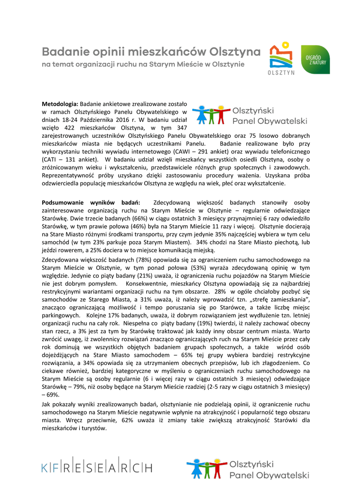 Metodologia: Badanie ankietowe zrealizowane zostało w ramach Olsztyoskiego Panelu Obywatelskiego w dniach 18-24 Października 2016 r. W badaniu udział wzięło 422 mieszkaoców Olsztyna, w tym 347 zarejestrowanych uczestników Olsztyoskiego Panelu Obywatelskiego oraz 75 losowo dobranych mieszkaoców miasta nie będących uczestnikami Panelu. Badanie realizowane było przy wykorzystaniu techniki wywiadu internetowego (CAWI – 291 ankiet) oraz wywiadu telefonicznego (CATI – 131 ankiet). W badaniu udział wzięli mieszkaocy wszystkich osiedli Olsztyna, osoby o zróżnicowanym wieku i wykształceniu, przedstawiciele różnych grup społecznych i zawodowych. Reprezentatywnośd próby uzyskano dzięki zastosowaniu procedury ważenia. Uzyskana próba odzwierciedla populację mieszkaoców Olsztyna ze względu na wiek, płed oraz wykształcenie. Podsumowanie wyników badań: Zdecydowaną większośd badanych stanowiły osoby zainteresowane organizacją ruchu na Starym Mieście w Olsztynie – regularnie odwiedzające Starówkę. Dwie trzecie badanych (66%) w ciągu ostatnich 3 miesięcy przynajmniej 6 razy odwiedziło Starówkę, w tym prawie połowa (46%) była na Starym Mieście 11 razy i więcej. Olsztynie docierają na Stare Miasto różnymi środkami transportu, przy czym jedynie 35% najczęściej wybiera w tym celu samochód (w tym 23% parkuje poza Starym Miastem). 34% chodzi na Stare Miasto piechotą, lub jeździ rowerem, a 25% dociera w to miejsce komunikacją miejską. Zdecydowana większośd badanych (78%) opowiada się za ograniczeniem ruchu samochodowego na Starym Mieście w Olsztynie, w tym ponad połowa (53%) wyraża zdecydowaną opinię w tym względzie. Jedynie co piąty badany (21%) uważa, iż ograniczenia ruchu pojazdów na Starym Mieście nie jest dobrym pomysłem. Konsekwentnie, mieszkaocy Olsztyna opowiadają się za najbardziej restrykcyjnymi wariantami organizacji ruchu na tym obszarze. 28% w ogóle chciałoby pozbyd się samochodów ze Starego Miasta, a 31% uważa, iż należy wprowadzid tzn. „strefę zamieszkania”, znacząco ograniczającą możliwośd i tempo poruszania się po Starówce, a także liczbę miejsc parkingowych. Kolejne 17% badanych, uważa, iż dobrym rozwiązaniem jest wydłużenie tzn. letniej organizacji ruchu na cały rok. Niespełna co piąty badany (19%) twierdzi, iż należy zachowad obecny stan rzecz, a 3% jest za tym by Starówkę traktowad jak każdy inny obszar centrum miasta. Warto zwrócid uwagę, iż zwolennicy rozwiązao znacząco ograniczających ruch na Starym Mieście przez cały rok dominują we wszystkich objętych badaniem grupach społecznych, a także wśród osób dojeżdżjących na Stare Miasto samochodem – 65% tej grupy wybiera bardziej restrykcyjne rozwiązania, a 34% opowiada się za utrzymaniem obecnych przepisów, lub ich złagodzeniem. Co ciekawe również, bardziej kategoryczne w myśleniu o ograniczeniach ruchu samochodowego na Starym Mieście są osoby regularnie (6 i więcej razy w ciągu ostatnich 3 miesięcy) odwiedzające Starówkę – 79%, niż osoby będące na Starym Mieście rzadziej (2-5 razy w ciągu ostatnich 3 miesięcy) – 69%. Jak pokazały wyniki zrealizowanych badao, olsztynianie nie podzielają opinii, iż ograniczenie ruchu samochodowego na Starym Mieście negatywnie wpłynie na atrakcyjnośd i popularnośd tego obszaru miasta. Wręcz przeciwnie, 62% uważa iż zmiany takie zwiększą atrakcyjnośd Starówki dla mieszkaoców i turystów.