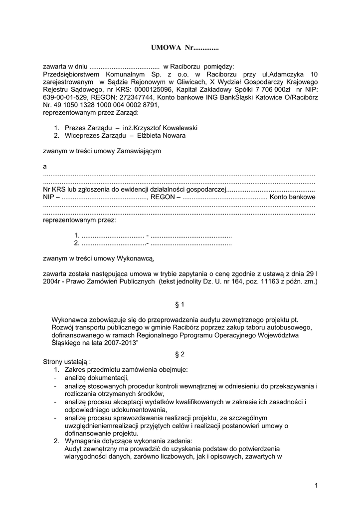 UMOWA Nr.............. zawarta w dniu ...................................... w Raciborzu pomiędzy: Przedsiębiorstwem Komunalnym Sp. z o.o. w Raciborzu przy ul.Adamczyka 10 zarejestrowanym w Sądzie Rejonowym w Gliwicach, X Wydział Gospodarczy Krajowego Rejestru Sądowego, nr KRS: 0000125096, Kapitał Zakładowy Spółki 7 706 000zł nr NIP: 639-00-01-529, REGON: 272347744, Konto bankowe ING BankŚląski Katowice O/Racibórz Nr. 49 1050 1328 1000 004 0002 8791, reprezentowanym przez Zarząd: 1. Prezes Zarządu – inż.Krzysztof Kowalewski 2. Wiceprezes Zarządu – Elżbieta Nowara zwanym w treści umowy Zamawiającym a ................................................................................................................................................... ................................................................................................................................................... Nr KRS lub zgłoszenia do ewidencji działalności gospodarczej................................................ NIP – .............................................., REGON – .............................................. Konto bankowe ................................................................................................................................................... ................................................................................................................................................... reprezentowanym przez: 1. .................................. - ............................................ 2. ...................................- ............................................ zwanym w treści umowy Wykonawcą, zawarta została następująca umowa w trybie zapytania o cenę zgodnie z ustawą z dnia 29 I 2004r - Prawo Zamówień Publicznych (tekst jednolity Dz. U. nr 164, poz. 11163 z późn. zm.) §1 Wykonawca zobowiązuje się do przeprowadzenia audytu zewnętrznego projektu pt. Rozwój transportu publicznego w gminie Racibórz poprzez zakup taboru autobusowego, dofinansowanego w ramach Regionalnego Pprogramu Operacyjnego Województwa Śląskiego na lata 2007-2013” §2 Strony ustalają : 1. Zakres przedmiotu zamówienia obejmuje: - analizę dokumentacji, - analizę stosowanych procedur kontroli wewnątrznej w odniesieniu do przekazywania i rozliczania otrzymanych środków, - analizę procesu akceptacji wydatków kwalifikowanych w zakresie ich zasadności i odpowiedniego udokumentowania, - analizę procesu sprawozdawania realizacji projektu, ze szczególnym uwzględnieniemrealizacji przyjętych celów i realizacji postanowień umowy o dofinansowanie projektu. 2. Wymagania dotyczące wykonania zadania: Audyt zewnętrzny ma prowadzić do uzyskania podstaw do potwierdzenia wiarygodności danych, zarówno liczbowych, jak i opisowych, zawartych w 1 przedstawionych przez Beneficjenta dokumentach związanych z realizowanym projektem. Audyt powinien być zrealizowany zgodnie z Międzynarodowymi Standartami Profesjonalnej Praktyki Audytu Wewnętrznego. 3. Audyt zostanie wykonany zgodnie z wytycznymi instytucji zarządzającej RPO WSL - załącznik Nr 13, znajdujący się na www.rpo.slaskie.pl Audyt zostanie wykonany w godzinach pracy Zamawiająceo, tj: 700 do 1500 4. Termin wykonania audytu i sporządzenia sprawozdania-raportu: 25.03.2011r. W przypadku sprawozdania-raportu niezgodnego z wytycznymi, Wykonawca zobowiązany jest poprawić je terminie do 24 godzin od dostarczenia. Ewentualne reklamacje dot. zamówienia powinny być złożone w dniu ich ujawnienia. Wykonawca zobowiązany jest do załatwienia reklamacji niezwłocznie w terminie nie przekraczającym 2 dni od jej złożenia pod rygorem odstąpienia od umowy przez Zamawiającego. §3 1. Wartość przedmiotu umowy opisanego w § 1 umowy, zgodna z załączonym do oferty formularzem ofertowym wynosi : netto .............................................zł (słownie:........................................................................................................................zł) do podanej kwoty doliczony będzie podatek VAT w aktualnie obowiązującej wysokości 2. Cena oferty musi zawierać wszystkie koszty związane z realizacją zadania określonego w pkt.2 ogłoszenia o zamówieniu, jak również koszty nie ujęte a niezbędne do wykonania zadania 3. Zapłata za audyt nastąpi przelewem na podstawie wystawionej faktury w terminie 30 dni od dnia doręczenia jej Zamawiającemu 4. Zamawiający nie dopuszcza możliwości waloryzacji cen podanych w formularzu ofertowym do oferty. §4 1. Wykonawca zobowiązuje się zapłacić Zamawiającemu karę umowną w przypadku: a) gdy Zamawiający odstąpi od umowy z przyczyn za które ponosi odpowiedzialność Wykonawca w wysokości 10% wartości przedmiotu zamówienia brutto. b) zwłoki w wykonaniu umowy w wysokości 0,2% wartości przedmiotu zamówienia brutto za każdy dzień zwłoki. c) za zwłokę w usunięciu usterek w wysokości 0,5 % wartości przedmiotu zamówienia brutto za każdy dzień zwłoki licząc od dnia wyznaczonego na jej usunięcie. 2. Zamawiający zobowiązuje się zapłacić Wykonawcy karę umowną w przypadku: - gdy Wykonawca odstąpi od umowy z przyczyn za które ponosi odpowiedzialność Zamawiający, w wysokości 10 % wartości przedmiotu zamówienia brutto. 2 3. Zamawiający może dochodzić odszkodowania przewyższającego karę umowną w przypadku gdy powstała szkoda przewyższa wartość zamówienia, oraz w innych przypadkach, nie wykonania lub nienależytego wykonania umowy. §5 W przypadku nienależytej realizacji umowy przez Wykonawcę, wynikającej z nagminnego niedotrzymywania terminów, a także powtarzających ciągłych się braków w sporządzonym sprawozdaniu-raporcie Zamawiający zastrzega sobie prawo do rozwiązania umowy w trybie natychmiastowym bez wypowiedzenia. §6 Umowa zawarta zostaje na okres 1 miesiąca, zaś cena nie będą podlegały zmianom przez cały okres trwania umowy. §7 Zamawiają