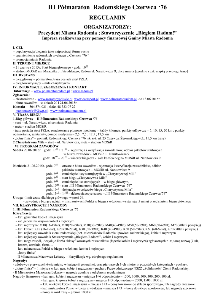 III Półmaraton Radomskiego Czerwca ‘76 REGULAMIN ORGANIZATORZY: Prezydent Miasta Radomia ; Stowarzyszenie „Biegiem Radom!” Impreza realizowana przy pomocy finansowej Gminy Miasta Radomia I. CEL – popularyzacja biegania jako najprostszej formy ruchu – upamiętnienie radomskich wydarzeń „ Czerwca ‘76 ” – promocja miasta Radomia II. TERMIN I MIEJSCE – 21 czerwca 2015r. Start biegu głównego - godz. 1000 – stadion MOSiR im. Marszałka J. Piłsudskiego, Radom ul. Narutowicza 9, ulice miasta (zgodnie z zał. mapką przebiegu trasy) III. DYSTANS – bieg główny – półmaraton, trasa posiada atest PZLA – bieg towarzyszący – mila charytatywna IV. INFORMACJE, ZGŁOSZENIA I KONTAKT Informacje – www.polmaratonradom.pl ; www.radom.pl Zgłoszenia: – elektroniczne - www.maratonypolskie.pl; www.datasport.pl; www.polmaratonradom.pl;-do 18.06.2015r. – biuro zawodów - w dniach 20 i 21.06.2015r. Kontakt – 504 574 021 ; tl/fax 48 333 07 22 – [email protected] ; www.polmaratonradom.pl V. TRASA BIEGU 1.Bieg główny – II Półmaraton Radomskiego Czerwca ‘76 - start – ul. Narutowicza, ulice miasta Radomia - meta – stadion MOSiR - trasa posiada atest PZLA, oznakowanie pionowe i poziome – każdy kilometr, punkty odżywcze – 5; 10; 15; 20 km ; punkty odświeżania, sanitariaty, pomoc medyczna – 2,5 ; 7,5 ; 12,5 ; 17,5 km - „lotny finisz” - pomnik Radomskiego Czerwca ’76 skrzyż. ul. 25 Czerwca /Żeromskiego (ok. 15,5 km trasy) 2.Charytatywna Mila – start – ul. Narutowicza, meta – stadion MOSiR VI. PROGRAM ZAWODÓW Sobota 20.06.2015r. godz. 1700 ‚ 2100 - rejestracja i weryfikacja zawodników, odbiór pakietów startowych w biurze zawodów - MOSiR ul. Narutowicza 9 godz. 18 00 – 20 00 – wieczór biegacza - sala konferencyjna MOSiR ul. Narutowicza 9 Niedziela 21.06.2015r. godz. 700 – otwarcie biura zawodów - rejestracja i weryfikacja zawodników, odbiór pakietów startowych – MOSiR ul. Narutowicza 9 godz. 915 – zamknięcie listy startujących w „Charytatywnej Mili” godz. 930 – start biegu „Charytatywna Mila” godz. 930 – zamknięcie list startujących – w biegu głównym, godz.1000 – start „III Półmaratonu Radomskiego Czerwca ‘76” godz.1015 - dekoracja zwycięzców biegu „Charytatywna Mila” godz.1315 – 1400 – dekoracja zwycięzców –„III Półmaratonu Radomskiego Czerwca’76” Uwaga - limit czasu dla biegu głównego wynosi 3h, - zawodnicy biorący udział w mistrzostwach Polski w biegu z wózkiem wystartują 5 minut przed startem biegu głównego VII. KLASYFIKACJE I NAGRODY 1. III Półmaraton Radomskiego Czerwca ‘76 Klasyfikacje: – kat. generalna kobiet i mężczyzn - kat. generalna krajowa kobiet i mężczyzn – kat. mężczyzn: M18(16-19lat), M20(20-29lat), M30(30-39lat), M40(40-49lat), M50(50-59lat), M60(60-69lat), M70(70lat i powyżej) – kat. kobiet: K18 (16-19lat), K20 (20-29lat), K30 (30-39lat), K40 (40-49lat), K50 (50-59lat), K60 (60-69lat), K70 (70lat i powyżej) – kat. najlepszy zawodnik ziemi radomskiej (dot. mieszkańców Radomia i powiatu radomskiego), kobiet i mężczyzn – kat. najlepszy zawodnik Stowarzyszenia „Biegiem Radom!”, kobiet i mężczyzn – kat. mega zespół, decyduje liczba sklasyfikowanych zawodników (łącznie kobiet i mężczyzn) zgłoszonych z tą samą nazwą (klub, branża, uczelnia, firma… – kat. mistrzostwa Polski w biegu z wózkiem, kobiet i mężczyzn - „lotny finisz” - II Mistrzostwa Mazowsza Lekarzy – klasyfikacje wg. odrębnego regulaminu Nagrody: - zdobywcy pierwszych 6-ciu miejsc w kategorii generalnej, oraz pierwszych 3-ch miejsc w pozostałych kategoriach - puchary. - „lotny finisz” – 1 miejsca w kat. gen. kobiet i mężczyzn – puchary Przewodniczącego NSZZ „Solidarność” Ziemi Radomskiej. - II Mistrzostwa Mazowsza Lekarzy – nagrody zgodnie z odrębnym regulaminem Nagrody finansowe – kat. gen. kobiet i mężczyzn – miejsca 1‚6 odpowiednio – 1500; 1000; 500; 300; 200; 100 zł. - kat. gen. krajowa kobiet i mężczyzn – miejsca 1‚3 odpowiednio – 2500; 1500; 1000 zł. – kat. wiekowe kobiet i mężczyzn – miejsca 1‚3 – bony towarowe do sklepu sportowego, lub nagrody rzeczowe - kat. mistrzostwa Polski w biegu z wózkiem – miejsca 1‚3 – bony do sklepu sportowego, lub nagrody rzeczowe - nowy rekord trasy – premia 1000 zł. Zawodnicy nagrodzeni w kat. generalnej i kat. generalnej krajowej, nie są brani pod uwagę przy klasyfikacji i nagrodach w kat. wiekowych. Medale pamiątkowe – wszyscy którzy ukończą bieg. Okolicznościowe koszulki techniczne, oraz pakiety startowe. Organizator nie gwarantuje otrzymania koszulek oraz pełnego pakietu startowego dla osób dokonujących opłaty startowej w dniach 20 i 21.06.2015r. 2. „Charytatywna Mila”: dochód z biegu przekazujemy – Stow. im. O. Pio w Radomiu, Stow. Radomski Czerwiec’76 Klasyfikacja – kat. generalna kobiet i mężczyzn Nagrody: – kat. gen. kobiet i mężczyzn – puchary za miejsca 1 ‚ 3 – najstarszy uczestnik biegu – puchar – koszulki okolicznościowe , medale pamiątkowe VIII. UCZESTNICTWO Do startu w półmaratonie dopuszczeni zostaną zawodnicy którzy ukończyli 16-ty rok życia, posiadają aktualne badania lekarskie lub po podpisaniu oświadczenia o stanie zdrowia. Charytatywna Mila – bieg bez ograniczeń wiekowych, wymagania dot. stanu zdrowia - analogiczne jak dla półmaratonu. W biegu z wózkami startują matka lub ojciec dziecka. W obu biegach, zawodnicy niepełnoletni muszą posiadać pisemną zgodę rodziców na uczestnictwo w biegu. IX. OPŁATY STARTOWE – 1.III Półmaraton Radomskiego Czerwca ‘76 Przelew – 1. termin – 30 zł - wpłata do 31.03.2015r. ; 2 termin – 40 zł – wpłata do 31.05.2015r. ; 3 termin – 50 zł wpłata do 17.06.2015r Gotówka - 4 termin – 60 zł – wpłata w biurze zawodów Członkowie Stowarzyszenia „Biegiem Radom!” Przelew - 1 termin – 20 zł - wpł