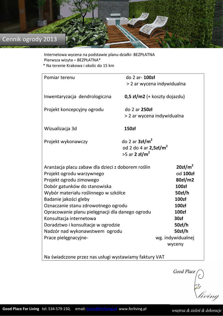 Cennik ogrody 2013 Cennik ogrody Internetowa wycena na podstawie planu działki- BEZPŁATNA Pierwsza wizyta – BEZPŁATNA* * Na terenie Krakowa i okolic do 15 km Pomiar terenu do 2 ar- 100zł > 2 ar wycena indywidualna Inwentaryzacja dendrologiczna 0,5 zł/m2 (+ koszty dojazdu) Projekt koncepcyjny ogrodu do 2 ar 250zł > 2 ar wycena indywidualna Wizualizacja 3d 150zł Projekt wykonawczy do 2 ar 3zł/m2 od 2 do 4 ar 2,5zł/m2 >5 ar 2 zł/m2 Aranżacja placu zabaw dla dzieci z doborem roślin 20zł/m2 Projekt ogrodu warzywnego od 100zł Projekt ogrodu zimowego 80zł/m2 Dobór gatunków do stanowiska 100zł Wybór materiału roślinnego w szkółce 50zł/h Badanie jakości gleby 100zł Oznaczanie stanu zdrowotnego ogrodu 100zł Opracowanie planu pielęgnacji dla danego ogrodu 100zł Konsultacja internetowa 30zł Doradztwo i konsultacje w ogrodzie 50zł/h Nadzór nad wykonawstwem ogrodu 50zł/h Prace pielęgnacyjnewg. indywidualnej wyceny Na świadczone przez nas usługi wystawiamy faktury VAT Good Place For Living tel. 534-579-150, email: [email protected] www.forliving.pl