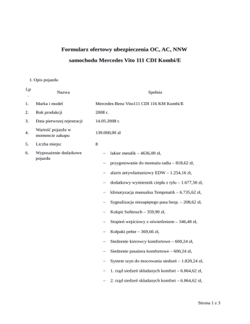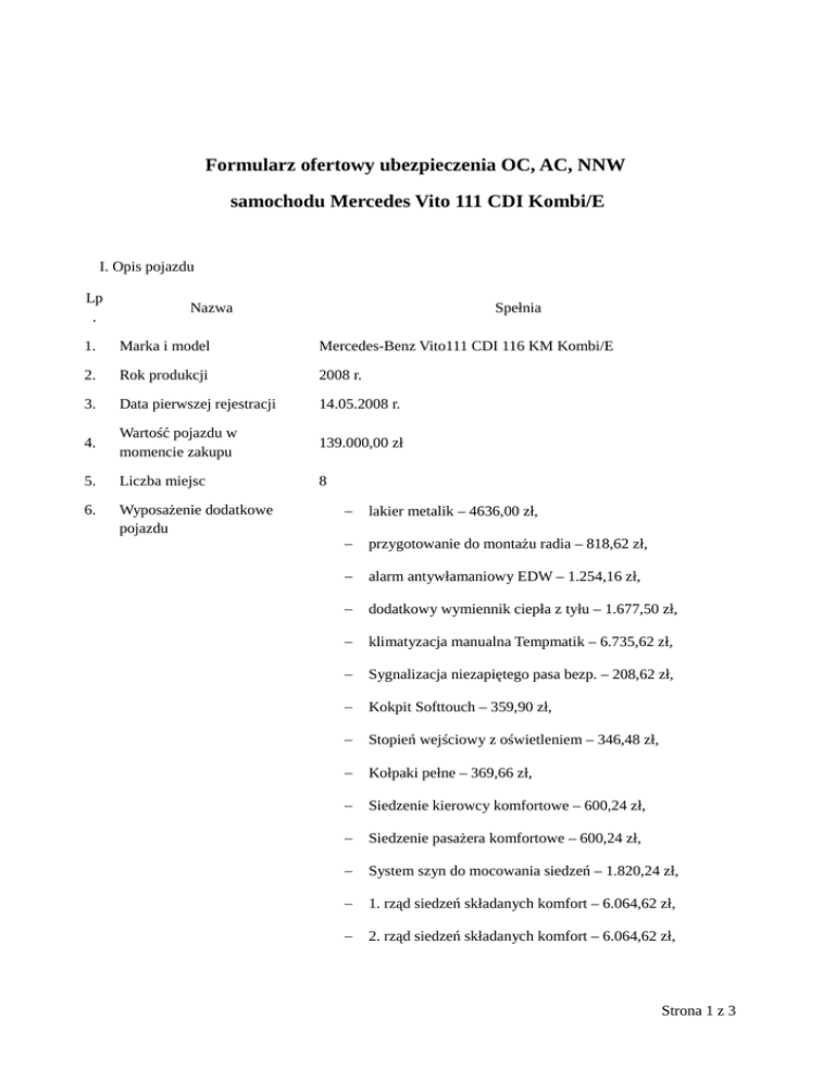 Formularz ofertowy ubezpieczenia OC, AC, NNW samochodu Mercedes Vito 111 CDI Kombi/E I. Opis pojazdu Lp . Nazwa Spełnia 1. Marka i model Mercedes-Benz Vito111 CDI 116 KM Kombi/E 2. Rok produkcji 2008 r. 3. Data pierwszej rejestracji 14.05.2008 r. 4. Wartość pojazdu w momencie zakupu 139.000,00 zł 5. Liczba miejsc 8 6. Wyposażenie dodatkowe pojazdu − lakier metalik – 4636,00 zł, − przygotowanie do montażu radia – 818,62 zł, − alarm antywłamaniowy EDW – 1.254,16 zł, − dodatkowy wymiennik ciepła z tyłu – 1.677,50 zł, − klimatyzacja manualna Tempmatik – 6.735,62 zł, − Sygnalizacja niezapiętego pasa bezp. – 208,62 zł, − Kokpit Softtouch – 359,90 zł, − Stopień wejściowy z oświetleniem – 346,48 zł, − Kołpaki pełne – 369,66 zł, − Siedzenie kierowcy komfortowe – 600,24 zł, − Siedzenie pasażera komfortowe – 600,24 zł, − System szyn do mocowania siedzeń – 1.820,24 zł, − 1. rząd siedzeń składanych komfort – 6.064,62 zł, − 2. rząd siedzeń składanych komfort – 6.064,62 zł, Strona 1 z 3 7. 8. − Szyby tylne z czarnego szkła – 1.566,48 zł, − przygotowanie miejsca dla osoby niepełnosprawnej na wózku inwalidzkim – 5.490,00 zł − ABS, − poduszki powietrzne czołowe, − radio CD Sony, − szyby i lusterka sterowane elektrycznie, − centralny zamek, − dwa komplety kluczy, Dodatkowe informacje Pojazd jest przystosowany do przewozu osób niepełnosprawnych Historia ubezpieczenia Zamawiający ubezpiecza posiadane samochody w zakresie OC, AC, NNW od 1996 r. W okresie tym nie wystąpiła żadna szkoda obciążająca polisę Zamawiającego. II. Szczegóły oferty Lp . Nazwa Spełnia/Nie spełnia 1. Obowiązkowe ubezpieczenie OC Spełnia 2. AutoCasco AC Spełnia 3. Ubezpieczenie następstw nieszczęśliwych wypadków kierowcy i pasażerów NNW Spełnia 4. Suma ubezpieczenie jest niepomniejszana po wypłacie odszkodowania Spełnia 5. Ubezpieczanie wszystkich szyb w pojeździe od wszelkich ryzyk Spełnia 6. Naprawy w autoryzowanym serwisie z wykorzystaniem nowych, oryginalnych części Spełnia 7. Zniesiony udział własny w szkodzie Spełnia 8. Ochrona obejmuje wszystkie szyby w pojeździe Spełnia 9. Holowanie samochodu w przypadku kolizji i awarii z każdego miejsca w kraju Spełnia 10. Samochód zastępczy na czas naprawy spowodowanej kolizją lub Spełnia Strona 2 z 3 awarią na okres min. 7 dni II. Wartość oferty Wartość brutto oferty wynosi: ………………………………………………………………………………………………… słownie: …………………………………………………………………………………………………………… ……………………. III. Postanowienia końcowe 1. Aby oferta była ważna wszystkie powyższe kryteria muszą zostać spełnione. 2. Umowę ubezpieczenia zawiera się na okres jednego roku. 3. Składka za polisę płatna będzie jednorazowo w ciągu 14 dni od daty obowiązywania polisy. 4. Wykonawca jest związany ofertą do 13.05.2015 r. ……………………………………… data i podpis Wykonawcy Strona 3 z 3