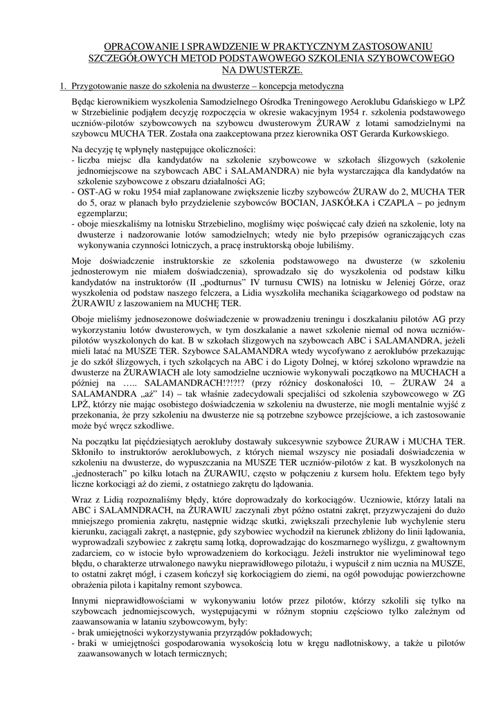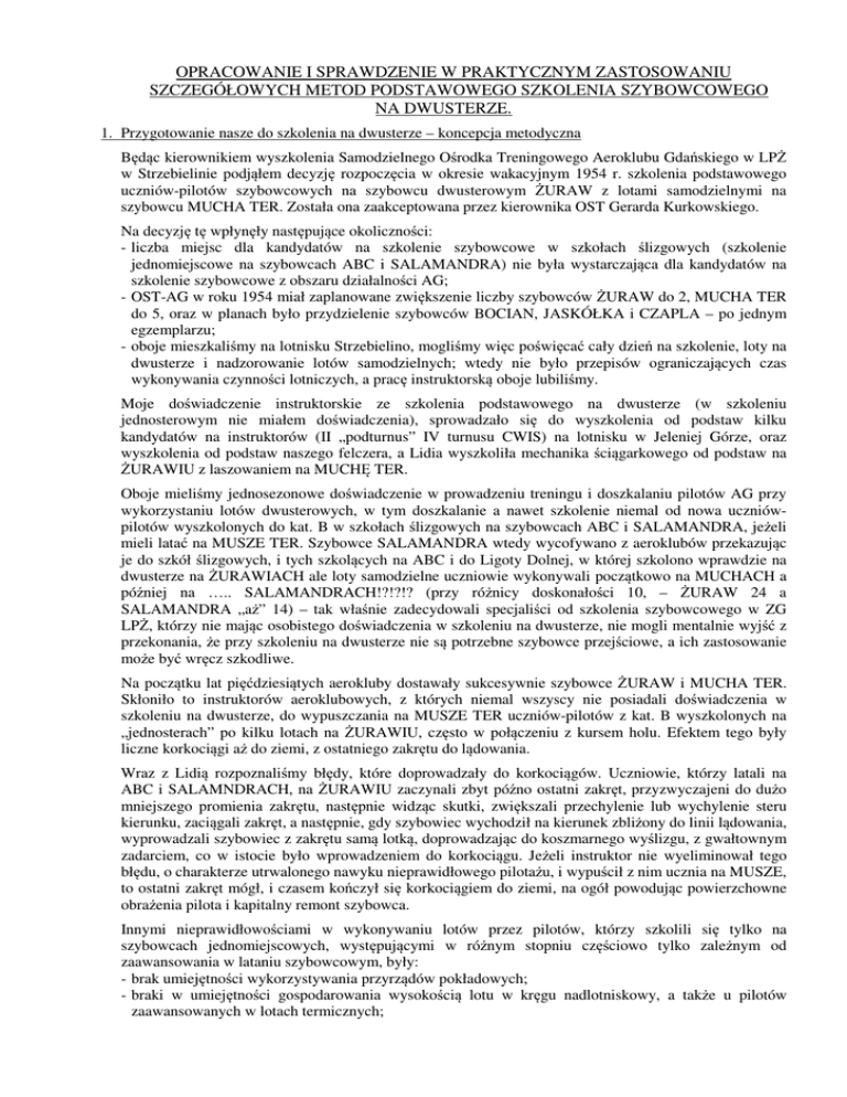 OPRACOWANIE I SPRAWDZENIE W PRAKTYCZNYM ZASTOSOWANIU SZCZEGÓŁOWYCH METOD PODSTAWOWEGO SZKOLENIA SZYBOWCOWEGO NA DWUSTERZE. 1. Przygotowanie nasze do szkolenia na dwusterze – koncepcja metodyczna Będąc kierownikiem wyszkolenia Samodzielnego Ośrodka Treningowego Aeroklubu Gdańskiego w LPŻ w Strzebielinie podjąłem decyzję rozpoczęcia w okresie wakacyjnym 1954 r. szkolenia podstawowego uczniów-pilotów szybowcowych na szybowcu dwusterowym ŻURAW z lotami samodzielnymi na szybowcu MUCHA TER. Została ona zaakceptowana przez kierownika OST Gerarda Kurkowskiego. Na decyzję tę wpłynęły następujące okoliczności: - liczba miejsc dla kandydatów na szkolenie szybowcowe w szkołach ślizgowych (szkolenie jednomiejscowe na szybowcach ABC i SALAMANDRA) nie była wystarczająca dla kandydatów na szkolenie szybowcowe z obszaru działalności AG; - OST-AG w roku 1954 miał zaplanowane zwiększenie liczby szybowców ŻURAW do 2, MUCHA TER do 5, oraz w planach było przydzielenie szybowców BOCIAN, JASKÓŁKA i CZAPLA – po jednym egzemplarzu; - oboje mieszkaliśmy na lotnisku Strzebielino, mogliśmy więc poświęcać cały dzień na szkolenie, loty na dwusterze i nadzorowanie lotów samodzielnych; wtedy nie było przepisów ograniczających czas wykonywania czynności lotniczych, a pracę instruktorską oboje lubiliśmy. Moje doświadczenie instruktorskie ze szkolenia podstawowego na dwusterze (w szkoleniu jednosterowym nie miałem doświadczenia), sprowadzało się do wyszkolenia od podstaw kilku kandydatów na instruktorów (II „podturnus” IV turnusu CWIS) na lotnisku w Jeleniej Górze, oraz wyszkolenia od podstaw naszego felczera, a Lidia wyszkoliła mechanika ściągarkowego od podstaw na ŻURAWIU z laszowaniem na MUCHĘ TER. Oboje mieliśmy jednosezonowe doświadczenie w prowadzeniu treningu i doszkalaniu pilotów AG przy wykorzystaniu lotów dwusterowych, w tym doszkalanie a nawet szkolenie niemal od nowa uczniówpilotów wyszkolonych do kat. B w szkołach ślizgowych na szybowcach ABC i SALAMANDRA, jeżeli mieli latać na MUSZE TER. Szybowce SALAMANDRA wtedy wycofywano z aeroklubów przekazując je do szkół ślizgowych, i tych szkolących na ABC i do Ligoty Dolnej, w której szkolono wprawdzie na dwusterze na ŻURAWIACH ale loty samodzielne uczniowie wykonywali początkowo na MUCHACH a później na ….. SALAMANDRACH!?!?!? (przy różnicy doskonałości 10, – ŻURAW 24 a SALAMANDRA „aż” 14) – tak właśnie zadecydowali specjaliści od szkolenia szybowcowego w ZG LPŻ, którzy nie mając osobistego doświadczenia w szkoleniu na dwusterze, nie mogli mentalnie wyjść z przekonania, że przy szkoleniu na dwusterze nie są potrzebne szybowce przejściowe, a ich zastosowanie może być wręcz szkodliwe. Na początku lat pięćdziesiątych aerokluby dostawały sukcesywnie szybowce ŻURAW i MUCHA TER. Skłoniło to instruktorów aeroklubowych, z których niemal wszyscy nie posiadali doświadczenia w szkoleniu na dwusterze, do wypuszczania na MUSZE TER uczniów-pilotów z kat. B wyszkolonych na „jednosterach” po kilku lotach na ŻURAWIU, często w połączeniu z kursem holu. Efektem tego były liczne korkociągi aż do ziemi, z ostatniego zakrętu do lądowania. Wraz z Lidią rozpoznaliśmy błędy, które doprowadzały do korkociągów. Uczniowie, którzy latali na ABC i SALAMNDRACH, na ŻURAWIU zaczynali zbyt późno ostatni zakręt, przyzwyczajeni do dużo mniejszego promienia zakrętu, następnie widząc skutki, zwiększali przechylenie lub wychylenie steru kierunku, zaciągali zakręt, a następnie, gdy szybowiec wychodził na kierunek zbliżony do linii lądowania, wyprowadzali szybowiec z zakrętu samą lotką, doprowadzając do koszmarnego wyślizgu, z gwałtownym zadarciem, co w istocie było wprowadzeniem do korkociągu. Jeżeli instruktor nie wyeliminował tego błędu, o charakterze utrwalonego nawyku nieprawidłowego pilotażu, i wypuścił z nim ucznia na MUSZE, to ostatni zakręt mógł, i czasem kończył się korkociągiem do ziemi, na ogół powodując powierzchowne obrażenia pilota i kapitalny remont szybowca. Innymi nieprawidłowościami w wykonywaniu lotów przez pilotów, którzy szkolili się tylko na szybowcach jednomiejscowych, występującymi w różnym stopniu częściowo tylko zależnym od zaawansowania w lataniu szybowcowym, były: - brak umiejętności wykorzystywania przyrządów pokładowych; - braki w umiejętności gospodarowania wysokością lotu w kręgu nadlotniskowy, a także u pilotów zaawansowanych w lotach termicznych; 2 - poważne nieprawidłowości w koordynacji operacji sterami w zakrętach, polegające głownie na braku przeciwdziałania momentowi kierunkowego lotek oraz na nieumiejętnej operacji sterem wysokości dla utrzymania właściwego pochylenia, prowadzącą bądź do jego zwiększania na skutek braku reakcji na tendencję do pochylania bądź na nadmiernym ściąganiu drążka; - braki w technice poprawiania obliczenia na prostej do lądowania, prowadzące do nadmiernego rozpędzania szybowca, albo gorzej, do wytracania prędkości; - liczne błędy obserwacji i podziału uwagi; - słaba ocena rzeczywistego kierunku lotu względem ziemi podczas lotu z bocznym wiatrem (trawersowane) albo zupełny jej brak. Wymiana doświadczeń między nami doprowadziła do przyjęcia a następnie stosowania niżej opisanych zasad metodycznych. Każdy dzień lotny rozpoczynaliśmy o wspólnego oblotu warunków pogody i rozłożenia startu, co wykorzystywaliśmy również na własne doskonalenie i ujednolicenie techniki pilotażu. Wypracowane w tych lotach standardy parametrów lotu i pilotażu, przekazywaliśmy naszym uczniom w instruktarzu i pokazie w locie. 2. Zasadnicze kanony zastosowanej metodyki szkolenia na dwusterze i później w lotach samodzielnych. 2.1. Założyliśmy, że od początku lotów dwusterowych będziemy nauczać wykonywania całości lotu (metoda całościowa – porządkująca proces nauki), nieco ina