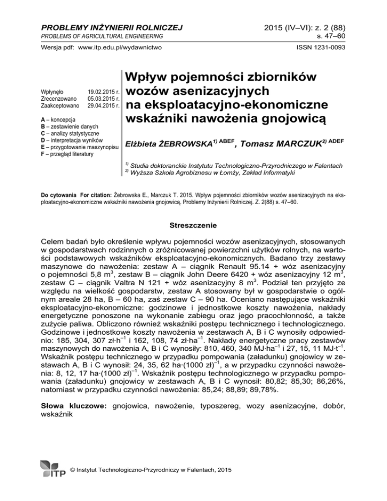 PROBLEMY INŻYNIERII ROLNICZEJ 2015 (IV–VI): z. 2 (88) PROBLEMS OF AGRICULTURAL ENGINEERING s. 47–60 Wersja pdf: www.itp.edu.pl/wydawnictwo ISSN 1231-0093 Wpłynęło Zrecenzowano Zaakceptowano 19.02.2015 r. 05.03.2015 r. 29.04.2015 r. A – koncepcja B – zestawienie danych C – analizy statystyczne D – interpretacja wyników E – przygotowanie maszynopisu F – przegląd literatury Wpływ pojemności zbiorników wozów asenizacyjnych na eksploatacyjno-ekonomiczne wskaźniki nawożenia gnojowicą Elżbieta ŻEBROWSKA1) ABEF, Tomasz MARCZUK2) ADEF 1) 2) Studia doktoranckie Instytutu Technologiczno-Przyrodniczego w Falentach Wyższa Szkoła Agrobiznesu w Łomży, Zakład Informatyki Do cytowania For citation: Żebrowska E., Marczuk T. 2015. Wpływ pojemności zbiorników wozów asenizacyjnych na eksploatacyjno-ekonomiczne wskaźniki nawożenia gnojowicą. Problemy Inżynierii Rolniczej. Z. 2(88) s. 47–60. Streszczenie Celem badań było określenie wpływu pojemności wozów asenizacyjnych, stosowanych w gospodarstwach rodzinnych o zróżnicowanej powierzchni użytków rolnych, na wartości podstawowych wskaźników eksploatacyjno-ekonomicznych. Badano trzy zestawy maszynowe do nawożenia: zestaw A – ciągnik Renault 95.14 + wóz asenizacyjny o pojemności 5,8 m3, zestaw B – ciągnik John Deere 6420 + wóz asenizacyjny 12 m3, zestaw C – ciągnik Valtra N 121 + wóz asenizacyjny 8 m3. Podział ten przyjęto ze względu na wielkość gospodarstw, zestaw A stosowany był w gospodarstwie o ogólnym areale 28 ha, B – 60 ha, zaś zestaw C – 90 ha. Oceniano następujące wskaźniki eksploatacyjno-ekonomiczne: godzinowe i jednostkowe koszty nawożenia, nakłady energetyczne ponoszone na wykonanie zabiegu oraz jego pracochłonność, a także zużycie paliwa. Obliczono również wskaźniki postępu technicznego i technologicznego. Godzinowe i jednostkowe koszty nawożenia w zestawach A, B i C wynosiły odpowiednio: 185, 304, 307 zł·h–1 i 162, 108, 74 zł·ha–1. Nakłady energetyczne pracy zestawów maszynowych do nawożenia A, B i C wynosiły: 810, 460, 340 MJ·ha–1 i 27, 15, 11 MJ·t–1. Wskaźnik postępu technicznego w przypadku pompowania (załadunku) gnojowicy w zestawach A, B i C wynosił: 24, 35, 62 ha·(1000 zł)–1, a w przypadku czynności nawożenia: 8, 12, 17 ha·(1000 zł)–1. Wskaźnik postępu technologicznego w przypadku pompowania (załadunku) gnojowicy w zestawach A, B i C wynosił: 80,82; 85,30; 86,26%, natomiast w przypadku czynności nawożenia: 85,24; 88,89; 89,78%. Słowa kluczowe: gnojowica, nawożenie, typoszereg, wozy asenizacyjne, dobór, wskaźnik © Instytut Technologiczno-Przyrodniczy w Falentach, 2015 Elżbieta Żebrowska, Tomasz Marczuk Wstęp Roczna produkcja nawozów naturalnych w Polsce wynosi ok. 80 mln t obornika, 13 mln m3 gnojówki i 7,5 mln m3 gnojowicy [IWASZKIEWICZ 2013]. Nawozy naturalne wykorzystywane są głównie do nawożenia upraw rolniczych, a częściowo jako surowiec do produkcji biogazu [BORUSEWICZ, KAPELA 2013; FUGOL, SZLACHTA 2010]. Do składowania, transportu i rozlewania płynnych nawozów naturalnych potrzebny jest szeroki asortyment maszyn i urządzeń dostosowanych do lokalnych warunków glebowo-klimatycznych i obowiązujących wymagań ekologicznych [KAMIŃSKI 2013]. Do przechowywania płynnych nawozów naturalnych używane są różnego rodzaju zbiorniki lokalizowane najczęściej w pobliżu budynków inwentarskich, o objętości zapewniającej możliwość gromadzenia około półrocznej produkcji gnojówki lub gnojowicy dla stada zwierząt chowanych w gospodarstwie rolnym [RJAZANOV 2009; ROMANIUK i in. 1995]. Przechowywany w zbiorniku nawóz naturalny wymaga okresowego mieszania, do której to czynności wykorzystywane są mieszalniki (miksery). Załadunek nawozu ze zbiornika do wozu asenizacyjnego (beczkowozu) odbywa się za pomocą pompy zewnętrznej lub sprężarki zamontowanej na beczkowozie. Transport nawozu na pole jest połączony z zabiegiem rozlewania i wykonywany agregatem: ciągnik plus wóz asenizacyjny. Wozy asenizacyjne różnią się rozwiązaniami konstrukcyjnymi i przebiegiem procesu technologicznego [MARCZUK, ŻEBROWSKA 2013a, b; ŻEBROWSKA, MARCZUK 2014]. Jedną z ważnych cech zestawu maszynowego do nawożenia jest ugniatanie gleby kołami jezdnymi ciągnika i beczkowozu [AKKER i in. 1994; ALAKUKKU 1996; BIAŁCZYK i in. 2008; BOTTA i in. 2002]. Przydatność rolniczą gnojowicy w uprawie zbóż, roślin okopowych oraz na trwałych użytkach zielonych potwierdziło wielu badaczy [BARSZCZEWSKI, DUCKA 2012; MORACZEWSKI 1996; WESOŁOWSKI 2008]. We wszystkich badaniach stwierdzono zwyżkę plonów i poprawę jego jakości. BARSZCZEWSKI i DUCKA [2012] wykazali również, że nawożenie łąki trwałej gnojówką bydlęcą, zawierającą zarówno 60, jak i 90 kg N·ha–1, ma znacznie większy efekt plonotwórczy w porównaniu ze stosowanym obornikiem. WRÓBEL [2013], na podstawie wyników badań polowych przeprowadzonych w latach 2008–2010, dotyczących wpływu nawożenia gnojówką bydlęcą na jakość runi łąkowej i jej przydatność do zakiszania stwierdzili, że skład chemiczny runi łąkowej nawożonej gnojówką był podobny do składu runi pochodzącej z obiektów nawożonych mineralnie. Jakość kiszonek uzyskanych z runi łąkowej z obiektów nawożonych gnojówką była równie dobra, jak jakość kiszonki z obiektów nawożonych nawozami mineralnymi. Nawożenie gnojówką nie pogorszyło jakości mikrobiologicznej pozyskiwanych pasz. Do załadunku gnojowicy do wozów asenizacyjnych służą uniwersalne pompy stacjonarne i mobilne oraz sprężarki instalowane na wozach asenizacyjnych. Przed załadunkiem gnojowica powinna zostać wymieszana za pomocą specjalnego mieszadła lub pompy (metoda przepompowywania). Wydajność cyklu operacyjnego wozu asenizacyjnego zależy m.in. od czasu załadunku gnojowicy, wynikającego z wydajności załadunku. W przypadku wozów asenizacyjnyc