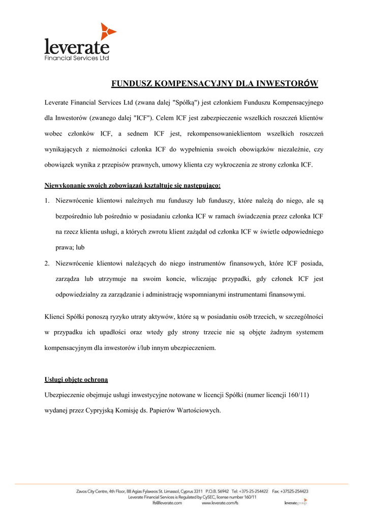 FUNDUSZ KOMPENSACYJNY DLA INWESTORÓW Leverate Financial Services Ltd (zwana dalej "Spółką") jest członkiem Funduszu Kompensacyjnego dla Inwestorów (zwanego dalej "ICF"). Celem ICF jest zabezpieczenie wszelkich roszczeń klientów wobec członków ICF, a sednem ICF jest, rekompensowanieklientom wszelkich roszczeń wynikających z niemożności członka ICF do wypełnienia swoich obowiązków niezależnie, czy obowiązek wynika z przepisów prawnych, umowy klienta czy wykroczenia ze strony członka ICF. Niewykonanie swoich zobowiązań kształtuje się następująco: 1. Niezwrócenie klientowi należnych mu funduszy lub funduszy, które należą do niego, ale są bezpośrednio lub pośrednio w posiadaniu członka ICF w ramach świadczenia przez członka ICF na rzecz klienta usługi, a których zwrotu klient zażądał od członka ICF w świetle odpowiedniego prawa; lub 2. Niezwrócenie klientowi należących do niego instrumentów finansowych, które ICF posiada, zarządza lub utrzymuje na swoim koncie, wliczając przypadki, gdy członek ICF jest odpowiedzialny za zarządzanie i administrację wspomnianymi instrumentami finansowymi. Klienci Spółki ponoszą ryzyko utraty aktywów, które są w posiadaniu osób trzecich, w szczególności w przypadku ich upadłości oraz wtedy gdy strony trzecie nie są objęte żadnym systemem kompensacyjnym dla inwestorów i/lub innym ubezpieczeniem. Usługi objęte ochroną Ubezpieczenie obejmuje usługi inwestycyjne notowane w licencji Spółki (numer licencji 160/11) wydanej przez Cypryjską Komisję ds. Papierów Wartościowych. Klienci objęci ochroną Klienci Spółki należą do kategorii objętych ochroną ICF, o ile nie mieszczą się w następujących kategoriach: 1. Następujące kategorie inwestorów instytucjonalnych i profesjonalnych a. Przedsiębiorstwa inwestycyjne. b. Osoby prawne związane ze Spółką bądź ogólnie należące do tej samej grupy spółek. c. Banki. d. Spółdzielcze instytucje kredytowe. e. Firmy ubezpieczeniowe. f. Organizacje zbiorowego inwestowania w zbywalne papiery wartościowe i ich spółki zarządzające. g. Społeczne instytucje ubezpieczeniowe i fundusze. h. Inwestorzy zaklasyfikowani przez Spółkę jako inwestorzy profesjonalni. 2. Członkowskie i organizacje ponadnarodowe. 3. Centralne, federalne, konfederacyjne, regionalne i lokalne władze administracyjne. 4. Przedsiębiorstwa powiązane ze Spółką. 5. Wszyscy pracownicy Spółki włącznie z kadrą kierowniczą i personelem administracyjnym. 6. Akcjonariusze Spółki, których bezpośredni lub pośredni udział w kapitale członka ICF wynosi co najmniej 5% kapitału zakładowego, lub jego partnerzy, którzy są osobiście odpowiedzialni za zobowiązania członka ICF, jak również osoby odpowiedzialne za przeprowadzanie kontroli finansowej członka ICF jak przewidziano w ustawie, tacy jak wykwalifikowani audytorzy. 7. Inwestorzy posiadający przedsiębiorstwa związane ze Spółką oraz ogólnie z grupą spółek, do której Spółka należy, stanowiska lub obowiązki odpowiadające wymienionym w pkt 5 i 6 powyżej 8. Krewni drugiego stopnia oraz małżonkowie osób wymienionych w pkt 5, 6 i 7, jak również osoby trzecie działających na rachunek tych osób 9. Oprócz inwestorów skazanych za przestępstwo na podstawie ustawy o zapobieganiu i zwalczaniu prania pieniędzy - 2007, wraz z późniejszymi zmianami, klienci inwestycyjni Spółki odpowiedzialni za fakty dotyczące Spółki, które spowodowały trudności finansowe, lub którzy przyczynili się do pogorszenia jej sytuacji finansowej, lub którzy skorzystali z tych faktów 10. Inwestorzy w formie spółki, która ze względu na swoją wielkość nie może sporządzać bilansu zgodnie z ustawą o spółkach lub odpowiednim prawem państwa członkowskiego. Procedura decyzji o rozpoczęciu procesu wypłaty rekompensat ICF rozpocznie proces wypłaty rekompensat w co najmniej jednej z następujących okoliczności: 1. Cypryjska Komisja ds. Papierów Wartościowych ustaliła uchwałę, że członek ICF nie jest w stanie spełnić żądania klienta pod warunkiem, że ta niezdolność wynika z jego sytuacji finansowej, która wykazuje brak perspektyw poprawy w najbliższej przyszłości; lub 2. Władza sądownicza, opierając się na racjonalnych przesłankach bezpośrednio związanych z sytuacją finansową członka wydała postanowienie z takim skutkiem, że zdolność inwestorów do wnoszenia roszczeń przeciwko niemu zostaje zawieszona, lub że istnieją zasadne roszczenia klienta; wówczas procedura wypłaty rekompensat zostaje zainicjowana. 3. Spełnienie warunku, o którym mowa w pkt 1 powyżej zakłada się: a. jeżeli członek ICF przedstawi ICF lub Cypryjskiej Komisji ds. Papierów Wartościowych pisemne oświadczenie o uchybieniu obowiązków wobec swoich klientów; b. jeżeli członek ICF złoży wniosek o likwidację, zgodnie z postanowieniami części V Prawa Spółek, lub c. jeżeli Cypryjska Komisja ds. Papierów Wartościowych odwoła lub zawiesi upoważnienie Spółki do świadczenia usług inwestycyjnych i stwierdzi, że nie oczekuje się, aby Spółka była w stanie w najbliższej przyszłości wypełnić swoje zobowiązania wobec klientów z powodów, które nie dotyczą tymczasowego braku płynności, które mogą być rozpatrywane natychmiast. Przy wydawaniu decyzji o wszczęciu wypłaty rekompensat, ICF opublikuje w co najmniej trzech gazetach o zasięgu ogólnokrajowym, a także w Dzienniku Urzędowym Republiki Cypryjskiej, zaproszenie do zabezpieczonych klientów, aby składali swoje roszczenia. Zaproszenie to przedstawi procedurę składania odpowiednich wniosków, termin ich składania oraz treść. Wnioski o rekompensaty dla zabezpieczonych klientów zgłaszających roszczenia wobec członka ICF są przedkładane ICF na piśmie. Wniosek o rekompensatę musi zawierać: a. nazwę poszkodowanego; b. adres, numery telefonu i faksu oraz adres e-mail poszkodowanego; c. 