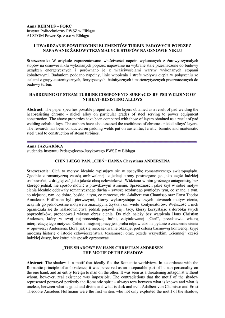 Anna REHMUS – FORC Instytut Politechniczny PWSZ w Elblągu ALSTOM Power Sp. z o.o w Elblągu UTWARDZANIE POWIERZCHNI ELEMENTÓW TURBIN PAROWYCH POPRZEZ NAPAWANIE śAROWYTRZYMAŁYCH STOPÓW NA OSNOWIE NIKLU Streszczenie: W artykule zaprezentowano właściwości napoin wykonanych z Ŝarowytrzymałych stopów na osnowie niklu wykonanych poprzez napawanie na wybrane stale przeznaczone do budowy urządzeń energetycznych i porównano je z właściwościami warstw wykonanych stopami kobaltowymi. Badaniom poddano napoiny, linię wtopienia i strefę wpływu ciepła w połączeniu ze stalami z grupy austenitycznych, ferrytycznych, bainitycznych i martenzytycznych przeznaczonych do budowy turbin. HARDENING OF STEAM TURBINE COMPONENTS SURFACES BY PSD WELDING OF NI HEAT-RESISTING ALLOYS Abstract: The paper specifies possible properties of the layers obtained as a result of pad welding the heat-resisting chrome - nickel alloy on particular grades of steel serving to power equipment construction. The above properties have been compared with those of layers obtained as a result of pad welding cobalt alloys. The authors have also assessed the usefulness of chrome - nickel alloys’ layers. The research has been conducted on padding welds put on austenitic, ferritic, bainitic and martensitic steel used to construction of steam turbines. Anna JAZGARSKA studentka Instytutu Pedagogiczno-Językowego PWSZ w Elblągu CIEŃ I JEGO PAN. „CIEŃ” HANSA Chrystiana ANDERSENA Streszczenie: Cień to motyw idealnie wpisujący się w specyfikę romantycznego światopoglądu. Zgodnie z romantyczną zasadą ambiwalencji z jednej strony postrzegano go jako część ludzkiej osobowości, z drugiej zaś jako jakość obcą człowiekowi. Widziano w nim groźnego antagonistę, bez którego jednak nie sposób mówić o prawdziwym istnieniu. Sprzeczności, jakie krył w sobie motyw cienia idealnie oddawały romantycznego ducha – zawsze rozdartego pomiędzy tym, co znane, a tym, co niejasne; tym, co dobre, boskie, a tym, co mroczne, złe. Adalbert von Chamisso oraz Ernst Teodor Amadeusz Hoffmann byli pierwszymi, którzy wykorzystując w swych utworach motyw cienia, uczynili go jednocześnie motywem znaczącym. Zyskali oni wielu kontynuatorów. Większość z nich ograniczała się do naśladownictwa, jednak pojawili się i tacy, którzy korzystając z dorobku swych poprzedników, proponowali własny obraz cienia. Do nich naleŜy bez wątpienia Hans Christian Andersen, który w swej najmroczniejszej baśni, zatytułowanej „Cień”, przedstawia własną interpretację tego motywu. Celem niniejszej pracy jest próba odpowiedzi na pytanie o znaczenie cienia w opowieści Andersena, która, jak się nieoczekiwanie okazuje, pod osłoną baśniowej konwencji kryje mroczną historię o istocie człowieczeństwa, toŜsamości oraz, przede wszystkim, „ciemnej” części ludzkiej duszy, bez której nie sposób egzystować. „THE SHADOW” BY HANS CHRISTIAN ANDERSEN THE MOTIF OF THE SHADOW Abstract: The shadow is a motif that ideally fits the Romantic worldview. In accordance with the Romantic principle of ambivalence, it was perceived as an inseparable part of human personality on the one hand, and an entity foreign to man on the other. It was seen as a threatening antagonist without whom, however, real existence was impossible. The contradictions that the motif of the shadow represented portrayed perfectly the Romantic spirit – always torn between what is known and what is unclear, between what is good and divine and what is dark and evil. Adalbert von Chamisso and Ernst Theodore Amadeus Hoffmann were the first writers who not only exploited the motif of the shadow, but also made it a significant one. They had many followers restricting themselves to sheer imitation, but there were also authors who, while drawing on the works of their predecessors, treated the concept of the shadow in their own, unique manner. One of them was undoubtedly Hans Christian Andersen, who presented his interpretation of the motif in the gloomiest of his tales, The Shadow. This paper attempts to answer the question concerning the significance of the shadow in Andersen’s tale, in which, as it unexpectedly turns out, the fable convention is employed to tell a dreary story of the essence of humanity, identity and, above all, the dark side of the human soul, without which existence is impossible. Alina CHYCZEWSKA Instytut Pedagogiczno-Językowy PWSZ w Elblągu POCZUCIE KONTROLI A POCZUCIE SENSU śYCIA U OSÓB BEZ UZALEśNIENIA I Z UZALEśNIENIEM ALKOHOLOWYM (ASPEKT REHABILITACYJNY) Streszczenie: Poczucie kontroli jako przejaw poczucia podmiotowości ułatwia nabywanie poczucia sensu Ŝycia. W artykule zawarte są wyniki badań wskazujące na zaleŜności między poczuciem kontroli a poczuciem sensu Ŝycia, zaleŜności tego typu, Ŝe wraz ze wzrostem poczucia kontroli wewnętrznej wzrasta poziom poczucia sensu Ŝycia. ZaleŜności te wystąpiły zarówno w grupie osób bez uzaleŜnienia (N=50), jak i w grupie osób z uzaleŜnieniem alkoholowym (N=50). Stwierdzone prawidłowości pozwoliły na wprowadzenie do procesu rehabilitacji alkoholików nowych propozycji oddziaływań terapeutycznych. A SENSE OF CONTROL AND A SENSE OF MEANING IN LIFE IN THE CASE OF PEOPLE ADDICTED TO ALCOHOL IN COMPARISON TO THE RESULTS OF PEOPLE FREE OF ADDICTION (REHABABILITATION ASPECT) Abstract: The paper presents results of a study on the sense of control and on the sense of meaning in life in the case of people addicted to alcohol (N=50) and in the case of people free of addiction (N=50). The alcoholics showed a lower life-satisfaction in comparison to the results of people free of addiction but they have the same level of locus of control. The higher level of sense of meaning in life was influenced by the internal locus of control in both groups. Edward Janusz JAREMCZUK Instytut Ekonomiczny PWSZ w Elblągu POMOC POLSKI DLA KRAJÓW NAJBIEDNIEJSZYCH Streszczenie: W artyku