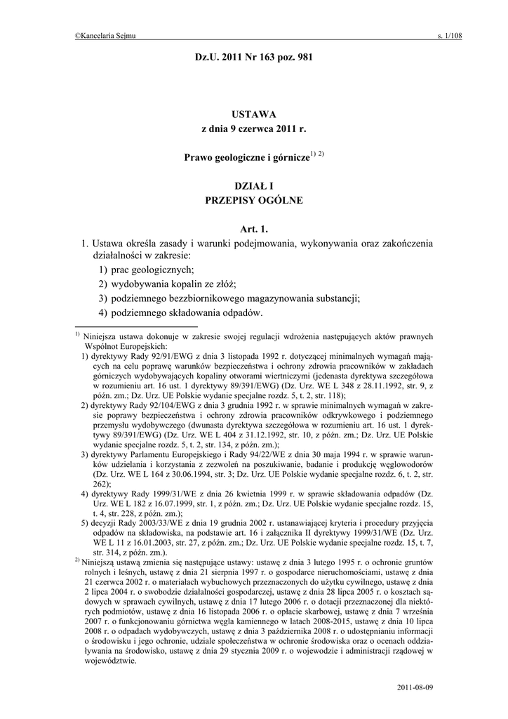 ©Kancelaria Sejmu s. 1/108 Dz.U. 2011 Nr 163 poz. 981 USTAWA z dnia 9 czerwca 2011 r. Prawo geologiczne i górnicze1) 2) DZIAŁ I PRZEPISY OGÓLNE Art. 1. 1. Ustawa określa zasady i warunki podejmowania, wykonywania oraz zakończenia działalności w zakresie: 1) prac geologicznych; 2) wydobywania kopalin ze złóż; 3) podziemnego bezzbiornikowego magazynowania substancji; 4) podziemnego składowania odpadów. 1) Niniejsza ustawa dokonuje w zakresie swojej regulacji wdrożenia następujących aktów prawnych Wspólnot Europejskich: 1) dyrektywy Rady 92/91/EWG z dnia 3 listopada 1992 r. dotyczącej minimalnych wymagań mających na celu poprawę warunków bezpieczeństwa i ochrony zdrowia pracowników w zakładach górniczych wydobywających kopaliny otworami wiertniczymi (jedenasta dyrektywa szczegółowa w rozumieniu art. 16 ust. 1 dyrektywy 89/391/EWG) (Dz. Urz. WE L 348 z 28.11.1992, str. 9, z późn. zm.; Dz. Urz. UE Polskie wydanie specjalne rozdz. 5, t. 2, str. 118); 2) dyrektywy Rady 92/104/EWG z dnia 3 grudnia 1992 r. w sprawie minimalnych wymagań w zakresie poprawy bezpieczeństwa i ochrony zdrowia pracowników odkrywkowego i podziemnego przemysłu wydobywczego (dwunasta dyrektywa szczegółowa w rozumieniu art. 16 ust. 1 dyrektywy 89/391/EWG) (Dz. Urz. WE L 404 z 31.12.1992, str. 10, z późn. zm.; Dz. Urz. UE Polskie wydanie specjalne rozdz. 5, t. 2, str. 134, z późn. zm.); 3) dyrektywy Parlamentu Europejskiego i Rady 94/22/WE z dnia 30 maja 1994 r. w sprawie warunków udzielania i korzystania z zezwoleń na poszukiwanie, badanie i produkcję węglowodorów (Dz. Urz. WE L 164 z 30.06.1994, str. 3; Dz. Urz. UE Polskie wydanie specjalne rozdz. 6, t. 2, str. 262); 4) dyrektywy Rady 1999/31/WE z dnia 26 kwietnia 1999 r. w sprawie składowania odpadów (Dz. Urz. WE L 182 z 16.07.1999, str. 1, z późn. zm.; Dz. Urz. UE Polskie wydanie specjalne rozdz. 15, t. 4, str. 228, z późn. zm.); 5) decyzji Rady 2003/33/WE z dnia 19 grudnia 2002 r. ustanawiającej kryteria i procedury przyjęcia odpadów na składowiska, na podstawie art. 16 i załącznika II dyrektywy 1999/31/WE (Dz. Urz. WE L 11 z 16.01.2003, str. 27, z późn. zm.; Dz. Urz. UE Polskie wydanie specjalne rozdz. 15, t. 7, str. 314, z późn. zm.). 2) Niniejszą ustawą zmienia się następujące ustawy: ustawę z dnia 3 lutego 1995 r. o ochronie gruntów rolnych i leśnych, ustawę z dnia 21 sierpnia 1997 r. o gospodarce nieruchomościami, ustawę z dnia 21 czerwca 2002 r. o materiałach wybuchowych przeznaczonych do użytku cywilnego, ustawę z dnia 2 lipca 2004 r. o swobodzie działalności gospodarczej, ustawę z dnia 28 lipca 2005 r. o kosztach sądowych w sprawach cywilnych, ustawę z dnia 17 lutego 2006 r. o dotacji przeznaczonej dla niektórych podmiotów, ustawę z dnia 16 listopada 2006 r. o opłacie skarbowej, ustawę z dnia 7 września 2007 r. o funkcjonowaniu górnictwa węgla kamiennego w latach 2008-2015, ustawę z dnia 10 lipca 2008 r. o odpadach wydobywczych, ustawę z dnia 3 października 2008 r. o udostępnianiu informacji o środowisku i jego ochronie, udziale społeczeństwa w ochronie środowiska oraz o ocenach oddziaływania na środowisko, ustawę z dnia 29 stycznia 2009 r. o wojewodzie i administracji rządowej w województwie. 2011-08-09 ©Kancelaria Sejmu s. 2/108 2. Ustawa określa także wymagania w zakresie ochrony złóż kopalin, wód podziemnych oraz innych elementów środowiska w związku z wykonywaniem działalności, o której mowa w ust. 1. Art. 2. 1. Przepisy ustawy, z wyjątkiem działu III, stosuje się odpowiednio do: 1) budowy, rozbudowy oraz utrzymywania systemów odwadniania zlikwidowanych zakładów górniczych; 2) robót prowadzonych w wyrobiskach zlikwidowanych podziemnych zakładów górniczych, wymienionych w przepisach wydanych na podstawie ust. 2, w celach innych niż określone ustawą, w szczególności turystycznych, leczniczych i rekreacyjnych; 3) robót podziemnych prowadzonych w celach naukowych, badawczych, doświadczalnych i szkoleniowych na potrzeby geologii i górnictwa; 4) drążenia tuneli z zastosowaniem techniki górniczej; 5) likwidacji obiektów, urządzeń oraz instalacji, o których mowa w pkt 1– 4. 2. Minister właściwy do spraw środowiska określi, w drodze rozporządzenia, zlikwidowane podziemne zakłady górnicze, o których mowa w ust. 1 pkt 2, kierując się warunkami naturalnymi i technicznymi występującymi w tych zakładach, a także potrzebą zapewnienia bezpieczeństwa oraz ochrony zdrowia i życia osób w nich przebywających. 3. Przepisy ustawy dotyczące przedsiębiorcy stosuje się odpowiednio do podmiotów, które uzyskały inne niż koncesja decyzje stanowiące podstawę wykonywania działalności regulowanej ustawą. Art. 3. Ustawy nie stosuje się do: 1) korzystania z wód w zakresie uregulowanym odrębnymi przepisami; 2) wykonywania wkopów oraz otworów wiertniczych o głębokości do 30 m w celu wykorzystania ciepła Ziemi, poza obszarami górniczymi; 3) badań naukowych i działalności dydaktycznej, prowadzonych bez wykonywania robót geologicznych; 4) pozyskiwania okazów minerałów, skał i skamielin w celach naukowych, kolekcjonerskich i dydaktycznych, prowadzonego bez wykonywania robót górniczych; 5) wykonywania robót związanych ze sztucznym zasilaniem strefy brzegowej piaskiem, pochodzącym z osadów dennych obszarów morskich Rzeczypospolitej Polskiej; 6) wydobywania kruszywa w zakresie niezbędnym do wykonania pilnych prac zabezpieczających przed powodzią w czasie obowiązywania stanu klęski żywiołowej; 7) ustalania geotechnicznych warunków posadawiania obiektów budowlanych bez wykonywania robót geologicznych. Art. 4. 1. Przepisów działu III–VIII oraz art. 168–174 nie stosuje się do wydobywania piasków i żwirów, przeznaczonych dla zaspokojenia potrzeb własnych osoby fizycz2011-08-09 ©Kancelaria Sejmu s. 3/108 nej, z nieruchomości stanowiących przedmiot jej prawa własności (użytkowania w