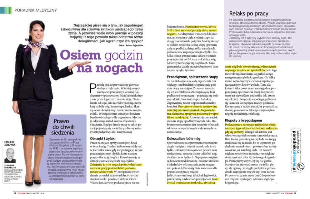 PORADNIK MEDYCZNY Relaks po pracy Najczęściej pisze się o tym, jak zapobiegać szkodliwym dla zdrowia skutkom siedzącego trybu życia. A przecież wiele osób pracuje w pozycji stojącej i z tego powodu także odczuwa różne dolegliwości. Jak ograniczyć ich ryzyko? li nieruchomo. Pamiętajmy o tym, aby co 5-10 minut zmieniać pozycję ciała, ruszać nogami. Ale dreptanie w miejscu lub przenoszenie ciężaru ciała z jednej stopy na drugą daje niewiele pożytku. Należy stanąć w lekkim rozkroku. Jedną stopę opieramy całą na podłożu, drugą tylko na palcach, jednocześnie napinając mięśnie łydki. Co kilka minut powtarzamy takie ćwiczenie przynajmniej po 2-3 razy na każdą z nóg. Możemy też wspiąć się na palcach. Taka gimnastyka działa przeciwobrzękowo i zmniejsza ryzyko żylaków. Tekst: Jolanta Dyjecińska Osiem godzin na nogach Przeciążone, spłaszczone stopy To na nich opiera się cały ciężar ciała. Im większy, tym bardziej się spłaszczają podczas pracy na stojąco. Z czasem zmienia się ich architektura. Zmniejszają się łuki podłużne i poprzeczny – pojawiają się bolesne odciski, bóle śródstopia, halluksy. Zapewnijmy zatem stopom maksymalny komfort. Pracujmy w obuwiu sportowym, najlepiej przeznaczonym do biegania, bo ma elastyczną, sprężystą podeszwę i wyprofilowaną wkładkę. Amortyzuje ono nacisk ciała na stopy i podtrzymuje ich łuki. Dobrym rozwiązaniem jest noszenie w butach wkładek ortopedycznych wykonanych na zamówienie. Obrzęki i żylaki Dokuczliwe bóle nóg Prawo do chwili siedzenia EKSPERT zdrowia dr Adrian Rymarczyk, specjalista chirurg ortopeda traumatolog Centrum Medyczne Achilles, www.achillesmed.pl 18 zdrowie odkryj radość życia Zapewnia je 49. paragraf rozporządzenia Ministra Pracy i Polityki Socjalnej z 26 września 1997 r. w sprawie ogólnych przepisów bezpieczeństwa i higieny pracy. Przy wykonywaniu pracy niewymagającej stale pozycji stojącej pracownikom należy zapewnić możliwość siedzenia. Jeśli muszą cały czas stać lub chodzić, pracodawca musi im zapewnić możliwość odpoczynku w pobliżu miejsca pracy w pozycji siedzącej. Praca na stojąco sprzyja zastojowi krwi w żyłach nóg. Trudno jej bowiem odpłynąć w kierunku serca, gdy nie pomaga jej w tym praca mięśni stóp i łydek, które niczym pompa tłoczą ją do góry. Konsekwencją są obrzęki, uczucie ciężkich nóg, żylaki. Zaleganiu krwi w nogach przeciwdziała noszenie w pracy pończoch lub podkolanówek uciskowych. W przypadku stwierdzenia przewlekłej niewydolności żylnej stopień ucisku powinien dobrać lekarz. Ważne jest, abyśmy podczas pracy nie sta- FOT. shutterstock P Spowodowane są ogromnym zmęczeniem ciągle napiętych mięśni przodu uda i tyłu łydki. Jeśli nie zostaną one co pewien czas rozluźnione, pojawia się nie tylko ból nóg, ale i kurcze w łydkach. Naprężone mięśnie są bowiem niedokrwione. Brakuje im tlenu i składników odżywczych, m.in. magnezu i potasu, które mają duże znaczenie dla prawidłowej pracy mięśni. Jeśli chcemy uniknąć takich dolegliwości, pamiętajmy o właściwej pozycji ciała. Należy stać w niedużym rozkroku, aby obcią- żenie nóg było równomierne, jednocześnie napinając mięśnie ud i pośladków. Jeśli tego nie zrobimy, zaczniemy się garbić, czego następstwem są bóle kręgosłupa. Co kilka minut wykonujemy ćwiczenia zapobiegające zastojowi krwi w żyłach. Tym, dla których taka pozycja jest niewygodna, proponujemy opieranie raz lewej, raz prawej stopy na niewielkim podnóżku (ok. 10 cm wysokości). Pozycja ta zapobiega garbieniu się i zmusza do napięcia mięśni pośladka. Korzystajmy z każdej okazji, by przysiąść na chwilę, ponieważ w takiej pozycji mięśnie nóg się rozluźniają, relaksują. Kłopoty z kręgosłupem Podczas pracy na stojąco najbardziej obciążony jest jego odcinek lędźwiowy, zwłaszcza gdy się garbimy. Dlatego tak istotne jest właściwe zaprojektowanie stanowiska pracy. Blat, taśma produkcyjna czy lada nie mogą znajdować się za nisko, bo to wymusza pochylanie się nad nimi, i powinny być umiejscowione jak najbliżej ciała. Im bowiem większe wychylenie tułowia, tym większe obciążenie odcinka lędźwiowego kręgosłupa. Pamiętajmy o tym, by się nie garbić. Starajmy się trzymać prosto nie tylko plecy, ale i głowę. Jej ciągłe pochylenie prowadzi do naprężenia mięśni szyi oraz karku. Po pewnym czasie może dojść do przykurczu mięśni i dyskopatii odcinka szyjnego kręgosłupa. n odkryj radość życia Więcej porad na rawdą jest, że prowadzimy głównie siedzący tryb życia. W takiej pozycji najczęściej pracujemy i w takiej najchętniej wypoczywamy. Jednakże niektórzy z nas przez 8 godzin dziennie stoją. Niezależnie od tego, jaki zawód wykonują, narzekają na bóle nóg, kręgosłupa, karku. Skarżą się na obrzęki stóp, łydek, kurcze mięśni, żylaki. Wielogodzinne stanie jest bowiem bardzo obciążające dla organizmu. Mocno je odczuwają układ kostno-mięśniowy i krążenia. Stąd po latach pracy w takiej pozycji pojawiają się nie tylko problemy natury ortopedycznej, ale i naczyniowej. Po powrocie do domu warto poleżeć z nogami opartymi o ścianę, aby zlikwidować obrzęk. W jego usunięciu pomoże też polewanie nóg chłodnym strumieniem wody, prowadzonym od stóp do kolan. Potem można wykonać prosty masaż. Przesuwamy kilka, kilkanaście razy ręce od palców do kolan, uciskając ciało. Zadbajmy też o aktywny wypoczynek, choćby po to, aby usprawnić krążenie. Zmęczonym mięśniom dobrze zrobi spacer, pływanie, rekreacyjna jazda na rowerze przez 30 minut. Te formy aktywności fizycznej można traktować jako rozgrzewkę przed uprawianiem innych sportów, takich jak np. bieganie czy gra w tenisa. Bez niej może szybko dojść do kontuzji. zdrowie 19