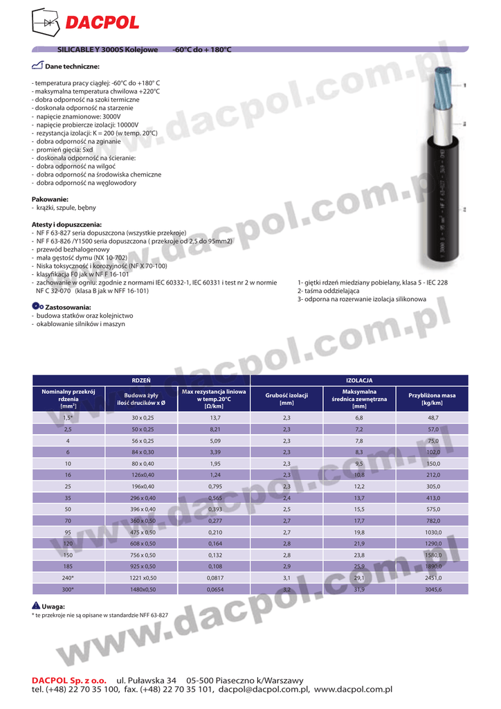 SILICABLE Y 3000S Kolejowe -60°C do + 180°C Dane techniczne: - temperatura pracy ciągłej: -60°C do +180° C - maksymalna temperatura chwilowa +220°C - dobra odporność na szoki termiczne - doskonała odporność na starzenie - napięcie znamionowe: 3000V - napięcie probiercze izolacji: 10000V - rezystancja izolacji: K = 200 (w temp. 20°C) - dobra odporność na zginanie - promień gięcia: 5xd - doskonała odporność na ścieranie: - dobra odporność na wilgoć - dobra odporność na środowiska chemiczne - dobra odporność na węglowodory Pakowanie: - krążki, szpule, bębny Atesty i dopuszczenia: - NF F 63-827 seria dopuszczona (wszystkie przekroje) - NF F 63-826 /Y1500 seria dopuszczona ( przekroje od 2,5 do 95mm2) - przewód bezhalogenowy - mała gęstość dymu (NX 10-702) - Niska toksyczność i korozyjność (NF X 70-100) - klasyfikacja F0 jak w NF F 16-101 - zachowanie w ogniu: zgodnie z normami IEC 60332-1, IEC 60331 i test nr 2 w normie NF C 32-070 (klasa B jak w NFF 16-101) 1- giętki rdzeń miedziany pobielany, klasa 5 - IEC 228 2- taśma oddzielająca 3- odporna na rozerwanie izolacja silikonowa Zastosowania: - budowa statków oraz kolejnictwo - okablowanie silników i maszyn RDZEŃ Nominalny przekrój rdzenia [mm2] Budowa żyły ilość drucików x Ø IZOLACJA Max rezystancja liniowa w temp.20°C [Ω/km] Grubość izolacji [mm] Maksymalna średnica zewnętrzna [mm] Przybliżona masa [kg/km] 1,5* 30 x 0,25 13,7 2,3 6,8 48,7 2,5 50 x 0,25 8,21 2,3 7,2 57,0 4 56 x 0,25 5,09 2,3 7,8 75,0 6 84 x 0,30 3,39 2,3 8,3 102,0 150,0 10 80 x 0,40 1,95 2,3 9,5 16 126x0,40 1,24 2,3 10,8 212,0 25 196x0,40 0,795 2,3 12,2 305,0 35 296 x 0,40 0,565 2,4 13,7 413,0 50 396 x 0,40 0,393 2,5 15,5 575,0 70 360 x 0,50 0,277 2,7 17,7 782,0 95 475 x 0,50 0,210 2,7 19,8 1030,0 120 608 x 0,50 0,164 2,8 21,9 1290,0 150 756 x 0,50 0,132 2,8 23,8 1580,0 185 925 x 0,50 0,108 2,9 25,9 1890,0 240* 1221 x0,50 0,0817 3,1 29,1 2451,0 300* 1480x0,50 0,0654 3,2 31,9 3045,6 ! Uwaga: * te przekroje nie są opisane w standardzie NFF 63-827 Dacpol Sp. z o.o. ul. Puławska 34 05-500 Piaseczno k/Warszawy tel. (+48) 22 70 35 100, fax. (+48) 22 70 35 101, [email protected], www.dacpol.com.pl