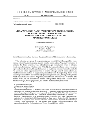 „Krasnoludki są na świecie” (i w przekładzie). O angielskim tłumaczeniu… POLI LOG. STUDIA NEOFILOLOGICZNE nr 6 107 2016 ss. 107-120 ISSN 2083-5485 © Copyright by Institute of Modern Languages of the Pomeranian University in Słupsk Received: Accepted: Original research paper 30.09.2015 25.05.2016 „KRASNOLUDKI SĄ NA ŚWIECIE” (I W PRZEKŁADZIE). O ANGIELSKIM TŁUMACZENIU O KRASNOLUDKACH I O SIEROTCE MARYSI MARII KONOPNICKIEJ Aleksandra Budrewicz Uniwersytet Pedagogiczny Kraków, Polska [email protected] Słowa kluczowe: przekład, literatura dla dzieci, literatura XIX wieku, nazwy własne, religia Tytuł artykułu nawiązuje do rozpoczynającego powieść Marii Konopnickiej rymowanego wierszyka, zawierającego pytanie o status krasnoludka1. W pozytywistycznej literaturze dla dzieci kwestionowano odziedziczoną po romantyzmie wiarę w istnienie świata nierealistycznego [Cieślikowski 1973: 5], stąd element wahania i niepewności we wprowadzeniu do utworu, którego bohaterami są w głównej mierze właśnie krasnoludki. Nie jest moim celem zajęcie stanowiska w kwestii ontologii samych krasnoludków, ale przedstawienie ich statusu w angielskim przekładzie baśni Konopnickiej. Tekst polski ukazał się w roku 1895, zaś urozmaicały go ilustracje niemieckie, które powstały krótko przed drukiem Krasnoludków. Angielski przekład baśni opublikowano w 1929 r. Tłumaczką była Kate Żuk-Skarszewska z domu Hadley (1868-1950), żona Tadeusza Żuka-Skarszewskiego, polskiego pisarza2, zaś autorką ilustracji Molly Bukowska. ——————— 1 „Czy to bajka, czy nie bajka, Myślcie sobie, jak tam chcecie. A ja przecież wam powiadam: Krasnoludki są na świecie!” [Konopnicka 1988: 149]. Wszystkie cytaty z utworu Konopnickiej pochodzą z tego wydania; oznaczam je skrótem „K”, z podaniem numeru strony bezpośrednio po cytacie. Angielski przekład tego utworu cytuję za edycją: Konopnicka 1929. Wszystkie cytaty z tego tłumaczenia oznaczam skrótem „BS”, z podaniem numeru strony bezpośrednio po nawiasie. 2 Ślub Kate i Tadeusza odbył się w angielskim mieście Brighton w 1897 roku. Dwa lata później małżonkowie wyjechali do Polski i zamieszkali na długi czas w Krakowie. Żuk-Skarszewska tłumaczyła na angielski wiele polskich utworów literackich (np. Zygmunta Nowakowskiego Przylądek Dobrej Nadziei jako The Cape of Good Hope, London 1941). Korespondowała z Josephem Conradem (The Collected Letters of Joseph Conrad 2008, s. LXIX). 108 Aleksandra Budrewicz Specyfika przekładu literatury dla dzieci Podjęty przeze mnie temat wiąże się z dwiema obszernymi kwestiami: interkulturowością oraz specyfiką literatury dziecięcej w ogóle3, a w szczególności w przekładzie literackim [Morar 2009: 29-34; Webb Joels 1999: 65-83; Lathey 2012: 195-217]. Często (choć błędnie) literaturę dla dzieci postrzega się jako łatwiejszą i prostszą w odbiorze i interpretacji niż literaturę dla dorosłych. Tak uproszczone jej postrzeganie jest błędne i krzywdzące, czego dowieść może na przykład analiza statusu takich tekstów w przekładzie na języki obce lub wypowiedzi samych tłumaczy [zob. np. Barańczak 1975: 72-86]. Kwestię tę podnosiła także Elżbieta Skibińska. Zwracała ona uwagę, że przekład literatury dziecięcej kryje w sobie potencjał kulturotwórczy, pozwala uświadomić sobie przynależność do większej grupy społecznej, a zarazem konieczność otworzenia się na odmienność [Skibińska 2001: 6; Waleryszak 2006: 61]. Zjawisko przekładu literatury dla dzieci (children’s literature translation) sytuuje się więc na pograniczu przekładoznawstwa i badań nad literaturą dziecięcą4. Często podejmowanym problemem jest kwestia metod tłumaczenia utworów dla dzieci. Niektórzy badacze i praktycy przekładu (np. Carmen Bravo-Villasante, Birgit Stolt) opowiadają się przeciwko adaptacjom i przeróbkom. Göte Klingberg dodaje, że skoro sami autorzy tekstów dla dzieci dostosowują je do potrzeb dziecka, to nie trzeba stwarzać kolejnej warstwy adaptacji kontekstowej („context adaptation”). Z kolei Maria Nikolajeva twierdzi, że najlepsze przekłady literatury dziecięcej nie zawsze są rezultatem wierności oryginałowi; odstępstwa od oryginału są pożądane, pod warunkiem, że prowadzą do recepcji przekładu podobnej do recepcji oryginału [Niklolajeva 1996: 27-28, w: Liseling-Nilsson 2006: 70]. Tematem przekładu literatury dziecięcej zajmuje się wielu badaczy polskich. Znawczyni tego zagadnienia, Izabela Szymańska, podkreśla, że niski status5 literatury dziecięcej w tzw. polisystemach literackich niejednokrotnie powoduje manipulacje, które z kolei uważa się za dopuszczalne i uzasadnione w tekstach dla dzieci6 ze względu na nadrzędny cel, jakim jest zrozumiałość oraz dostosowanie tekstu do potrzeb młodego odbiorcy (inaczej dzieje się w przekładach literatury dla dorosłych). Częsty skutek tolerowania manipulacji w przekładach stanowi powstawanie odmiennych wersji tego samego tekstu [Szymańska 2014: 195]. Pisząc o problemach tłumaczenia literatury dla dzieci, Monika Adamczyk-Garbowska zwraca uwagę, że na zniekształcenia narażone są zwłaszcza fragmenty humorystyczne i ironiczne. Wynikają one często z niepełnego zrozumienia intencji autora [Adamczyk-Garbowska 1988: 48, 50]. Ważne są także słowa czy partie tekstu nacechowane kulturowo; sposób ich potraktowania ujawni, czy tekst jest przekładem, czy też już adaptacją. Prze——————— 3 Eithne O’Connell zwraca uwagę na trudności z samą definicją pojęcia „literatura dla dzieci” [O’Connell 2003: 16]. 4 Michał Borodo przedstawia skrótowy opis zarysu badań nad tym zagadnieniem w artykule Children’s Literature Translation Studies? [Borodo 2006: 12-23]. 5 Ten aspekt w badaniach literatury dla dzieci podkreśliła także Elżbieta Skibińska, pisząc o polskim przekładzie francuskiego komiksu drukowanego w piś