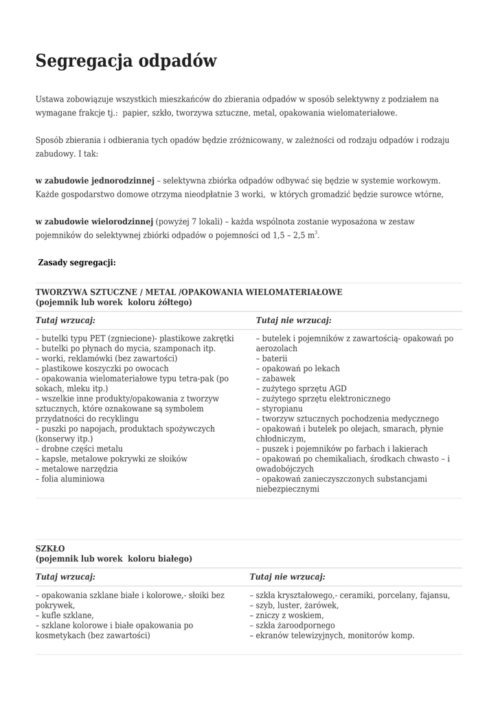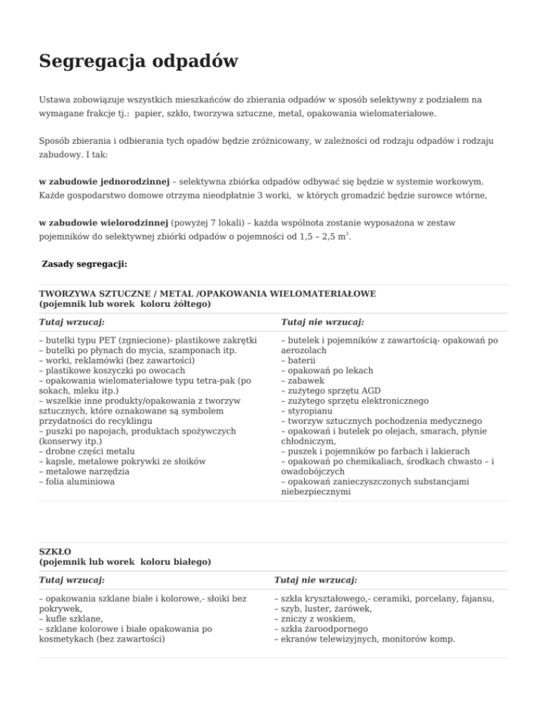 Segregacja odpadów Ustawa zobowiązuje wszystkich mieszkańców do zbierania odpadów w sposób selektywny z podziałem na wymagane frakcje tj.: papier, szkło, tworzywa sztuczne, metal, opakowania wielomateriałowe. Sposób zbierania i odbierania tych opadów będzie zróżnicowany, w zależności od rodzaju odpadów i rodzaju zabudowy. I tak: w zabudowie jednorodzinnej – selektywna zbiórka odpadów odbywać się będzie w systemie workowym. Każde gospodarstwo domowe otrzyma nieodpłatnie 3 worki, w których gromadzić będzie surowce wtórne, w zabudowie wielorodzinnej (powyżej 7 lokali) – każda wspólnota zostanie wyposażona w zestaw pojemników do selektywnej zbiórki odpadów o pojemności od 1,5 – 2,5 m3. Zasady segregacji: TWORZYWA SZTUCZNE / METAL /OPAKOWANIA WIELOMATERIAŁOWE (pojemnik lub worek koloru żółtego) Tutaj wrzucaj: Tutaj nie wrzucaj: – butelki typu PET (zgniecione)- plastikowe zakrętki – butelki po płynach do mycia, szamponach itp. – worki, reklamówki (bez zawartości) – plastikowe koszyczki po owocach – opakowania wielomateriałowe typu tetra-pak (po sokach, mleku itp.) – wszelkie inne produkty/opakowania z tworzyw sztucznych, które oznakowane są symbolem przydatności do recyklingu – puszki po napojach, produktach spożywczych (konserwy itp.) – drobne części metalu – kapsle, metalowe pokrywki ze słoików – metalowe narzędzia – folia aluminiowa – butelek i pojemników z zawartością- opakowań po aerozolach – baterii – opakowań po lekach – zabawek – zużytego sprzętu AGD – zużytego sprzętu elektronicznego – styropianu – tworzyw sztucznych pochodzenia medycznego – opakowań i butelek po olejach, smarach, płynie chłodniczym, – puszek i pojemników po farbach i lakierach – opakowań po chemikaliach, środkach chwasto – i owadobójczych – opakowań zanieczyszczonych substancjami niebezpiecznymi SZKŁO (pojemnik lub worek koloru białego) Tutaj wrzucaj: Tutaj nie wrzucaj: – opakowania szklane białe i kolorowe,- słoiki bez pokrywek, – kufle szklane, – szklane kolorowe i białe opakowania po kosmetykach (bez zawartości) – szkła kryształowego,- ceramiki, porcelany, fajansu, – szyb, luster, żarówek, – zniczy z woskiem, – szkła żaroodpornego – ekranów telewizyjnych, monitorów komp. PAPIER / TEKTURA (pojemnik lub worek koloru niebieskiego) Tutaj wrzucaj: Tutaj nie wrzucaj: – gazety, książki, zeszyty,- katalogi, ulotki, foldery, – torby i worki papierowe, – tekturę i kartony oraz opakowanie wykonane z tych surowców. – opakowań z zawartością np. żywnością, cementem,- kalki technicznej – brudnego i tłustego papieru, – pieluch jednorazowych, – tapet wapnem, ODPADY ULEGAJACE BIODEGRADACJI (pojemnik lub worek koloru brązowego) Tutaj wrzucaj: Tutaj nie wrzucaj: -trawa, liście- małe kawałki drewna, np. gałązki po przycinaniu drzew – kwiaty cięte i doniczkowe. Tutaj możesz wrzucać także: – resztki owoców i warzyw – skorupki po jajkach i orzechach – skórki po owocach i warzywach, -resztek ryb, wędlin, mięs, kości,- folii i reklamówek, – pampersów, tekstyliów, – papieru lakierowanego lub foliowanego, – zatłuszczonego i brudnego papieru – płynnych odpadów kuchennych, – odpadów higienicznych, leków, – kamieni, popiołu i żużlu, – odpadów niebiodegradowalnych Odpady biodegradowalane tj. resztki żywności, skoszona trawa, liście, chwasty, drobne gałęzie i inne odpady roślinne będzie można składować w przydomowym kompostowniku. Ponadto odpady te można zbierać w workach koloru brązowego i samodzielnie dostarczyć do GPZO w Poloniszu. Posegregowane odpady w workach będą odbierane raz na 2 miesiące. Szczegółowy harmonogram, a także sposób odbioru odpadów komunalnych zostanie podany do wiadomości w późniejszym terminie, po rozstrzygnięciu przetargu na odbiór odpadów komunalnych na terenie Gminy Babiak. W wyznaczonym dniu zapełnione worki należy wystawić przed posesję w dobrze widocznym i łatwo dostępnym miejscu, najpóźniej do godziny 7:00. Jeśli zdarzy się, że ktoś zapomni wystawić worki albo zrobi to zbyt późno, worki nie zostaną odebrane. W takim przypadku worki należy wystawić w następnym terminie wyznaczonym w harmonogramie lub dowieźć do Gminnego Punktu Zbiórki Odpadów w Poloniszu. W miarę możliwości worki należy zapełnić maksymalnie, nie powodując ich przepełnienia, tak aby była możliwość zawiązania worków. Wystawiamy tylko zapełnione worki, np. jeśli worek na makulaturę nie jest jeszcze zapełniony nie trzeba wystawiać go przy każdym odbiorze. Jedynie wtedy, kiedy się zapełni. Przedsiębiorca odbierając worki z surowcami wtórnymi, zostawi po jednym worku w takim kolorze w jakim zostały wystawione do odebrania, np. jeśli wystawimy worek żółty i niebieski, przedsiębiorca zostawi po jednym worku żółtym i niebieskim. Jeśli natomiast otrzymana ilość worków będzie niewystarczająca istnieje możliwość indywidualnego ich odbioru u Sołtysa lub w Urzędzie Gminy w Babiaku.