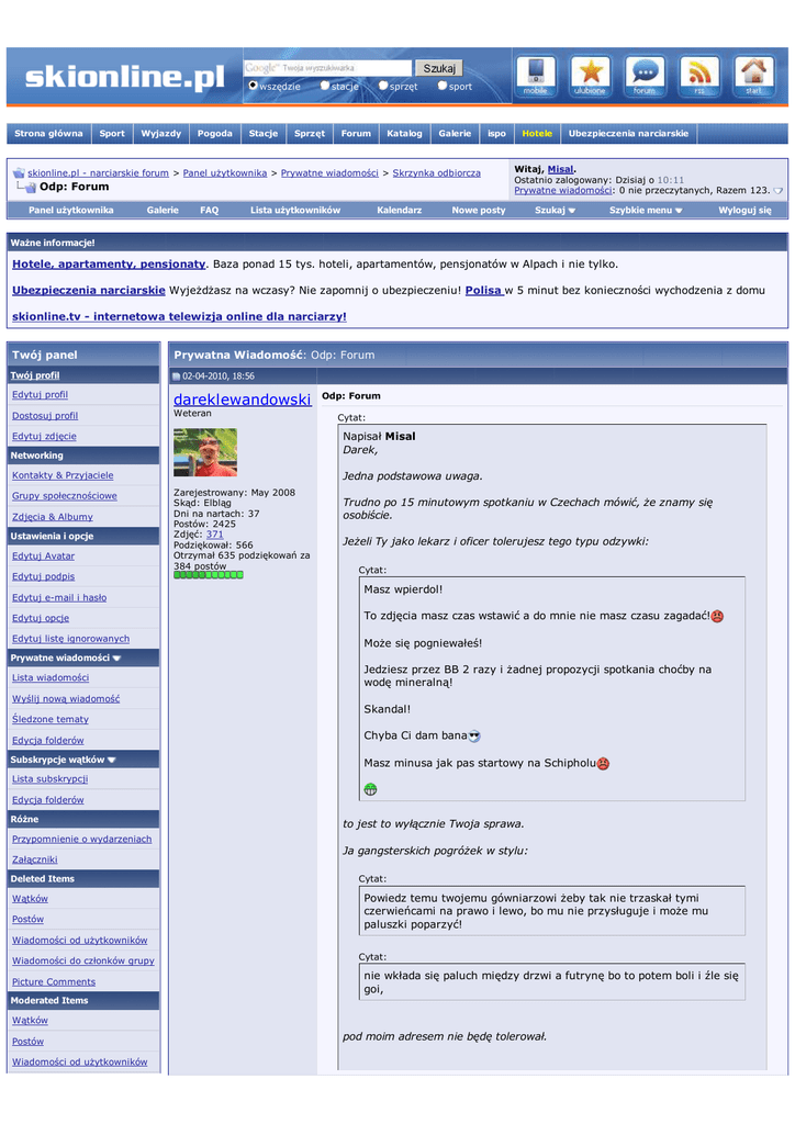 wszędzie Strona główna Sport Wyjazdy Pogoda Stacje stacje Sprzęt sprzęt Forum Katalog sport Galerie ispo skionline.pl - narciarskie forum > Panel uŜytkownika > Prywatne wiadomości > Skrzynka odbiorcza Odp: Forum Panel uŜytkownika Galerie FAQ Lista uŜytkowników Kalendarz Hotele Ubezpieczenia narciarskie Witaj, Misal. Ostatnio zalogowany: Dzisiaj o 10:11 Prywatne wiadomości: 0 nie przeczytanych, Razem 123. Nowe posty Szukaj Szybkie menu Wyloguj się WaŜne informacje! Hotele, apartamenty, pensjonaty. Baza ponad 15 tys. hoteli, apartamentów, pensjonatów w Alpach i nie tylko. Ubezpieczenia narciarskie WyjeŜdŜasz na wczasy? Nie zapomnij o ubezpieczeniu! Polisa w 5 minut bez konieczności wychodzenia z domu skionline.tv - internetowa telewizja online dla narciarzy! Twój panel Twój profil Prywatna Wiadomość: Odp: Forum 02-04-2010, 18:56 Edytuj profil dareklewandowski Dostosuj profil Weteran Jedna podstawowa uwaga. Kontakty & Przyjaciele Zdjęcia & Albumy Ustawienia i opcje Edytuj Avatar Edytuj podpis Edytuj e-mail i hasło Cytat: Napisał Misal Darek, Edytuj zdjęcie Networking Grupy społecznościowe Odp: Forum Zarejestrowany: May 2008 Skąd: Elbląg Dni na nartach: 37 Postów: 2425 Zdjęć: 371 Podziękował: 566 Otrzymał 635 podziękowań za 384 postów Trudno po 15 minutowym spotkaniu w Czechach mówić, Ŝe znamy się osobiście. JeŜeli Ty jako lekarz i oficer tolerujesz tego typu odzywki: Cytat: Masz wpierdol! Edytuj opcje To zdjęcia masz czas wstawić a do mnie nie masz czasu zagadać! Edytuj listę ignorowanych MoŜe się pogniewałeś! Prywatne wiadomości Lista wiadomości Jedziesz przez BB 2 razy i Ŝadnej propozycji spotkania choćby na wodę mineralną! Wyślij nową wiadomość Skandal! Śledzone tematy Edycja folderów Chyba Ci dam bana Subskrypcje wątków Masz minusa jak pas startowy na Schipholu Lista subskrypcji Edycja folderów RóŜne to jest to wyłącznie Twoja sprawa. Przypomnienie o wydarzeniach Załączniki Deleted Items Wątków Postów Ja gangsterskich pogróŜek w stylu: Cytat: Powiedz temu twojemu gówniarzowi Ŝeby tak nie trzaskał tymi czerwieńcami na prawo i lewo, bo mu nie przysługuje i moŜe mu paluszki poparzyć! Wiadomości od uŜytkowników Wiadomości do członków grupy Picture Comments Cytat: nie wkłada się paluch między drzwi a futrynę bo to potem boli i źle się goi, Moderated Items Wątków Postów Wiadomości od uŜytkowników pod moim adresem nie będę tolerował. Wiadomości do członków grupy Powiem szczerze, Ŝe nie miałem ochoty spotykać się z Tobą i Johnnym w weekend na nartach. Wiesz B-B, Elbląg są dość daleko od Warszawy, ja Ŝyję w pewnym środowisku, równieŜ narciarskim. Moi znajomi, bywają na skionline. Ostatnio coraz częściej się mnie pytają, co ja tam robię. Wątek o ciąŜy z mocno niewybrednymi, mocno szowinistycznymi postami forumowych tuzów (w tym równieŜ Twój post), zdjęcie z klubu GO-GO Szpaary wsadzone do wątku przez SB, usunięte przez JC i powtórzone przez DZW, czy ostatnio wątek "Przestroga...." to nie są klimaty z którymi mogę się utoŜsamiać. Nie wiem czy zauwaŜyłeś, Ŝe kilku innych wartościowych osób (Bobic, Homar) nie ma od dawna na forum. Sposób prowadzenia dyskusji, narzucony przez SB, powoduje, Ŝe skionline idzie w kierunku forum klasy gazeta.pl, onet.pl Wszelkie próby zawrócenia z tej drogi są skutecznie torpedowane przez "Towarzystwo Wzajemnej Adoracji" (określenie z PM-ów otrzymywanych przeze mnie). Picture Comments Album Pictures Nie mam ochoty pisać na forum, jeŜeli kaŜdy mój post taki jak ten w wątku "Warunki narciarskie" spotyka się z taką a nie inną reakcją, a sam jestem określany mianem "Bufon". Mam na forum do załatwienia jeszcze jedną rzecz. Muszę doprowadzić do końca sprawę nagród w Pucharze Prezesa (czekam na ostatnią przesyłkę z Austrii, powinienem ją dostać zaraz po Świętach). Nie wiem czy wrócę do dawnej aktywności. W sumie forum zajmowało mi przez rok wiele czasu. Obecnie jestem na etapie rozszerzania swojej działalności, a doba ma tylko 24 godziny. W sprawach czysto formalnych, to jak coś pisze do Ciebie na PM-a tzn, Ŝe nie mam ochoty aby to pojawiało się publicznie. W styczniu kiedy napisałeś co będę robił w weekend z Niedzielą Palmową i po tym weekendzie, informacje zamieszczone przez Ciebie narobiły mi trochę bigosu. Teraz teŜ - pytanie o to czy będę w poprzednią sobotę w Zakopcu było skierowane do mnie. Pytający dostał ode mnie odpowiedź. Ty nie musiałeś bawić się w mojego rzecznika prasowego. Wesołych Świąt, pzdr Michał Przetoczone posty nie są mojego autorstwa,za innych nie mogę się tłumaczyć,ani być karcony jak gówniarz Co do tematu ciązy sprawę uwaŜam za zamknietą juŜ dawno,nie wiem co w moich postach w tym temacie było obraźliwego,czy kłamliwego.Wiem,ze kaŜdy w tym kraju czuje się najmądrzejszy z wszystkich tematów.Co do poznania osobistego ,no cóź jeśli tak uwaŜasz,to moŜe masz rację Tylko dziwi mnie,Ŝe wcześniej nie napisałeś na PM,Ŝe nie chcesz się spotkać w Zakopcu .oczywiście i tak wszyscy przypuszczali... Chciałem tylko,aby wszystko powróciło do normalności,to Wy razem z Sławkiem stnowicie elitę tego Forum i chyba moŜna dojść do porozumienia Na Forum nie jestem oficerem,czy lekarzem,ale jak kaŜdy inny uŜytkownik -narciarzem,a to,Ŝe czasami zabiorę zdanie w temacie zbliŜonym mojej profesji,tak pozostali,którzy mają większą wiedzę w innych dziedzinach Co tyczy się Homara,to nie wiem jakie ma problemy 18-latek,który od pewnego czasu nie jest na forum .Dzięki za odpowiedź RównieŜ Ŝyczę Tobie i Salwerowi udanego wypoczynku światecznego i więcej dystansu do swojej Osoby,a wtedy Ŝyje się łatwiej Czasami warto rozmawiać ,a nie trzymać w sobie i oddalać się od innych Z szacunkiem i pozdrowieniem.Lewy Kasuj wiadomość Kasuj wiadomość Aby usunąć wiadomość, zobacz wszystkie poniŜsze opcje i j