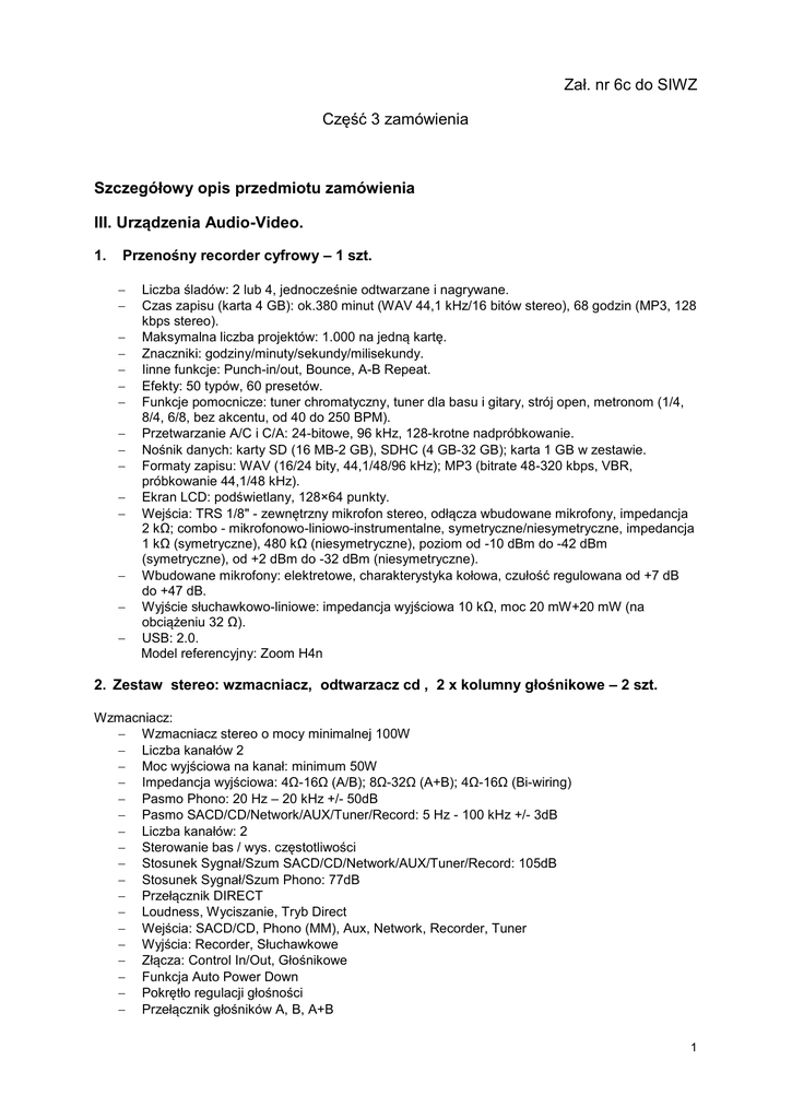 Zał. nr 6c do SIWZ Część 3 zamówienia Szczegółowy opis przedmiotu zamówienia III. Urządzenia Audio-Video. 1. Przenośny recorder cyfrowy – 1 szt. Liczba śladów: 2 lub 4, jednocześnie odtwarzane i nagrywane. Czas zapisu (karta 4 GB): ok.380 minut (WAV 44,1 kHz/16 bitów stereo), 68 godzin (MP3, 128 kbps stereo). Maksymalna liczba projektów: 1.000 na jedną kartę. Znaczniki: godziny/minuty/sekundy/milisekundy. Iinne funkcje: Punch-in/out, Bounce, A-B Repeat. Efekty: 50 typów, 60 presetów. Funkcje pomocnicze: tuner chromatyczny, tuner dla basu i gitary, strój open, metronom (1/4, 8/4, 6/8, bez akcentu, od 40 do 250 BPM). Przetwarzanie A/C i C/A: 24-bitowe, 96 kHz, 128-krotne nadpróbkowanie. Nośnik danych: karty SD (16 MB-2 GB), SDHC (4 GB-32 GB); karta 1 GB w zestawie. Formaty zapisu: WAV (16/24 bity, 44,1/48/96 kHz); MP3 (bitrate 48-320 kbps, VBR, próbkowanie 44,1/48 kHz). Ekran LCD: podświetlany, 128×64 punkty. Wejścia: TRS 1/8" - zewnętrzny mikrofon stereo, odłącza wbudowane mikrofony, impedancja 2 kΩ; combo - mikrofonowo-liniowo-instrumentalne, symetryczne/niesymetryczne, impedancja 1 kΩ (symetryczne), 480 kΩ (niesymetryczne), poziom od -10 dBm do -42 dBm (symetryczne), od +2 dBm do -32 dBm (niesymetryczne). Wbudowane mikrofony: elektretowe, charakterystyka kołowa, czułość regulowana od +7 dB do +47 dB. Wyjście słuchawkowo-liniowe: impedancja wyjściowa 10 kΩ, moc 20 mW+20 mW (na obciążeniu 32 Ω). USB: 2.0. Model referencyjny: Zoom H4n 2. Zestaw stereo: wzmacniacz, odtwarzacz cd , 2 x kolumny głośnikowe – 2 szt. Wzmacniacz: Wzmacniacz stereo o mocy minimalnej 100W Liczba kanałów 2 Moc wyjściowa na kanał: minimum 50W Impedancja wyjściowa: 4Ω-16Ω (A/B); 8Ω-32Ω (A+B); 4Ω-16Ω (Bi-wiring) Pasmo Phono: 20 Hz – 20 kHz +/- 50dB Pasmo SACD/CD/Network/AUX/Tuner/Record: 5 Hz - 100 kHz +/- 3dB Liczba kanałów: 2 Sterowanie bas / wys. częstotliwości Stosunek Sygnał/Szum SACD/CD/Network/AUX/Tuner/Record: 105dB Stosunek Sygnał/Szum Phono: 77dB Przełącznik DIRECT Loudness, Wyciszanie, Tryb Direct Wejścia: SACD/CD, Phono (MM), Aux, Network, Recorder, Tuner Wyjścia: Recorder, Słuchawkowe Złącza: Control In/Out, Głośnikowe Funkcja Auto Power Down Pokrętło regulacji głośności Przełącznik głośników A, B, A+B 1 Izolowany zasilacz Pilot zdalnego sterowania Zużycia prądu (czuwanie): maksimum 0.30W Zasilanie: AC 230 V, 50 Hz Kolor: czarny, srebrny Odtwarzacz: Odtwarzanie CD, CD-R, CD-RW, SACD, DVD-R, DVD-RW, DSD, MP3, WMA, MPEG-4 Gniazda: 1 x cyfrowe wyjście optyczne, 1 x cyfrowe wyjście współosiowe, 1 x wyjście analogowe, 1 x USB CD Audio: Pasmo przenoszenia2 Hz – 20,000 Hz SACD Audio: Pasmo przenoszenia2 Hz – 50,000 Hz SACD: Częstotliwość próbkowania2.8224 MHz (DSD) CD Dynamic Range (EIAJ)100 dB SACD Dynamic Range (EIAJ)108 dB CD Distortion (EIAJ)< 0.0022 % SACD Distortion (EIAJ)< 0.0020 % Współczynnik sygnał - zakłócenia117 dB Power Requirements220 - 240V, 50 / 60 Hz Zestaw kolumn: Kolumny podłogowe System 2-drożny bass-reflex Głośnik niskotonowy Głośnik wysokotonowy moc [W] 100 / 140 Sensitivity [dB/2,8V/1m] 89 Frequency Range [Hz] 48 - 20,000 Cross-overfrequency [Hz] 2500 Model referencyjny: Pioneer A-20 K + Pd-10 + Jamo S426 3. Telewizor – 1 szt. Ekran o przekątnej min. 42’ panoramiczny 16:9 Rozdzielczość Full HD, 1920 x 1080 Odświeżanie minimum 200 Hz Tuner DVB-T (MPEG-4), DVB-C Funkcje poprawy obrazu System dźwięku przestrzennego Virtual Surround Funkcje dodatkowe dźwięku Dolby Digital, DTS Moc głośników minimum 2 x 10 W Menu w języku polskim Funkcje dodatkowe USB - odtwarzanie zdjęcia, muzyka, film Złącza minimum 2xHDMI; 1xUSB; 1xEURO; 1xCI; cyfrowe wyjście optyczne Pilot, Instrukcja w j. polskim Standard VESA Zasilanie 220 - 240 V 50/60 Hz Gwarancja producenta 24 miesiące Model referencyjny LG 42LN570S 4. Kamera cyfrowa – 1 szt. Kamera cyfrowa Obraz: Przetwornik [mln. punktów] 2.30, Ogniskowa minimalna [mm] 2.1, Zbliżenie optyczne x25, Zbliżenie cyfrowe x300, Elektroniczny Stabilizator obrazu, F: 1.9 - 4.0, ręczne nastawianie ostrości, Efektywna liczba pikseli (film): 2.10 mln pikseli (16:9); ok. 1.60 mln pikseli (4:3),Efektywna liczba pikseli (fotografie): Ok. 2.20 mln pikseli (16:9);ok. 1.70 mln pikseli (4:3), 2 Funkcje: Automatyczny balans bieli , Tryb pomieszczenie, Funkcja aparatu fotograficznego Rozpoznawanie twarzy ,Rozmiar obrazu: 16:9; 3984 x 2240; 4:3; 2992 x 2240,Czas otwarcia migawki: 1/25 - 1/10000, Inteligentna automatyka, (iAUTO), Odtwarzanie głównych scen nagrania, Przeglądarka zdarzeń, Kompresja obrazu fotograficznego: JPEG Filmowanie przy minimalnym oświetleniu 6 luksów Kompensacja tylnego oświetlenia Dźwięk: Mikrofon z zoomem, System dźwięku Stereo, Dźwięk Dolby Digital; 2 kanałowy, Wbudowany głośnik. Nośniki danych Karta SD, Karta Memory Stick Pro Duo, Memory Stick PRODuo Mark II, Memory Stick PRO-HG Duo, Karta SDHC, Karta SDXC, Karta Memory Stick XC-HG Duo Format HD 1080p, 1080i Ekran LCDFormat filmu: HD: zgodność z formatem MPEG4-MVC / H.264 AVCHD 2.0 SD: MPEG-2 PS: MPEG-2 MP4: MPEG-4 AVC / H.264, Rozdzielczość filmu HD:1920 x 1080 / 50p (PS); 50i (FX; FH); 1440 x 1080 / 50i (HQ; LP) -STD: 720 x 576 / 50i,Nagrywanie w trybie panoramicznym 16:9 Złącza: USB; HDMI Wyposażenie dodatkowe: statyw o wysokości maksymalnej powyżej 165 cm z odpowiednim dla typy kamery mocowaniem, ruchomą głowicą i wymienną stopką. Kabel HDMI o długości 10 m do podłączenia kamery do telewizora z właściwym dla gniazda kamery wtykiem. Możliwość ładowania przez USB Gwarancja 24 miesiące Model referencyjny: HDR-CX220E 5. Słuchawki przewodowe – 4 szt. Nauszne Pasmo przenoszenia 21 – 18000 Hz Długość przewodu min. 3 m Dynamika SPL: min. 108 dB Jack: 3.5 mm stereo przejściówka mini-jack 3.5 mm - jack 6.3 mm Model referencyjny Sennheiser HD 201 Urządzenia powinny być produktem wysokiej jakości, fabrycznie nowe z bieżącej pro