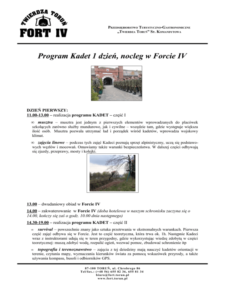 PRZEDSIĘBIORSTWO TURYSTYCZNO-GASTRONOMICZNE „TWIERDZA TORUŃ” SP. KOMANDYTOWA Program Kadet 1 dzień, nocleg w Forcie IV DZIEŃ PIERWSZY: 11.00-13.00 – realizacja programu KADET – część I • musztra – musztra jest jednym z pierwszych elementów wprowadzanych do placówek szkolących zarówno służby mundurowe, jak i cywilne – wszędzie tam, gdzie występuje większa ilość osób. Musztra pozwala utrzymać ład i porządek wśród kadetów, wprowadza wojskowy klimat. • zajęcia linowe – podczas tych zajęć Kadeci poznają sprzęt alpinistyczny, uczą się podstawowych węzłów i mocowań. Omawiamy także warunki bezpieczeństwa. W dalszej części odbywają się zjazdy, przeprawy, mosty i kolejki. 13.00 – dwudaniowy obiad w Forcie IV 14.00 – zakwaterowanie w Forcie IV (doba hotelowa w naszym schronisku zaczyna się o 14.00, kończy się zaś o godz. 10.00 dnia następnego) 14.30-19.00 – realizacja programu KADET – część II survival – powszechnie znany jako sztuka przetrwania w ekstremalnych warunkach. Pierwsza część zajęć odbywa się w Forcie. Jest to część teoretyczna, która trwa ok. 1h. Następnie Kadeci wraz z instruktorami udają się w teren przygodny, gdzie wykorzystując wiedzę zdobytą w części teoretycznej: muszą zdobyć wodę, rozpalić ogień, wezwać pomoc, zbudować schronienie itp • topografia i terenoznawstwo – zajęcia z tej dziedziny mają nauczyć kadetów orientacji w terenie, czytania mapy, wyznaczania kierunków świata za pomocą wskazówek przyrody, a także używania kompasu, busoli i odbiorników GPS. • 87-100 TORUŃ, ul. Chrobrego 86 Tel/fax.: (+48 56) 655 82 36, 655 81 34 [email protected] ww w.fort.torun.pl PRZEDSIĘBIORSTWO TURYSTYCZNO-GASTRONOMICZNE „TWIERDZA TORUŃ” SP. KOMANDYTOWA tor przeszkód – zbudowany na podobieństwo wojskowego toru przeszkód z wieloma trudnymi elementami do pokonania uczy kadetów woli walki oraz poprawia sprawność fizyczną. Tor położony jest w mokrawej części Fortu, co dodatkowo podnosi trudność zadania. Kadeci przemierzają wyznaczoną trasę czołgając się pod drutami kolczastymi, pokonując ruchome kładki, wiszące opony, tunele czy wysokie ścianki. • 19.00 – kolacja lub kuchnia polowa w ramach programu KADET, gdzie uczniowie własnoręcznie przygotują grochówkę na kolację 20.00-21.00 – zwiedzanie Fortu IV z przewodnikiem i z pochodniami. Przejście trasą zwiedzania od placu broni, przez część koszarową, poterny, z wejściem do Prochowni, wyjściem na Majdan, przejściem podziemnym tunelem do kaponiery barkowej w świetle pochodni, a także wejście na koronę Fortu. 21.00-22.00 – podchody po Forcie IV – gra terenowa według wojennego scenariusza. NOCLEG W KOSZARACH FORTU IV DZIEŃ DRUGI: 08.00-09.00 – śniadanie w Forcie IV i wykwaterowanie z pokoi 09.00–10.30 – gry i zabawy integracyjne – prowadzone przez instruktorów zajęcia na świeżym powietrzu (lub wewnątrz Fortu) dostosowane do wieku uczestników, w programie: • sztafeta z granatem trzonkowym, • przejście przez hula hop, • narty wieloosobowe, • przeciąganie liny, • turniej w bule, • dart, • turniej strzelania z łuku, • rzut podkową Liczba przeprowadzanych konkurencji zależy od liczby uczestników! 87-100 TORUŃ, ul. Chrobrego 86 Tel/fax.: (+48 56) 655 82 36, 655 81 34 [email protected] ww w.fort.torun.pl PRZEDSIĘBIORSTWO TURYSTYCZNO-GASTRONOMICZNE „TWIERDZA TORUŃ” SP. KOMANDYTOWA 11.30-13.30 – zwiedzanie Starego Miasta z przewodnikiem (bez wstępów) Rynek Staromiejski – XIII-wieczny Ratusz, Dwór Artusa, Kamienica pod Gwiazdą, budynek zabytkowej XIX-wiecznej poczty • Kościół Najświętszej Marii Panny – przykład gotyckiego, halowego kościoła oo. franciszkanów • Krzywa Wieża – druga, obok wieży z Pizy, najsłynniejsza Krzywa Wieża w Europie • Gotycka Starówka – wpisana na listę "UNESCO" • Ruiny Zamku Krzyżackiego – pozostałości po założycielach Torunia - Zakonie Krzyżackim • Mury Obronne • Mikołaj Kopernik w Toruniu – odwiedzenie miejsc związanych z Wielkim Astronomem - Dom Kopernika, Pomnik Mikołaja Kopernika, budynki Uniwersytetu Mikołaja Kopernika • Zakup smacznych pierników toruńskich • *Rozkład godzin jest przykładowy, może ulec zmianie po dokonaniu rezerwacji. Wymienione w programie atrakcje można modyfikować według potrzeb. Cena zawiera: zakwaterowanie, wyżywienie określone w programie, bilety wstępu do określonych w programie atrakcji, opiekę instruktorów i przewodników w określonych godzinach. Cena nie zawiera: transportu, opłat parkingowych, opieki pilota. 87-100 TORUŃ, ul. Chrobrego 86 Tel/fax.: (+48 56) 655 82 36, 655 81 34 [email protected] ww w.fort.torun.pl