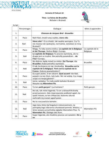[Texte] Semaine 8 Podcast 16 Titre : Le héros de Bruxelles Bohater z Brukseli Script : Personnages 1. 2. Dialogue Mots à apprendre Chanson de Jacques Brel - Bruxelles Paco Nali! Nali, chodź tutaj szybko, viens vite. Viens vite? O co chodzi. Jak zwykle wariujesz. Czy Ty nie możesz tak spokojnie, normalnie, zwiedzać ze mną Brukseli? Mogę. To taka ważna stolica. La capitale de la Belgique La capitale de la et de l’Europe. Stolica Belgii i Europy. Belgique La capitale de Belgique.To jeszcze wymówię, ale to drugie jest za trudne. Nie potrafię powiedzieć... de l’Eur? Europy. No dobrze, będę mówił za ciebie. De l’Europe. Ale Bruxelles Bruxelles chyba potrafisz wymówić. O tak, bo kojarzy mi się z brukselką. Bruxelles est la capitale de la Belgique. Paris est la capitale de la France. Dobrze powiedziałam? Oj super jesteś. A ten akcent. Quel accent! Ale Nali, popatrz na ten tłum, tyle ludzi. Nic nie widzę. Czy mogę usiąść na twojej głowie? Jasne, wskakuj. To mały wielki bohater Brukseli. Nazywa się Manneken Pis. 3. Nali 4. Paco 5. Nali 6. Paco 7. Nali 8. Paco 9. Nali 10. Paco To ten petit garçon? I już bohater? 11. Nali No tak, tak mówi legenda. To on uratował Brukselę przed pożarem. Gdy nieprzyjaciele podłożyli ogień, by spalić miasto, to ten chłopczyk, któremu akurat zachciało się siusiać ugasił pożar. 12. Paco No to rzeczywiście bohater. 13. Nali 14. Paco Jego tata, który był bogatym mieszczaninem, na pamiątkę tego zdarzenia ufundował pomnik. Widzisz, a teraz wszyscy przychodzą oglądać Manneken Pisa. To Manneken Pis. Dlatego taki tłum. Super legenda, ale chodźmy jeszcze coś zwiedzić. On y va. Petit garçon Manneken Pis 1 [Texte] Activités : Compréhension globale : Faire écouter le dialogue et identifier le contexte. Faire le point sur ce que les élèves ont compris : - Combien de personnages parlent dans le dialogue? - Quelles langues parlent-ils? - Où sont Paco et Nali? - Comment s’appelle la capitale de Belgique? - Comment s’appelle le petit héros belge? - Savez–vous raconter l’histoire du Manneken Pis? Recueillir les propositions des enfants. Procéder à la deuxième écoute si nécessaire pour que les enfants puissent trouver les réponses correctes. Exploitation didactique : Support didactique: une photo du Manneken Pis Montrer la photo aux élèves. Demander ce qu’ils y voient. Leur expliquer encore une fois la légende de Manneken Pis. Demander aux enfants s’ils connaissent d’autres légendes des cités européennes (La sirène de Varsovie, le dragon de Cracovie etc...) Permettre aux enfants de raconter les histoires qu’ils connaissent. Carte de l’Europe : faire écouter encore une fois le dialogue et demander aux enfants de quel pays on parle. On peut les aider à trouver les pays que Paco et Nali ont déjà visités (La Pologne, La France et la Belgique). On peut aller plus loin et montrer aux enfants 6 mots qu’ils devront associer (La Pologne – Varsovie, la France- Paris, la Belgique – Bruxelles, par exemple). Les acquis de la séance : - Les élèves connaissent les capitales de certains pays européens (Paris, Bruxelles…) et savent les montrer sur la carte de l’Europe Ils savent raconter la légende du Manneken Pis Les élèves connaissent les mots : Bruxelles, le petit garçon et le Manneken Pis » 2