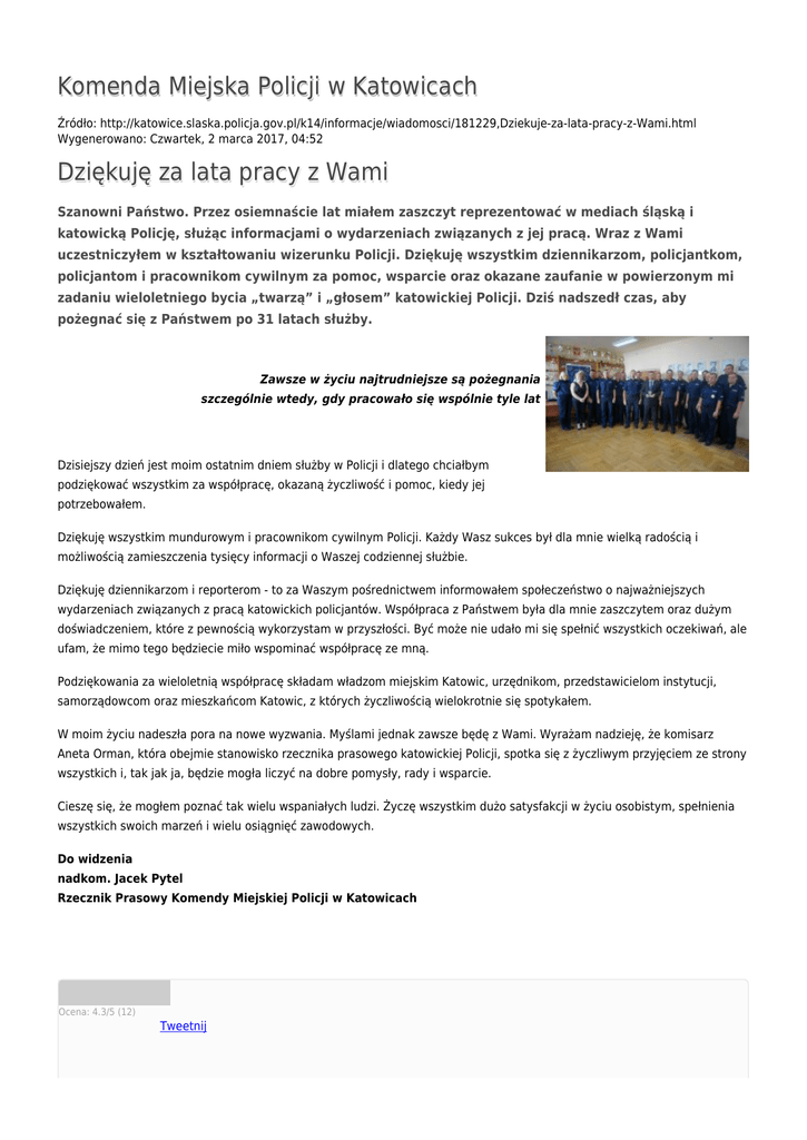 Komenda Miejska Policji w Katowicach Źródło: http://katowice.slaska.policja.gov.pl/k14/informacje/wiadomosci/181229,Dziekuje-za-lata-pracy-z-Wami.html Wygenerowano: Czwartek, 2 marca 2017, 04:52 Dziękuję za lata pracy z Wami Szanowni Państwo. Przez osiemnaście lat miałem zaszczyt reprezentować w mediach śląską i katowicką Policję, służąc informacjami o wydarzeniach związanych z jej pracą. Wraz z Wami uczestniczyłem w kształtowaniu wizerunku Policji. Dziękuję wszystkim dziennikarzom, policjantkom, policjantom i pracownikom cywilnym za pomoc, wsparcie oraz okazane zaufanie w powierzonym mi zadaniu wieloletniego bycia „twarzą” i „głosem” katowickiej Policji. Dziś nadszedł czas, aby pożegnać się z Państwem po 31 latach służby. Zawsze w życiu najtrudniejsze są pożegnania szczególnie wtedy, gdy pracowało się wspólnie tyle lat Dzisiejszy dzień jest moim ostatnim dniem służby w Policji i dlatego chciałbym podziękować wszystkim za współpracę, okazaną życzliwość i pomoc, kiedy jej potrzebowałem. Dziękuję wszystkim mundurowym i pracownikom cywilnym Policji. Każdy Wasz sukces był dla mnie wielką radością i możliwością zamieszczenia tysięcy informacji o Waszej codziennej służbie. Dziękuję dziennikarzom i reporterom - to za Waszym pośrednictwem informowałem społeczeństwo o najważniejszych wydarzeniach związanych z pracą katowickich policjantów. Współpraca z Państwem była dla mnie zaszczytem oraz dużym doświadczeniem, które z pewnością wykorzystam w przyszłości. Być może nie udało mi się spełnić wszystkich oczekiwań, ale ufam, że mimo tego będziecie miło wspominać współpracę ze mną. Podziękowania za wieloletnią współpracę składam władzom miejskim Katowic, urzędnikom, przedstawicielom instytucji, samorządowcom oraz mieszkańcom Katowic, z których życzliwością wielokrotnie się spotykałem. W moim życiu nadeszła pora na nowe wyzwania. Myślami jednak zawsze będę z Wami. Wyrażam nadzieję, że komisarz Aneta Orman, która obejmie stanowisko rzecznika prasowego katowickiej Policji, spotka się z życzliwym przyjęciem ze strony wszystkich i, tak jak ja, będzie mogła liczyć na dobre pomysły, rady i wsparcie. Cieszę się, że mogłem poznać tak wielu wspaniałych ludzi. Życzę wszystkim dużo satysfakcji w życiu osobistym, spełnienia wszystkich swoich marzeń i wielu osiągnięć zawodowych. Do widzenia nadkom. Jacek Pytel Rzecznik Prasowy Komendy Miejskiej Policji w Katowicach Ocena: 4.3/5 (12) Tweetnij