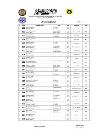 2 runda Mistrzostw Okręgu Rzeszowskiego PZM w Super KJS Biecz - Jasło, dn. 27-28.08.2016r. LISTA ZGŁOSZEŃ L.p. Numer 1 Kierowca / Pilot DOK. 5.1 Nar. Samochód Klasa 101 Kowalski Bartosz Łeczycki Artur A. Polski A. Polski POL POL Opel Astra GSI K3 2 102 Olszewski Grzegorz Patla Łukasz Stomil Debica Stomil Debica POL Opel Astra GSI K3 3 103 Orliński Łukasz Marszałek Michał A. Jasielski A. Jasielski POL POL Opel Astra K3 4 104 Gniadek Grzegorz Dębiec Piotr Opel Astra K3 5 105 Zieliński Dariusz Cebula Adam A. Polski A. Polski POL POL Renault Clio K3 6 106 Krasowski Łukasz Bukała Mateusz A. Małopolski AKM Łańcut POL POL Renault Clio Sport K3 7 107 Podsiadło Michał Kielar Patryk A. Kielecki AMK Limanowa POL Renault Clio K3 8 108 Wilk Tomasz Kocoń Ireneusz POL POL Renault Clio K3 9 109 Adamski Adam Pietruś Robert POL POL Renault K3 10 110 Przywara Krzysztof Grabowska Magdalena A. Rrzeszowski POL POL Peugeot 206 GTI K3 11 111 Kędzior Wojciech Trznadel Mateusz Stomil Debica Stomil Debica POL POL Renault Clio K3 12 112 Bukowski Konrad Gryzło Michał JKMiRD A. Biecki POL Honda Civic K2 13 113 Gajewski Marek Sąsiadek Marek POL POL Honda Civic K2 14 114 Wypych Adam Stępień Łukasz POL POL Honda Civic K2 15 115 Pomprowicz Przemysław Sokołowski Daniel JKMiRD A. Jasielski POL POL Honda Civic K2 16 116 Opora Marcin Mastyj Damian JKMiRD A. Biecki POL POL Peugeot 106 K 2 17 117 Czubaj Łukasz Felis Kamil AMK Limanowa POL Citoen Saxo VTS K2 18 118 Sawicki Łukasz Wieczorek Mirosław A. Galicyjski POL POL Citoen Saxo K2 19 119 Słomka Mateusz Pypeć Przemysław A. Południowy A. Kielecki POL POL Suzuki Swift 1.3 GTI K1 20 120 Gurgul Piotr Kubik Szymon Suzuki Swift K1 21 121 Wronkowicz Jacek Orliński Wiesław A. Biecki A. Biecki POL POL Peugeot 106 K1 22 122 Bogusławski Aleksander Rusinek Tomasz A. Stalowa Wola A. Stalowa Wola POL POL Fiat SC Sporting K1 23 123 Styś Adrian Bawłowicz Grzegorz AKM Łańcut AKM Łańcut POL Fiat CC K1 24 124 Leśniak Sławomir Leśniak Artur POL POL Fiat CC K1 25 125 Bukowiec Damian Biłos Damian POL Fiat K1 Klub POL POL POL A. Zamkowy POL POL POL AMK Tarnów POL POL Biecz, dn. 24.08.2016r. POL POL Dyrektor Rajdu Mateusz Kacprzak