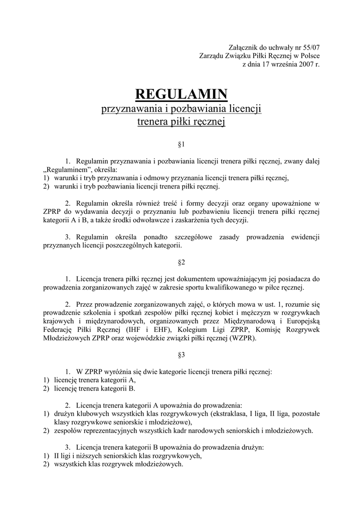 Załącznik do uchwały nr 55/07 Zarządu Związku Piłki Ręcznej w Polsce z dnia 17 września 2007 r. REGULAMIN przyznawania i pozbawiania licencji trenera piłki ręcznej §1 1. Regulamin przyznawania i pozbawiania licencji trenera piłki ręcznej, zwany dalej „Regulaminem”, określa: 1) warunki i tryb przyznawania i odmowy przyznania licencji trenera piłki ręcznej, 2) warunki i tryb pozbawiania licencji trenera piłki ręcznej. 2. Regulamin określa równieŜ treść i formy decyzji oraz organy upowaŜnione w ZPRP do wydawania decyzji o przyznaniu lub pozbawieniu licencji trenera piłki ręcznej kategorii A i B, a takŜe środki odwoławcze i zaskarŜenia tych decyzji. 3. Regulamin określa ponadto szczegółowe zasady prowadzenia ewidencji przyznanych licencji poszczególnych kategorii. §2 1. Licencja trenera piłki ręcznej jest dokumentem upowaŜniającym jej posiadacza do prowadzenia zorganizowanych zajęć w zakresie sportu kwalifikowanego w piłce ręcznej. 2. Przez prowadzenie zorganizowanych zajęć, o których mowa w ust. 1, rozumie się prowadzenie szkolenia i spotkań zespołów piłki ręcznej kobiet i męŜczyzn w rozgrywkach krajowych i międzynarodowych, organizowanych przez Międzynarodową i Europejską Federację Piłki Ręcznej (IHF i EHF), Kolegium Ligi ZPRP, Komisję Rozgrywek MłodzieŜowych ZPRP oraz wojewódzkie związki piłki ręcznej (WZPR). §3 1. W ZPRP wyróŜnia się dwie kategorie licencji trenera piłki ręcznej: 1) licencję trenera kategorii A, 2) licencję trenera kategorii B. 2. Licencja trenera kategorii A upowaŜnia do prowadzenia: 1) druŜyn klubowych wszystkich klas rozgrywkowych (ekstraklasa, I liga, II liga, pozostałe klasy rozgrywkowe seniorskie i młodzieŜowe), 2) zespołów reprezentacyjnych wszystkich kadr narodowych seniorskich i młodzieŜowych. 3. Licencja trenera kategorii B upowaŜnia do prowadzenia druŜyn: 1) II ligi i niŜszych seniorskich klas rozgrywkowych, 2) wszystkich klas rozgrywek młodzieŜowych. §4 1. Decyzję o przyznaniu licencji trenera kategorii A wydaje z upowaŜnienia Zarządu Związku Rada Trenerów ZPRP lub utworzona przez nią Komisja Licencji Trenerskich. 2. Rada Trenerów ZPRP jest organem upowaŜnionym takŜe do wydawania decyzji o odmowie przyznania licencji i o pozbawieniu licencji trenera kategorii A. §5 1. O licencję trenera kategorii A moŜe ubiegać się osoba, która spełni łącznie następujące warunki: 1) posiada pełną zdolność do czynności prawnych i korzysta z pełni praw publicznych, 2) posiada uprawnienia trenera klasy mistrzowskiej, I lub II klasy w rozumieniu art. 44 ustawy o kulturze fizycznej, 3) posiada stan zdrowia umoŜliwiający wykonywanie funkcji trenera piłki ręcznej, 4) uczestniczył w ostatnich dwóch latach w podstawowych kursach i kursokonferencjach doszkalających, 5) złoŜył zobowiązanie do systematycznego uczestnictwa w kursokonferencjach i szkoleniu organizowanym przez Radę Trenerów lub Wydział Organizacji Szkolenia ZPRP, 6) złoŜył zobowiązanie do przestrzegania przepisów gry w piłkę ręczną, postanowień statutów i regulaminów ZPRP, EHF i IHF. oraz do poddania się przewidzianej przez te organizacje odpowiedzialności dyscyplinarnej, 7) złoŜył do Rady Trenerów ZPRP wniosek o przyznanie licencji trenera kategorii A według wzoru stanowiącego załącznik nr 1 do Regulaminu. 1) 2) 3) 4) 5) 6) 7) 2. Wniosek, o którym mowa w ust. 1, powinien zawierać: imię i nazwisko oraz adres zamieszkania wnioskodawcy, datę urodzenia wnioskodawcy, informację o wykształceniu i uprawnieniach trenerskich wnioskodawcy, informację o udziale wnioskodawcy w kursach i kursokonferencjach w ostatnich dwóch latach, informację o przynaleŜności klubowej wnioskodawcy, informację, czy wnioskodawca ubiega się o licencję kategorii A po raz pierwszy, czy ponownie, datę złoŜenia wniosku i podpis wnioskodawcy. §6 Osoba ubiegająca się o przyznanie licencji trenera kategorii A jest obowiązana dołączyć do wniosku, o którym mowa w § 5, następujące dokumenty: 1) oświadczenie o posiadaniu pełnej zdolności do czynności prawnych oraz o korzystaniu z pełni praw publicznych, 2) uwierzytelnione kopie dokumentów potwierdzających wykształcenie i uprawnienia trenerskie, 3) zaświadczenie lekarskie o braku przeciwwskazań do wykonywania funkcji trenera piłki ręcznej, 4) oświadczenie o uczestnictwie w podstawowych kursach i kursokonferencjach dokształcających w ciągu ostatnich dwóch lat, 5) zobowiązanie do systematycznego uczestnictwa w kursokonferencjach i szkoleniu organizowanych przez Radę Trenerów lub Wydział Organizacji Szkolenia ZPRP, 2 6) zobowiązanie do przestrzegania przepisów gry w piłkę ręczną, postanowień statutów i regulaminów ZPRP, EHF i IHF oraz do poddania się przewidzianej przez te organizacje odpowiedzialności dyscyplinarnej, 7) dwa zdjęcia wnioskodawcy o wymiarach paszportowych przewidziane do umieszczenia na wniosku i na druku legitymacji licencyjnej. §7 1. Decyzję o przyznaniu licencji trenera kategorii B wydaje z upowaŜnienia Zarządu ZPRP zarząd właściwego WZPR. 2. Zarząd właściwego WZPR jest organem upowaŜnionym równieŜ do wydawania decyzji o odmowie przyznania licencji kategorii B. 3. Do wydawania decyzji, o których mowa w ustawie 1 i 2, oraz decyzji o pozbawieniu licencji trenera kategorii B jest upowaŜniona takŜe Rada Trenerów ZPRP (Komisja Licencji Trenerskich). §8 1. O licencję trenera piłki ręcznej kategorii B moŜe ubiegać się osoba, która spełni łącznie następujące warunki: 1) posiada pełną zdolność do czynności prawnych i korzysta z pełni praw publicznych, 2) posiada uprawnienia trenera klasy mistrzowskiej, I lub II klasy albo tytuł instruktora piłki ręcznej, 3) posiada stan zdrowia umoŜliwiający wykonywanie funkcji trenera piłki ręcznej, 4) złoŜył zobowiązanie do systematycznego uczestnictwa w kursokonferencjach i szkoleniu organizowanych przez Radę Tre