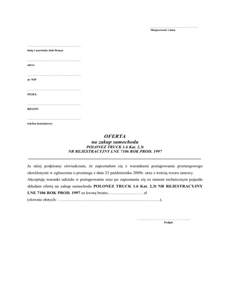 ………………………………………. Miejscowość i data ……………………………………………. Imię i nazwisko (lub firma) ……………………………………………. adres ……………………………………………. nr NIP ……………………………………………. PESEL ……………………………………………. REGON ……………………………………………. telefon kontaktowy OFERTA na zakup samochodu POLONEZ TRUCK 1.6 Kat. 2.3t NR REJESTRACYJNY LNE 7106 ROK PROD. 1997 ________________________________________________________________ Ja niŜej podpisany oświadczam, Ŝe zapoznałem się z warunkami postępowania przetargowego określonymi w ogłoszeniu o przetargu z dnia 23 października 2009r. oraz z treścią wzoru umowy. Akceptuję warunki udziału w postępowaniu oraz po zapoznaniu się ze stanem technicznym pojazdu składam ofertę na zakup samochodu POLONEZ TRUCK 1.6 Kat. 2.3t NR REJESTRACYJNY LNE 7106 ROK PROD. 1997 za kwotę brutto……………………. zł (słownie złotych: ………………………………………………………………). ……………………………………………. Podpis