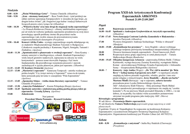 Niedziela 8.00 – 8.50 9.00 – 9.50 9.00 – 10.30 9.50 – 10.40 10.40 – 11.30 11.35 – 12.05 12.15 – 13.00 12.15 – 13.05 13.05 – 13.50 14.00 – 14.45 15.00 „Pieśni Wileńskiego Getta” – Tomasz Chmielik (Alhambra) „Iran – nieznany kontynent” – Reza Torabi (Iran) - tytuł prelekcji ma oddać zarówno ignorancję Europejczyków w stosunku do tego kraju „na drugim końcu świata”, jak i bogactwo jego kultur i tradycji kulturowych liczących prawie cztery tysiące lat (Alhambra) „‘Właściwa liczba’ oraz inne drogi do stagnacji ruchu esperanckiego” - Lu Wunsch-Rolshoven (Niemcy) – elitarny intelektualista organizujący juŜ od wielu lat wyborne spotkania esperanckie przedstawia na swój nieco prowokujący sposób problemy istotne dla przyszłości ruchu esperanckiego i jak zwykle zmusza do przewartościowywania rozpowszechnionych stereotypów (Posejdono) Koncert Afrika Umba - występy esperanckiego zespołu składającego się ze studentów Międzynarodowego Studium Turystyki w Bydgoszczy. Członkowie zespołu pochodzą z: Kamerunu, Nigerii, Senegalu, Tanzanii i Zimbabwe. (Apolono) „Spontaniczność a planowanie w ewolucji esperanta” – Ilona Koutny uznany autorytet w interlingwistyce, członek Akademii Esperanckiej i wielu innych gremiów naukowych, zapraszana na odczyty na wielu kontynentach – porusza temat niezwykle frapujący i być moŜe fundamentalny dla prawidłowego rozumienia procesów i zjawisk zachodzących w języku planowym, jakim jest esperanto. (Alhambra) IX Konkurs Oratorski (Apolono) „Mariawici i esperanto” – Katarzyna Tempczyk - autorka wydanej po polsku ksiąŜki “Czy święci mówią w Esperanto?” wraca tu do tematu, który poruszała parę lat temu w czasopiśmie “Pola Esperantisto” (Apolono) „Spomenka Stimec – wielka dama literatury esperanckiej” – Tomasz Chmielik (Posejdono) „Ameryka Południowa” – Ksenia Prilepskaja (Rosja) (Apolono) Spotkanie autorskie z utalentowaną polską poetką piszącą takŜe po esperancku - Urszulą Zyburą (Apolono) Zakończenie Nasi patroni: Prezydent Miasta Poznania – Ryszard Grobelny Program XXII-ich Artystycznych Konfrontacji Esperanckich ARKONES Poznań 21.09-23.09.2007 Piątek 16.00 16.00 –16.45 Rejestracja uczestników Spotkanie z Andrzejem Grzębowskim nt. turystyki esperanckiej. (Alhambra) 17.00 –17.45 Nowa koncepcja Centrum Ludwika Zamenhofa w Białymstoku – Jarosław Parzyszek (Alhambra) 17.00 Wystawa fotogramów Andrzeja Sochackiego: “Polska w obrazach” (Manĝejo) 18.00 – 19.00 „Komunikacja bez przemocy” – Jerzy Rządzki - odczyt wybitnego polskiego terapeuty poświęcony komunikacji interpersonalnej (Alhambra) 18.00 Otwarcie kiermaszu ksiąŜek esperanckich – Paweł Janowczyk (Hall) 18.00 Rozpoczęcie pracy grupy zajęciowej ze sztuk plastycznych – Tamara Malkowskaja (Rosja) (Bamberka) 19.00 – 19.45 Oficjalna inauguracja Arkonesu – poprowadzą ElŜbieta Malik i Tobiasz Kaźmierski, występ muzyczny Zuzanny Kornickiej, wystąpienie Haliny Komar – przewodniczącej Polskiego Związku Esperantystów i Aleksandra Sosny – wiceprezydenta Białegostoku (Apolono) 20.00 - ? Koncerty: Anjo Amika (Węgry) - „De ‘Por vidi la mondon’ ĝis ‘Bela Revo’ + kelkaj kantoj el preparata nova KD” - w repertuarze artystki znajdują się ludowe piosenki węgierskie, włoskie, greckie i inne oraz pieśni religijne z róŜnych krajów, Jerzy Handzlik – „Bardo sen barbo” Marteno Miniĥ (Słowacja) – rap w esperanto, zabawa karaoke prowadzona przez Leszka Dobrowolskiego (Apolono). 18.00 AKF -Arkonesowy Klub Filmowy – filmy prezentuje Marek Blahuŝ (wbrew narodowości prowadzącego w repertuarze nie znajdą się “czeskie komedie”). Po raz pierwszy Marek prowadził filmotekę w 2006 r., i to tak dobrze, Ŝe na prośbę i ku radości wielu uczestników postanowiono utrzymać ten punkt programu jako tradycyjny AKF. (Marso) Równolegle z programem: W sali Marso – Prezentacja filmów esperanckich. W sali Bamberka Tamara Malkowskaja poprowadzi grupę zajęciową ze sztuk plastycznych. O godzinie 18 przy al. Niepodległości 8a rozpocznie się konferencja KolejarzyEsperantystów z uczestnictwem Delegatów Światowej Organizacji KolejarzyEsperantystów. Organizatorem konferencji jest Wiesław Libner (tel. 601703231). Sobota www.arkones.org 8.00 – 8.50 „Komunikacja z autystami”- Judita Rey Hudeĉek (Chorwacja) (Posejdono) 9.00 – 9.45 9.00 – 9.50 9.50 – 10.40 9.55 – 10.40 10.00 – 11.35 10.50 10.50 – 11.35 11.40 – 12.40 11.45 – 12.45 12.45 – 12.50 12.50 – 13.45 12.50 – 13.40 13.00 – 13.30 13.35 – 14.30 13.40 – 14.30 13.45 – 14.30 14.30 – 15.15 „Pisarze słowiańscy w literaturze esperanckiej” - Tomasz Chmielik (Posejdono) O projekcie nowego podręcznika języka esperanto – spotkanie z autorem Edwardem Malewiczem (Prozerpina) Spotkanie członków i zainteresowanych działalnością ILEI (Międzynarodowej Ligi Nauczycieli Esperanta). Prelekcja o działalności ILEI w Polsce – Magdalena Tatara (Posejdono) „Psychologiczne reakcje na Esperanto” – Claude Piron (Szwajcaria) dobrze znany francuskojęzyczny psycholog i esperanckojęzyczny pisarz interpretuje tu swoje osobiste doświadczenia (Prozerpina) „Magiczna Nowosądecczyzna” i „Japońskie impresje” – Halina Komar i Jolanta Kieres (Alhambra) Spotkanie Skautowej Ligi Esperanckiej – poprowadzi Sebastian Cyprych (Prozerpina) „E@I (Esperanto W Internecie) – projekty zrealizowane i plany na przyszłość” – Peter Balaĵ (Słowacja) (Posejdono) „Władca Pierścieni (Tolkien w Esperanto)” – Aleksander Korĵenkov (Rosja) - odczyt w powiązaniu z drugim juŜ wydaniem sławnej trylogii Tolkiena – pierwsze wydanie rozeszło się w ciągu paru lat, czyli “jak ciepłe bułeczki” (jak na realia esperanckie i cenę) (Posejdono) „Od efektywnej komunikacji po udaną informację, zaproszenie do dyskusji” – Barbara Pi