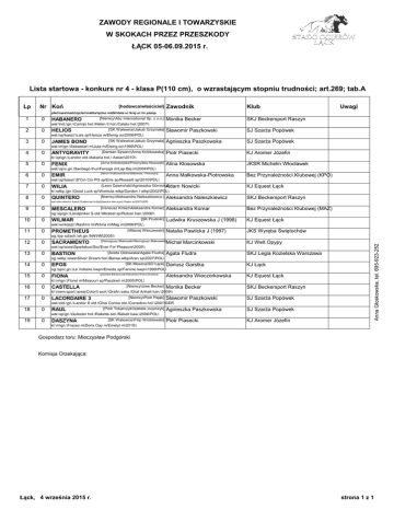 ZAWODY REGIONALE I TOWARZYSKIE W SKOKACH PRZEZ PRZESZKODY ŁĄCK 05-06.09.2015 r. Lista startowa - konkurs nr 4 - klasa P(110 cm), o wzrastającym stopniu trudności; art.269; tab.A Lp Nr Koń [hodowca\właściciel] Zawodnik Klub Monika Becker SKJ Beckersport Raszyn Sławomir Paszkowski SJ Szarża Popówek Agnieszka Paszkowska SJ Szarża Popówek Piotr Piasecki KJ Aromer Józefin Alina Kłosowska JKSR Michelin Włocławek Anna Małkowska-Piotrowska Bez Przynależności Klubowej (KPO) Uwagi płeć\rasa\maść\ojciec\matka/ojciec matki\data ur.\kraj ur.\nr paszp. 1 0 HABANERO [Niemcy\Abc International Sp. z o.o.] wał.\hol.\gn.\Carinjo hol.\Helen II hol./Calato hol.\2007\\ 2 0 HELIOS [SK Walewice\Jakub Grzymała] wał.\sp\kaszt.\Lais sp\Hanza m/Elsing oo\2006\POL\ 3 0 JAMES BOND [SK Walewice\Jakub Grzymała] wał.\m\gn.\Sebastian m\Juta m/Elsing oo\1999\POL\ 4 0 ANTYGRAVITY [Damian Szwarc\Anna Królikowska] kl.\sp\gn.\Landor old.\Askaria hol./ Askari\2010\\ 5 0 FENIX [Anna Kołodziejska\Przemysław Kłosowski] wał.\sp\c.gn.\Santiego thur\Ferezja m/Lap Bej m\2004\POL\ 6 0 EMIR [Marcin Królikowski\Anna Małkowska - Piotrowska] wał.\sp\kaszt.\D'Cin Cin PG sp\Eris sp/Rosselli sp\2010\POL\ 7 0 WILIA [Leon Gawroński\Agnieszka Górnicka] Adam Nowicki KJ Equest Łąck kl.\wlkp.\gn.\Good Luck sp\Workuta wlkp/Gordon I wlkp\2002\POL\ 8 0 QUINTERO [Niemcy\Aleksandra Naleszkiewicz.] Aleksandra Naleszkiewicz SKJ Beckersport Raszyn Aleksandra Komar Bez Przynależności Klubowej (MAZ) Ludwika Kruszewska J (1998) KJ Equest Łąck Natalia Pawlicka J (1997) JKS Wyręba Świętochów Michał Marcinkowski KJ Welt Opypy Agata Fludra SKJ Legia Kozielska Warszawa Dariusz Garstka KJ Łąck wał.\niem.wierzch.\kaszt.\Quaterman brdbg\Saamira niem.sport./Saami xx\2007\GER\ 9 0 MESCALERO [Ireneusz Kmieć\Aleksandra Komar] og.\sp\gn.\Landjonker S old.\Mirabel sp/Rubon han.\2006\\ 10 0 [SK Prudnik\] WILMAR wał.\xo\kaszt.\Rashim m\Wilma m/Mag m\2006\POL\ 11 0 [\Maciej Włoczewski] PROMETHEUS 12 0 SACRAMENTO [Remigiusz Makowski\Remigiusz Makowski] Anna Głoskowska, tel. 695-923-252 og.\typ szlach.\sk.gn.\NN\NN\2005\\ wał.\sp\siwa\Spartakus\Sisi/Ever For Pleasure\2009\\ 13 0 BASTION [Aneta Ostrowska\Agata Fludra] og.\wlkp.\siwa\Silver Dream hol.\Barwa wlkp/Aran sp\2007\POL\ 14 0 EPOS [SK Moszna\SO Łąck] og.\sp\c.gn.\Le Voltaire kwpn\Eneida sp/Fanimo kwpn\1999\POL\ 15 0 FIONA [Zdzisław Banaszczak\Aleksandra Wieczorkowska] Aleksandra Wieczorkowska KJ Equest Łąck Monika Becker SKJ Beckersport Raszyn kl.\m\gn.\Floret m\Missouri sp/Paszkwil m\2005\POL\ 16 0 CASTELLA [Niemcy\Uwe Becker] kl.\niem.sport.\siwa\Colorit wurt.\Grafin saks./Graf Anhalt han.\2009\\ 17 0 LACORDAIRE 3 [Niemcy\Piotr Pająk] Sławomir Paszkowski SJ Szarża Popówek wał.\old.\gn.\Landor S old.\Gina Corina old./Corradino hol.\2001\GER 18 0 RAUL [Piotr Tokarczyk\Izabela Juszczyk] Agnieszka Paszkowska SJ Szarża Popówek Piotr Piasecki KJ Aromer Józefin wał.\sp\gn.\Qulester hol.\Raketta old./Rakett baw.\2006\POL\ 19 0 DASZYNA [SK Walewice\Filip Wróblewski] kl.\m\gn.\Frazes m\Doris Day m/Emetyt m\2010\\ Gospodarz toru: Mieczysław Podgórski Komisja Orzekająca: Łąck, 4 września 2015 r. strona 1 z 1