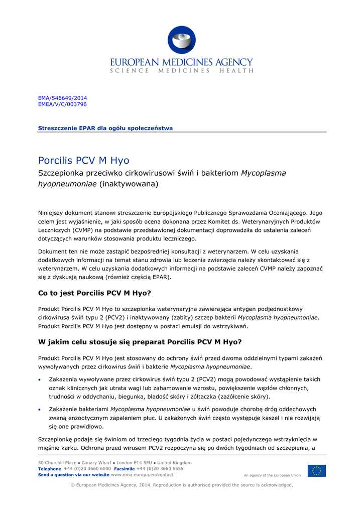 EMA/546649/2014 EMEA/V/C/003796 Streszczenie EPAR dla ogółu społeczeństwa Porcilis PCV M Hyo Szczepionka przeciwko cirkowirusowi świń i bakteriom Mycoplasma hyopneumoniae (inaktywowana) Niniejszy dokument stanowi streszczenie Europejskiego Publicznego Sprawozdania Oceniającego. Jego celem jest wyjaśnienie, w jaki sposób ocena dokonana przez Komitet ds. Weterynaryjnych Produktów Leczniczych (CVMP) na podstawie przedstawionej dokumentacji doprowadziła do ustalenia zaleceń dotyczących warunków stosowania produktu leczniczego. Dokument ten nie może zastąpić bezpośredniej konsultacji z weterynarzem. W celu uzyskania dodatkowych informacji na temat stanu zdrowia lub leczenia zwierzęcia należy skontaktować się z weterynarzem. W celu uzyskania dodatkowych informacji na podstawie zaleceń CVMP należy zapoznać się z dyskusją naukową (również częścią EPAR). Co to jest Porcilis PCV M Hyo? Produkt Porcilis PCV M Hyo to szczepionka weterynaryjna zawierająca antygen podjednostkowy cirkowirusa świń typu 2 (PCV2) i inaktywowany (zabity) szczep bakterii Mycoplasma hyopneumoniae. Produkt Porcilis PCV M Hyo jest dostępny w postaci emulsji do wstrzykiwań. W jakim celu stosuje się preparat Porcilis PCV M Hyo? Produkt Porcilis PCV M Hyo jest stosowany do ochrony świń przed dwoma oddzielnymi typami zakażeń wywoływanych przez cirkowirus świń i bakterie Mycoplasma hyopneumoniae. • Zakażenia wywoływane przez cirkowirus świń typu 2 (PCV2) mogą powodować wystąpienie takich oznak klinicznych jak utrata wagi lub zahamowanie wzrostu, powiększenie węzłów chłonnych, trudności w oddychaniu, biegunka, bladość skóry i żółtaczka (zażółcenie skóry). • Zakażenie bakteriami Mycoplasma hyopneumoniae u świń powoduje chorobę dróg oddechowych zwaną enzootycznym zapaleniem płuc. U zakażonych świń często występuje kaszel i nie rozwijają się one prawidłowo. Szczepionkę podaje się świniom od trzeciego tygodnia życia w postaci pojedynczego wstrzyknięcia w mięśnie karku. Ochrona przed wirusem PCV2 rozpoczyna się po dwóch tygodniach od szczepienia, a 30 Churchill Place ● Canary Wharf ● London E14 5EU ● United Kingdom Telephone +44 (0)20 3660 6000 Facsimile +44 (0)20 3660 5555 Send a question via our website www.ema.europa.eu/contact An agency of the European Union © European Medicines Agency, 2014. Reproduction is authorised provided the source is acknowledged. ochrona przed bakteriami Mycoplasma hyopneumoniae rozpoczyna się po czterech tygodniach od szczepienia. Ochrona przed wirusem PCV2 utrzymuje się przez 22 tygodnie od szczepienia, a ochrona przed bakteriami Mycoplasma hyopneumoniae — przez 21 tygodni od szczepienia. Jak działa preparat Porcilis PCV M Hyo? Produkt Porcilis PCV M Hyo jest szczepionką. Szczepionki działają poprzez „uczenie” układu odpornościowego (naturalnych mechanizmów obronnych organizmu) sposobów obrony przed chorobą. Szczepionka zawiera niewielką ilość jednego z białek wirusa PCV2 i całe bakterie Mycoplasma hyopneumoniae, które zostały zabite (inaktywowane), aby nie wywoływały choroby. Po podaniu produktu Porcilis PCV M Hyo świni układ odpornościowy zwierzęcia rozpoznaje wirusy i bakterie jako struktury „obce” i wytwarza skierowane przeciwko nim przeciwciała. W przypadku narażenia na tego wirusa lub te bakterie w przyszłości układ odpornościowy zwierzęcia będzie w stanie zareagować szybciej. Pomoże to w ochronie świń przed zakażeniami cirkowirusem świń i bakteriami Mycoplasma hyopneumoniae. Produkt Porcilis PCV M Hyo zawiera jako adiuwanty lekki olej mineralny i wodorotlenek glinu, które mają na celu wzmocnienie odpowiedzi układu odpornościowego. Jak badano preparat Porcilis PCV M Hyo? Skuteczność szczepionki badano najpierw w szeregu badań laboratoryjnych z udziałem świń. Celem tych badań było ustalenie czasu potrzebnego do uzyskania pełnej ochrony świń przed wirusem PCV2 i bakteriami Mycoplasma hyopneumoniae oraz czasu trwania tej ochrony. Skuteczność szczepionki Porcilis PCV M Hyo została zbadana w 10 badaniach terenowych obejmujących hodowle trzody chlewnej, w których wykryto oznaki zakażeń wirusem PCV2 i/lub bakteriami Mycoplasma hyopneumoniae. W każdym z badań około 300 ssących prosiąt zaszczepiono produktem Porcilis PCV M Hyo, a druga grupa około 300 ssących prosiąt otrzymała szczepienie pozorowane. Główną miarą skuteczności szczepienia był średni dzienny przyrost masy ciała w końcowym okresie tuczu, poziom wirusa PCV2 we krwi i stopień uszkodzenia (zmian) płuc. Jakie korzyści ze stosowania preparatu Porcilis PCV M Hyo zaobserwowano w badaniach? Badania laboratoryjne wykazały, że pełna ochrona w przypadku wirusa PCV2 występowała po upływie dwóch tygodni od szczepienia, a w przypadku bakterii Mycoplasma hyopneumoniae — po upływie czterech tygodni. Czas trwania ochrony po szczepieniu wynosił 22 tygodnie w przypadku wirusa PCV2 i 21 tygodni w przypadku bakterii Mycoplasma hyopneumoniae. Badania terenowe wykazały, że produkt Porcilis PCV M Hyo zmniejsza poziom wirusa PCV2 we krwi oraz nasilenie patologicznych zmian w płucach spowodowanych przez bakterie Mycoplasma hyopneumoniae, a także zmniejsza stratę dziennego przyrostu masy ciała w końcowym okresie tuczu (przed ubojem). Jakie ryzyko wiąże się ze stosowaniem preparatu Porcilis PCV M Hyo? Najczęstsze działanie niepożądane (obserwowane u więcej niż 1 na 10 świń) związane ze stosowaniem produktu Porcilis PCV M Hyo to przejściowy wzrost temperatury ciała o maksymalnie 2°C w dniu szczepienia. Porcilis PCV M Hyo EMA/546649/2014 Strona 2/3 Jakie są środki ostrożności dla osoby, która podaje lek lub ma kontakt ze zwierzęciem? Preparat Porcilis PCV M Hyo jest emulsją zawierającą olej mineralny. Przypadkowe wstrzyknięcie może spowodować silny ból i obrzęk, szczególnie w przypadku wstrzyknięcia do stawu lub palca — może to pro