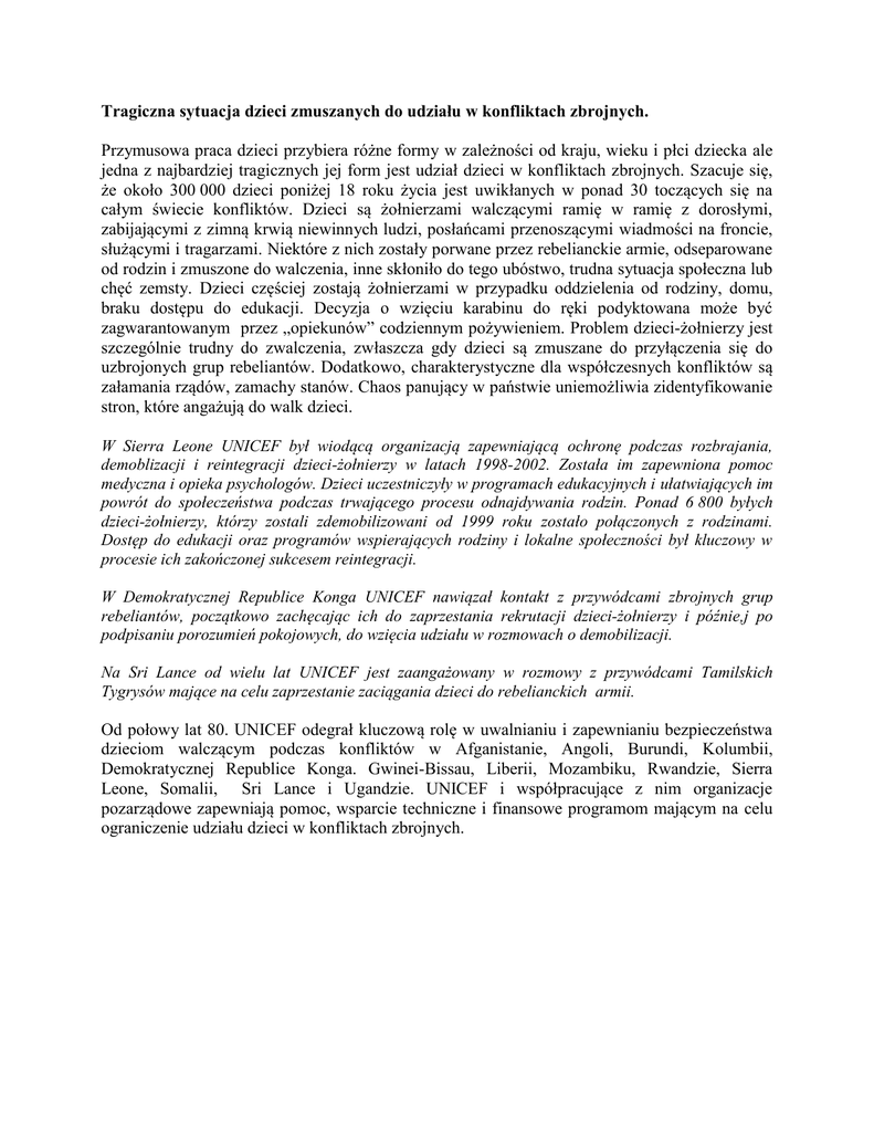 Tragiczna sytuacja dzieci zmuszanych do udziału w konfliktach zbrojnych. Przymusowa praca dzieci przybiera różne formy w zależności od kraju, wieku i płci dziecka ale jedna z najbardziej tragicznych jej form jest udział dzieci w konfliktach zbrojnych. Szacuje się, że około 300 000 dzieci poniżej 18 roku życia jest uwikłanych w ponad 30 toczących się na całym świecie konfliktów. Dzieci są żołnierzami walczącymi ramię w ramię z dorosłymi, zabijającymi z zimną krwią niewinnych ludzi, posłańcami przenoszącymi wiadmości na froncie, służącymi i tragarzami. Niektóre z nich zostały porwane przez rebelianckie armie, odseparowane od rodzin i zmuszone do walczenia, inne skłoniło do tego ubóstwo, trudna sytuacja społeczna lub chęć zemsty. Dzieci częściej zostają żołnierzami w przypadku oddzielenia od rodziny, domu, braku dostępu do edukacji. Decyzja o wzięciu karabinu do ręki podyktowana może być zagwarantowanym przez „opiekunów” codziennym pożywieniem. Problem dzieci-żołnierzy jest szczególnie trudny do zwalczenia, zwłaszcza gdy dzieci są zmuszane do przyłączenia się do uzbrojonych grup rebeliantów. Dodatkowo, charakterystyczne dla współczesnych konfliktów są załamania rządów, zamachy stanów. Chaos panujący w państwie uniemożliwia zidentyfikowanie stron, które angażują do walk dzieci. W Sierra Leone UNICEF był wiodącą organizacją zapewniającą ochronę podczas rozbrajania, demoblizacji i reintegracji dzieci-żołnierzy w latach 1998-2002. Została im zapewniona pomoc medyczna i opieka psychologów. Dzieci uczestniczyły w programach edukacyjnych i ułatwiających im powrót do społeczeństwa podczas trwającego procesu odnajdywania rodzin. Ponad 6 800 byłych dzieci-żołnierzy, którzy zostali zdemobilizowani od 1999 roku zostało połączonych z rodzinami. Dostęp do edukacji oraz programów wspierających rodziny i lokalne społeczności był kluczowy w procesie ich zakończonej sukcesem reintegracji. W Demokratycznej Republice Konga UNICEF nawiązał kontakt z przywódcami zbrojnych grup rebeliantów, początkowo zachęcając ich do zaprzestania rekrutacji dzieci-żołnierzy i późnie,j po podpisaniu porozumień pokojowych, do wzięcia udziału w rozmowach o demobilizacji. Na Sri Lance od wielu lat UNICEF jest zaangażowany w rozmowy z przywódcami Tamilskich Tygrysów mające na celu zaprzestanie zaciągania dzieci do rebelianckich armii. Od połowy lat 80. UNICEF odegrał kluczową rolę w uwalnianiu i zapewnianiu bezpieczeństwa dzieciom walczącym podczas konfliktów w Afganistanie, Angoli, Burundi, Kolumbii, Demokratycznej Republice Konga. Gwinei-Bissau, Liberii, Mozambiku, Rwandzie, Sierra Leone, Somalii, Sri Lance i Ugandzie. UNICEF i współpracujące z nim organizacje pozarządowe zapewniają pomoc, wsparcie techniczne i finansowe programom mającym na celu ograniczenie udziału dzieci w konfliktach zbrojnych.