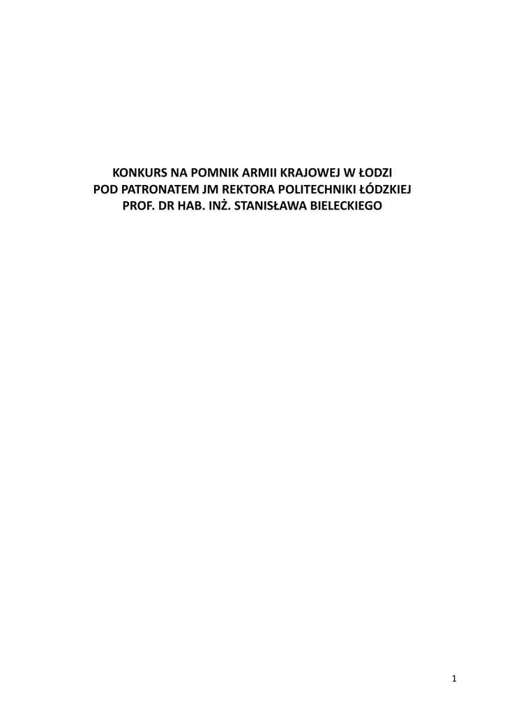 KONKURS NA POMNIK ARMII KRAJOWEJ W ŁODZI POD PATRONATEM JM REKTORA POLITECHNIKI ŁÓDZKIEJ PROF. DR HAB. INŻ. STANISŁAWA BIELECKIEGO 1 PREAMBUŁA Ten Pomnik to symbol pamięci, który po wsze czasy przypominać będzie obecnym i przyszłym pokoleniom mieszkańców Łodzi i Ziemi Łódzkiej o najświętszym obowiązku obrony Rzeczypospolitej. Wolność i Suwerenność nie jest dana żadnemu Narodowi na zawsze. Ten święty obowiązek żołnierze Armii Krajowej Okręgu Łódź wypełnili z honorem. 2 REGULAMIN KONKURSU 1. Przedmiot i założenia konkursu: 1.1. Przedmiotem konkursu jest wyłonienie koncepcji Pomnika Armii Krajowej w Łodzi wraz z jego najbliższym otoczeniem. 1.2. Zadaniem uczestnika konkursu jest przedstawienie koncepcji we wskazanym na załączniku graficznym miejscu (załącznik nr 1), uwzględniając: a) Przedstawioną na mapie wstępną propozycję usytuowania pomnika na głównej osi kompozycyjnej parku. b) Możliwość zmiany lokalizacja pomnika w ramach opracowania całościowej koncepcji rewitalizacji parku im. St. Moniuszki. 1.3. Przyjęte rozwiązania powinny zapewniać wysoki standard estetyczny i użytkowy. 1.4. Niedopuszczalne są rozwiązania mogące utrudniać komunikację pieszą lub kołową lub stwarzać zagrożenie dla osób przebywających na terenie. 2. Materiały udostępnione uczestnikom: 2.1. 2.2. 2.3. 2.4. 2.5. Wstępna lokalizacja pomnika w parku im. St. Moniuszki (załącznik nr 1). Tekst tablic pamiątkowych i symbole (załącznik nr 2). Potwierdzenie dostarczenia/odbioru pracy (załącznik nr 3). Zgłoszenie uczestnictwa w konkursie (załącznik nr 4). Oświadczenie o przekazaniu autorskich praw majątkowych (załącznik nr 5). 3. Wymagania dotyczące założeń realizacji projektu: 3.1. 3.2. 3.3. a) b) c) d) Materiał ostatecznej formy pomnika: trwały, odporny na upływ czasu i działanie warunków atmosferycznych. Dowolna przestrzenna forma rzeźbiarska. Obowiązkowe elementy, jakie należy zawrzeć w projekcie: Tablice pamiątkowe (tekst w załączniku nr 2); Symbol polski walczącej (wzór w załączniku nr 2); Krzyż AK (wzór w załączniku nr 2); Symbol Orła (forma rzeźbiarska do opracowania przez uczestnika konkursu). 4. Warunki formalne konkursu: 4.1. W konkursie mogą brać udział tylko studenci Politechniki Łódzkiej, Wydziału Budownictwa Architektury i Inżynierii Środowiska, kierunku Architektura (Architektura i Architectural Engineering). 4.2. Projekt należy wykonać na lekkich planszach 70x50 - max. 2 szt. 4.3. Zawartość plansz: a) Koncepcja zagospodarowania terenu (skala 1:500); b) Rysunki niezbędne do przedstawienia koncepcji (rzuty, elewacje, widoki); c) Wizualizacje koncepcji (dopuszczalne w technice 3D). 4.4. Dodatkowo należy załączyć opis na formacie A4 (max. 1 str.). Opis powinien 3 wyjaśniać koncepcję zamierzenia. 4.5. Model pomnika z dowolnego materiału, w skali 1:10 wraz z jego najbliższym otoczeniem. Model w kolorze białym. 4.6. Należy dołączyć płytę CD/DVD z nagranymi wszystkimi elementami wymienionymi w punkcie 4.3 (4.3.a i 4.3.b – pliki w formacie PDF, w punkcie 4.3.c – pliki w formacie JPG o rozdzielczości nie mniejszej niż 1500 x 1125 px, 300dpi, opis o którym mowa w pkt. 4.4 w pliku w formacie PDF o rozdzielczości 300 dpi, oraz zdjęcia modelu, o których mowa w pkt. 4.5 w pliku jpg o rozdzielczości nie mniejszej niż 1500 x 1125 px 300dpi. 4.7. Każda plansza, opis, płyta CD/DVD powinny zawierać sześciocyfrowe godło umieszczone w prawym górnym rogu nośnika, a w przypadku modelu na jego podstawie od spodu. Tym samym godłem powinna być opatrzona zapieczętowana koperta z wypełnionymi i podpisanymi dokumentami: a) Zgłoszenie uczestnictwa (załącznik nr 4); b) Oświadczenie o przekazaniu praw majątkowych do pracy (załącznik 5). 4.8. Sposób zabezpieczenia wyżej wymienionych danych oraz opisania plansz powinien uniemożliwiać identyfikację autora pracy przed otwarciem kopert pod rygorem wykluczenia pracy z konkursu. 4.9. Identyfikacja autorów (otwarcie kopert) nastąpi komisyjnie po wyborze prac nagrodzonych. 4.10. Oceny prac dokona jury w składzie: a) Ze strony PŁ: Przewodniczący Komisji Konkursowej dr hab. inż. arch. Marek Pabich, prof. PŁ Dyrektor IAiU Członek Komisji Konkursowej prof. dr hab. inż. Sławomir Wiak Prorektor PŁ ds. edukacji Członek Komisji Konkursowej prof. szt. Andrzej Jocz IAiU PŁ Członek Komisji Konkursowej dr inż. arch. Robert Warsza Dyrektor Miejskiej Pracowni Urbanistycznej w Łodzi, IAiU PŁ Członek Komisji Konkursowej mgr inż. arch. Katarzyna Janicka IAiU PŁ Sekretarz Komisji Konkursowej dr inż. arch. Tomasz Grzelakowski IAiU PŁ b) Ze strony ŚZŻAK – okręg Łódź: Członek Komisji Konkursowej mjr Zbysław Raczkiewicz Prezes Zarządu ŚZŻAK – okręg Łódź Członek Komisji Konkursowej Członek Komisji Konkursowej ppłk Tadeusz Barański mjr Tadeusz Bratek 4 4.11. Nagrody w konkursie ufundowane przez JM Rektora PŁ. W konkursie przewiduje się następującą pulę nagród: I miejsce 5000 zł II miejsce 3000 zł III miejsc 2000 zł oraz trzy równorzędne wyróżnienia po 1000 zł 4.12. Jury może nie przyznać nagrodzonych miejsc, bądź zadecydować o innym podziale nagród. 4.13. Przyznanie nagrody nie jest jednoznaczne z gwarancją realizacji projektu. 4.14. W przypadku decyzji o realizacji wybranej koncepcji wykonanie dokumentacji budowlanej będzie przedmiotem negocjacji i osobnej umowy. 4.15. Politechnika Łódzka nie zwraca kosztów wykonania projektów ani ich dostarczenia. 5. Terminy i adresy: Ogłoszenie konkursu: 05.05.2015. Termin składania projektów - 25.06.2015 (do godz. 12.00). Prace można składać w dniach 22.06.- 25.06.2015 (w godz.9.00-12.00, kontakt telefoniczny pod numerami 42 631 35 45 lub 42 631 35 30). Prace, które zostaną dostarczone po godzinie 12.00 w dniu 25 czerwca 2015 roku nie będą przyjmowane. 5.3. Projekty z załączoną i zapieczętowaną koperta należy dostarczyć na r