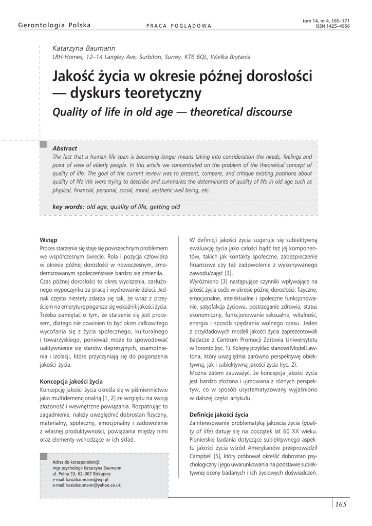 Gerontologia Polska PRACA POGLĄDOWA tom 14, nr 4, 165–171 ISSN 1425–4956 Katarzyna Baumann LRH-Homes, 12–14 Langley Ave, Surbiton, Surrey, KT6 6QL, Wielka Brytania Jakość życia w okresie późnej dorosłości — dyskurs teoretyczny Quality of life in old age — theoretical discourse Abstract The fact that a human life span is becoming longer means taking into consideration the needs, feelings and point of view of elderly people. In this article we concentrated on the problem of the theoretical concept of quality of life. The goal of the current review was to present, compare, and critique existing positions about quality of life We were trying to describe and summaries the determinants of quality of life in old age such as physical, financial, personal, social, moral, aesthetic well being, etc. key words: old age, quality of life, getting old Wstęp Proces starzenia się staje się powszechnym problemem we współczesnym świecie. Rola i pozycja człowieka w okresie późnej dorosłości w nowoczesnym, zmodernizowanym społeczeństwie bardzo się zmieniła. Czas późnej dorosłości to okres wyciszenia, zasłużonego wypoczynku za pracę i wychowanie dzieci. Jednak często niestety zdarza się tak, że wraz z przejściem na emeryturę pogarsza się wskaźnik jakości życia. Trzeba pamiętać o tym, że starzenie się jest procesem, dlatego nie powinien to być okres całkowitego wycofania się z życia społecznego, kulturalnego i towarzyskiego, ponieważ może to spowodować uaktywnienie się stanów depresyjnych, osamotnienia i izolacji, które przyczyniają się do pogorszenia jakości życia. Koncepcja jakości życia Koncepcję jakości życia określa się w piśmiennictwie jako multidemencjonalną [1, 2] ze względu na swoją złożoność i wewnętrzne powiązania. Rozpatrując to zagadnienie, należy uwzględnić dobrostan fizyczny, materialny, społeczny, emocjonalny i zadowolenie z własnej produktywności, powiązania między nimi oraz elementy wchodzące w ich skład. Adres do korespondencji: mgr psychologii Katarzyna Baumann ul. Polna 33, 62–007 Biskupice e-mail: [email protected] e-mail: [email protected] W definicji jakości życia sugeruje się subiektywną ewaluację życia jako całości bądź też jej komponentów, takich jak kontakty społeczne, zabezpieczenie finansowe czy też zadowolenie z wykonywanego zawodu/zajęć [3]. Wyróżniono [3] następujące czynniki wpływające na jakość życia osób w okresie późnej dorosłości: fizyczne, emocjonalne, intelektualne i społeczne funkcjonowanie, satysfakcja życiowa, postrzeganie zdrowia, status ekonomiczny, funkcjonowanie seksualne, witalność, energia i sposób spędzania wolnego czasu. Jeden z przykładowych modeli jakości życia zaprezentowali badacze z Centrum Promocji Zdrowia Uniwersytetu w Toronto (ryc. 1). Kolejny przykład stanowi Model Lawtona, który uwzględnia zarówno perspektywę obiektywną, jak i subiektywną jakości życia (ryc. 2). Można zatem zauważyć, że koncepcja jakości życia jest bardzo złożona i ujmowana z różnych perspektyw, co w sposób usystematyzowany wyjaśniono w dalszej części artykułu. Definicje jakości życia Zainteresowanie problematyką jakością życia (quality of life) datuje się na początek lat 60 XX wieku. Pionierskie badania dotyczące subiektywnego aspektu jakości życia wśród Amerykanów przeprowadził Campbell [5], który próbował określić dobrostan psychologiczny i jego uwarunkowania na podstawie subiektywnej oceny badanych i ich życiowych doświadczeń. 165 Gerontologia Polska 2006, tom 14, nr 4 Rycina 1. Model jakości życia Centrum Promocji Zdrowia Uniwersytetu w Toronto [4] Figure 1. Quality of life model, Centre of Health Promotion, University Toronto [4] Zagadnienie jakości życia bardzo często omawia się, nie podając odpowiedniej, jednoznacznej definicji. Często traktuje się je bardzo eklektycznie — różni badacze, pisząc i rozprawiając na temat jakości życia, nierzadko biorą pod uwagę różne definicje. Wielkie zaniedbania dotyczące definicji prowadzą do nieścisłości i niezrozumienia terminologicznego. W niniejszym artykule dokonano próby uporządkowania i uściślenia szeroko rozumianego pojęcia jakości życia. Przedstawicielom nauk społecznych nie udało się podać jednej, zwartej i zwięzłej definicji jakości życia. Romney [6] wskazał, że istnieje niezliczona liczba definicji jakości życia, zaś Faden i Leplege [7] zaobserwowali, że pojęcie jakości życia rozpatrywane przez pryzmat różnych szkół ma wiele wspólnych punktów. Chibnall i Tait [8] stwierdzili, że koncepcja jakości życia jest nieuchwytna (elusive). Ważne jest jednak to, że nauki społeczne koncentrują się przede wszystkim na jakości życia w znaczeniu uniwersalnym. Definicje jakości życia na podstawie ich struktury można podzielić na globalne, złożone, mieszane i specyficzne (tab. 1). Zdaniem Bańki [9] jakość życia to „(...) efekt rozwoju jednostki, czyli skutek procesu konstruowania standardów porównań dla osiągalnych w czasie informacji, z jednej strony, oraz wypadkowa rozłożonego w czasie procesu konstruowania sądów o życiu, będących mentalnymi reprezentacjami życia i regulatorami procesu przetwarzania napływających informacji”. Bańka również wyraźnie podkreśla, że człowiek oceniający jakość życia korzysta z 4 podstawowych źródeł: przeszłych doświadczeń, teraźniejszych przeżyć, oczekiwań związanych z przyszłością oraz opinii społecznej. Poczucie jakości życia zmienia się wraz z etapem rozwoju człowieka w ciągu życia. I tak, w rozpatrywanym w niniejszej pracy okresie późnej dorosłości, dana jed- 166 www.gp.viamedica.pl Rycina 2. Model Lawtona Figure 2. Lawton’s model nostka osobowa ma jakieś cele do zrealizowania, jakieś role życiowe do spełnienia, ma jakieś marzenia, ale również żyje w jakiejś społeczności, tu i teraz, jednocz