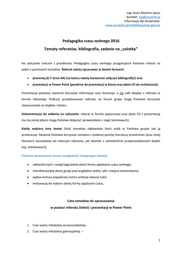 mgr Anna Alochno-Janas Kontakt: [email protected] Informacje dla studentów: www.arsverbi.pl/dydaktyka/wsb-gliwice Pedagogika czasu wolnego 2016 Tematy referatów, bibliografia, zadanie na „szóstkę” Na zaliczenie ćwiczeń z przedmiotu Pedagogika czasu wolnego przygotujecie Państwo referat na jeden z poniższych tematów. Referat należy opracować w dwóch formach: pisemnej (6-7 stron A4) (na końcu należy koniecznie załączyć bibliografię!) oraz prezentacji w Power Point (pendrive do prezentacji w klasie oraz płyta CD do archiwizacji). Prezentacja powinna zawierać kluczowe informacje oraz ilustracje, a nie całe akapity z referatu w formie tekstowej. Podczas przedstawiania referatu na forum grupy mogą Państwo korzystać równocześnie ze slajdów i tekstu. Dokumentacja do oddania na zaliczenie: referat w formie papierowej oraz płyta CD z prezentacją (na tej samej płycie mogą Państwo dołączyć sprawozdanie z zajęć terenowych). Każdy wybiera inny temat (ilość tematów odpowiada ilości osób w Państwa grupie lub ją przekracza). Możecie Państwo korzystać zarówno z podanej poniżej literatury przedmiotu (oraz innej literatury wyszukanej we własnym zakresie), jak również z samodzielnie przeprowadzonych badań (np. ankietowych). Państwa opracowania muszą uwzględniać następujące kwestie: zalety/korzyści i wady/zagrożenia danej formy spędzania czasu wolnego; charakterystykę danej grupy pod względem wieku, płci, miejsca zamieszkania; wpływ kultury popularnej contra ambicje własne ludzi; motywację do wyboru danej formy spędzania czasu. Lista tematów do opracowania w postaci referatu (tekst) i prezentacji w Power Point 1. Czas wolny młodzieży wczesnoszkolnej. 2. Czas wolny młodzieży gimnazjalnej. – 1 mgr Anna Alochno-Janas Kontakt: [email protected] Informacje dla studentów: www.arsverbi.pl/dydaktyka/wsb-gliwice 3. Czas wolny młodzieży licealnej. – 4. Czas wolny studentów. – 5. Czas wolny seniorów. – 6. Czas wolny kobiet i mężczyzn – podobieństwa i różnice. 7. Czas wolny dziewczynek i chłopców – podobieństwa i różnice. – 8. Świetlice środowiskowe a profilaktyka zachowań ryzykownych wśród dzieci i młodzieży. – 9. Czas wolny dzieci i młodzieży spędzany w centrum handlowym. – 10. Pielgrzymki, oazy, kółka parafialne – forma pobożności czy sposób na zabicie czasu? 11. Sekty religijne a wartości moralne i potrzeby duchowe dzieci i młodzieży. – 12. Harcerstwo jako forma spędzania czasu wolnego dzieci i młodzieży. – 13. Wycieczki i tzw. zielone szkoły jako formy edukacji pozaszkolnej. 14. Sport i aktywność fizyczna dzieci i młodzieży. – 15. Zabawa w rycerstwo. Hobby tylko dla małych i dużych chłopców? 16. Edukacja literacka i czytelnictwo a twórczość poetycka i prozatorska młodych autorów. 17. Kółka teatralne jako sposób na spędzanie czasu wolnego. – 18. Gra na instrumentach muzycznych i uczestnictwo w koncertach. – 19. Warsztaty plastyczne i wizyty w muzeach. 20. Edukacja filmowa a fascynacja kinem u młodych. 21. Moda na taniec. Czy tańczyć każdy może? – 22. Gry komputerowe i gry RPG – ucieczka od rzeczywistości? 23. Portale społecznościowe i YouTube jako nowoczesne formy komunikacji – korzyści i zagrożenia. – 24. Blogi – ekshibicjonizm, grafomania czy autoterapia? A może kółka zainteresowań? 25. Oglądanie telewizji (seriale, reality show, teleturnieje) jako wyraz kultury konsumpcjonizmu. – 2 mgr Anna Alochno-Janas Kontakt: [email protected] Informacje dla studentów: www.arsverbi.pl/dydaktyka/wsb-gliwice Wybrana literatura przedmiotu do referatów: 1. „Cudne manowce?” Kultura czasu wolnego we współczesnym społeczeństwie, red. W. Muszyński, Toruń 2008. 2. „Małe tęsknoty”. Style życia w czasie wolnym we współczesnym społeczeństwie, red. W. Muszyński, Toruń 2009. 3. Czas wolny. Refleksje, dylematy, perspektywy, red. D. Mroczkowska, Warszawa 2011. 4. Denek K., Edukacja pozalekcyjna i pozaszkolna, Poznań 2009. 5. Dziecko i sztuka. Recepcja – edukacja – wsparcie – terapia, red. M. Knapik, Katowice 2003. 6. Edukacja jutra. Aktywność fizyczna – zdrowie – problematyka czasu wolnego, red. K. Denek, A. Kamińska, P. Oleśniewicz, Sosnowiec 2015. 7. Formy spędzania czasu wolnego, red. M. Banach, T. W. Gierat, Kraków 2013. 8. Homo creator czy homo ludens? Nowe formy aktywności i spędzania wolnego czasu, red. W. Muszyński, M. Sokołowski. 9. Homo creator czy homo ludens? Twórcy – internauci – podróżnicy, red. W. Muszyński, M. Sokołowski, Toruń 2008. 10. Lewartowicz U., Pozalekcyjna edukacja kulturalna w teorii i praktyce, Lublin 2015. 11. Opieka i wychowanie w rodzinie, szkole i środowisku, red. B. Matyjas, R. Stojecka-Zuber, Kielce 2007. 12. Pięta J., Pedagogika czasu wolnego, Nowy Dwór Mazowiecki 2014. Zadanie na ocenę celującą Przeczytać poniższy tekst (rozdział z książki) i zreferować go ustnie. Johan Huizinga, Istota i znaczenie zabawy jako zjawiska kulturowego, [w tegoż] Homo ludens. Zabawa jako źródło kultury, tłum. M. Kurecka, Witold Wirpsza, Czytelnik, Warszawa 1998. 3