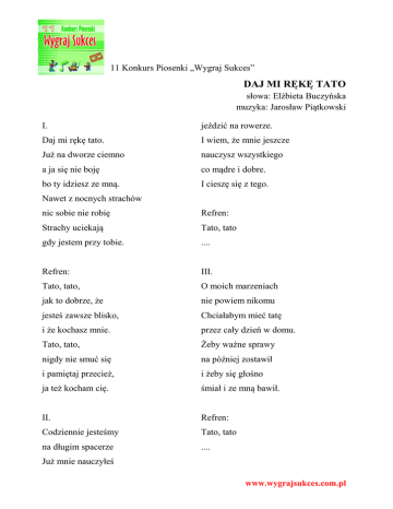 11 Konkurs Piosenki „Wygraj Sukces” DAJ MI RĘKĘ TATO słowa: Elżbieta Buczyńska muzyka: Jarosław Piątkowski I. jeździć na rowerze. Daj mi rękę tato. I wiem, że mnie jeszcze Już na dworze ciemno nauczysz wszystkiego a ja się nie boję co mądre i dobre. bo ty idziesz ze mną. I cieszę się z tego. Nawet z nocnych strachów nic sobie nie robię Refren: Strachy uciekają Tato, tato gdy jestem przy tobie. .... Refren: III. Tato, tato, O moich marzeniach jak to dobrze, że nie powiem nikomu jesteś zawsze blisko, Chciałabym mieć tatę i że kochasz mnie. przez cały dzień w domu. Tato, tato, Żeby ważne sprawy nigdy nie smuć się na później zostawił i pamiętaj przecież, i żeby się głośno ja też kocham cię. śmiał i ze mną bawił. II. Refren: Codziennie jesteśmy Tato, tato na długim spacerze .... Już mnie nauczyłeś www.wygrajsukces.com.pl