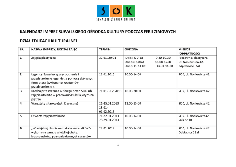 KALENDARZ IMPREZ SUWALSKIEGO OŚRODKA KULTURY PODCZAS FERII ZIMOWYCH DZIAŁ EDUKACJI KULTURALNEJ LP. NAZWA IMPREZY, RODZAJ ZAJĘĆ TERMIN GODZINA 1. Zajęcia plastyczne 22.01, 29.01 Dzieci 5-7 lat Dzieci 8-10 lat Dzieci 11-14 lat- 2. 21.01.2013 10.00-14.00 SOK, ul. Noniewicza 42 21.01-3.02.2013 16.00-20.00 SOK, ul. Noniewicza 42 4. Legendy Suwalszczyzny- poznanie i przedstawienie legendy za pomocą aktywnych form pracy (wykonanie kostiumów, przedstawienie ). Rzeźba przestrzenna w śniegu przed SOK lub zajęcia otwarte w pracowni Sztuk Pięknych na piętrze. Warsztaty gitarowe(git. Klasyczna) 13.00-15.00 SOK, ul. Noniewicza 42 5. Otwarte zajęcia wokalne 21-25.01.2013 28.0101.02.2013 21-22.01.2013 28-29.01.2013 10.00-14.00 SOK, ul. Noniewicza42 Sala nr 10 6. „W wiejskiej chacie –wizyta krasnoludków”wykonanie wnętrz wiejskiej chaty, krasnoludków, poznanie dawnych sprzętów 22.01.2013 10.00-14.00 SOK, ul. Noniewicza 42 Odpłatność 5zł 3. 1 9.30-10.30 11.00-12.30 13.00-14.30 MIEJSCE (ODPŁATNOŚĆ) Pracownia plastyczna Ul. Noniewicza 42, odpłatność - 5zł 7. domowych oraz ich przeznaczenia. Zabawy ze śpiewem z wykorzystaniem piosenek do wierszy M. Konopnickiej. 8. 9. 23.01.2013 10.00-14.00 Zajęcia plastyczne 23.01.2013 30.01.2013 Młodzież 15-20 lat Warsztaty wokalne „Nagraj swój głos”. Nagrywanie wokalu do gotowych podkładów muzycznych. Muzyczne poranki rockowe- Idziemy na koncert….zespół Queen, Deep Purple- film na DVD oraz dyskusja i ciekawostki na temat historii zespołu. 22.01-24.01 12.00-14.00 21-22.01.2013 12.00-13.30 SOK, ul. Noniewicza 42 11. Warsztaty muzyczne dla miłośników gitary: klasyka polskiego rocka część 1i 2. (gitara elektryczna lub akustyczna) 21-22.01.2013 16.00-17.30 12. Warsztaty teatralne dla dzieci w wieku 7-10 lat 21-23.01.2013 10.00-12.00 13. Warsztaty taneczne 21-23.01.2013 10.30-12.00 SOK. Ul. Noniewicza42 Przychodzimy z własną gitarą. Zajęcia dla osób już grających na gitarze. SOK, ul. Noniewicza 42 Sala nr14, odpłatność 5zł SOK, ul. Noniewicza 42 14. Warsztaty taneczne 21-23.01.2013 17.00-18.30 SOK, ul. Noniewicza 42 15. Otwarte Warsztaty ceramiczne 21-25.01.2013 12.00-14.00 16. „Jak to ze lnem było”- wycieczka do galerii ludowej w Przełomce 25.01.2013 10.00-14.00 SOK, ul. Noniewicza 42 Sala nr 7, odpłatność 5zł SOK, ul. Noniewicza 42 Odpłatność 10zł 10. 2 SOK, ul. Noniewicza42 9.30-12.00 12.30-15.00 Pracownia plastyczna Ul. Noniewicza 42, odpłatność - 5zł SOK Studio Nagrań MS-3 Ul. Noniewicza 42 17. Otwarte warsztaty teatralne 22-23.01.2013 29-30.01.2013 28-29.01.2013 16.00-18.00 16. Warsztaty dekoratorskie 17. Muzyczne poranki rockowe- Idziemy na koncert….zespół Pink Floyd, Leed Zeppelin film na DVD oraz dyskusja i ciekawostki na temat historii zespołu. 23-24.01.2013 12.00-13.30 SOK. Ul. Noniewicza42 18. Warsztaty muzyczne dla miłośników gitary: muzyka klasyczna cz. 1i2 (gitara klasyczna lub akustyczna). 23-24.01.2013 16.00—17.30 SOK. Ul. Noniewicza42 Przychodzimy z własną gitarą .Zajęcia dla osób już grających na gitarze. 19. Wystawa psów rasowych i nierasowych 24.01.2013 10.00-13.00 Sala widowiskowa SOK Ul. Noniewicza 42 20. Muzyczne poranki rockowe- Idziemy na koncert….zespół Ac/ds - film na DVD oraz dyskusja i ciekawostki na temat historii zespołu. 25.01.2013 12.00-13.30 SOK. Ul. Noniewicza 42 21. Warsztaty muzyczne dla miłośników gitary: Poezja śpiewana część 1 25.01.2013 16.00-17.30 22. Muzyczne poranki bluesowe- Idziemy na 28-29.01.2013 12.00-13.30 SOK. Ul. Noniewicza 42 Przynosimy własną gitarę. Zajęcia dla osób, które grają na gitarze. SOK. Ul. Noniewicza 42 3 10.00-14.00 Młodzież gimnazjalna, licealna SOK, ul. Noniewicza 42 Zajęcia płatne 10zł 23. 24. koncert….zespół Allman brothers band, , Eric Clapton - film na DVD oraz dyskusja i ciekawostki na temat historii zespołu. Warsztaty dla miłośników gitary(poezja śpiewana, muzyka bluesowa cz. 2 i 1.)Muzyczne poranki bluesowe- Idziemy na koncert….zespół BB King, Tadeusz Nalepa - film na DVD oraz dyskusja i ciekawostki na temat historii zespołu. 28-29.01.2013 16.00-17.30 30-31.01.2013 12.00-13.30 SOK, ul. Noniewicza 42. Przynosimy własną gitarę. SOK. Ul. Noniewicza 42 25. Otwarte warsztaty batiku 28.01-1.02.2013 12.00-14.00 SOK, ul. Noniewicza 42 Odpłatność 5zł 26. Warsztaty dla miłośników gitary(muzyka bluesowa cz. 2., szantowa cz. 1 (gitara akustyczna lub elektryczna) 30-31.01.2013 16.00-17.30 27. Wystawa kotów i innych zwierząt 31.01.2013 10.00- 13.00 SOK, ul. Noniewicza 42. Przynosimy własną gitarę. Zajęcia dla osób, które grają na gitarze. Sala widowiskowa SOK SOK ul. Noniewicza 42 28. Warsztaty wokalne, dobór repertuaru na konkurs Karaoke. 28-29.01.2013 10.00-14.00 Sala nr 10 29. Finał KARAOKE 30.01.2013 17.00-19.00 SOK ul. Noniewicza 42 Sala widowiskowa 30. Wycieczka do litewskiej izby tradycji (poznanie tradycji ludowych, pielęgnowanych przez 30.01.2013 10.00-14.00 SOK ul. Noniewicza 42 Odpłatność 10zł 4 mniejszość litewską). 31. BAL KARNAWAŁOWY- BAL U KLAUNA 1.02.2013 11.00-13.00 32. „Czy znasz swoje miasto”-konkurs wiedzy o Suwałkach. 1.02.2013 10.00-11.00 33. Muzyczne poranki bluesowe –Idziemy na koncert …zespół Dżem, film, dyskusja i ciekawostki na temat zespołu Warsztaty dla miłośników gitary; muzyka szantowa cz. 2 1.02.2013 12.00-13.30 SOK ul. Noniewicza 42 Sala nr 1.02.2013 16.00-17.30 Warsztaty teatralne dla dzieci w wieku 7-19 lat 28-30.01.2013 10.00-12.00 SOK ul. Noniewicza 42 Sala nr Przynosimy własną gitarę SOK, ul. Noniewicza42 Sala nr 14, odpłatność 5zł 34. 35. 5 SOK, ul. Noniewicza 42 Odpłatność 6zł SOK, ul. Noniewicza 42