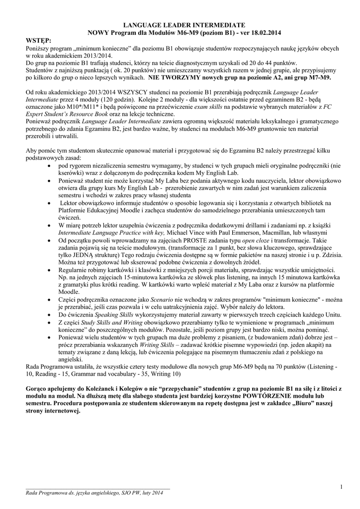 LANGUAGE LEADER INTERMEDIATE NOWY Program dla Modułów M6-M9 (poziom B1) - ver 18.02.2014 WSTĘP: Poniższy program „minimum konieczne” dla poziomu B1 obowiązuje studentów rozpoczynających naukę języków obcych w roku akademickiem 2013/2014. Do grup na poziomie B1 trafiają studenci, którzy na teście diagnostycznym uzyskali od 20 do 44 punktów. Studentów z najniższą punktacją ( ok. 20 punktów) nie umieszczamy wszystkich razem w jednej grupie, ale przypisujemy po kilkoro do grup o nieco lepszych wynikach. NIE TWORZYMY nowych grup na poziomie A2, ani grup M7-M9. Od roku akademickiego 2013/2014 WSZYSCY studenci na poziomie B1 przerabiają podręcznik Language Leader Intermediate przez 4 moduły (120 godzin). Kolejne 2 moduły - dla większości ostatnie przed egzaminem B2 - będą oznaczone jako M10*/M11* i będą poświęcone na przećwiczenie exam skills na podstawie wybranych materiałów z FC Expert Student’s Resource Book oraz na lekcje techniczne. Ponieważ podręcznik Language Leader Intermediate zawiera ogromną większość materiału leksykalnego i gramatycznego potrzebnego do zdania Egzaminu B2, jest bardzo ważne, by studenci na modułach M6-M9 gruntownie ten materiał przerobili i utrwalili. Aby pomóc tym studentom skutecznie opanować materiał i przygotować się do Egzaminu B2 należy przestrzegać kilku podstawowych zasad: pod rygorem niezaliczenia semestru wymagamy, by studenci w tych grupach mieli oryginalne podręczniki (nie kserówki) wraz z dołączonym do podręcznika kodem My English Lab. Ponieważ student nie może korzystać My Laba bez podania aktywnego kodu nauczyciela, lektor obowiązkowo otwiera dla grupy kurs My English Lab - przerobienie zawartych w nim zadań jest warunkiem zaliczenia semestru i wchodzi w zakres pracy własnej studenta Lektor obowiązkowo informuje studentów o sposobie logowania się i korzystania z otwartych bibliotek na Platformie Edukacyjnej Moodle i zachęca studentów do samodzielnego przerabiania umieszczonych tam ćwiczeń. W miarę potrzeb lektor uzupełnia ćwiczenia z podręcznika dodatkowymi drillami i zadaniami np. z książki Intermediate Language Practice with key, Michael Vince with Paul Emmerson, Macmillan, lub własnymi Od początku powoli wprowadzamy na zajęciach PROSTE zadania typu open cloze i transformacje. Takie zadania pojawią się na teście modułowym. (transformacje za 1 punkt, bez słowa kluczowego, sprawdzające tylko JEDNĄ strukturę) Tego rodzaju ćwiczenia dostępne są w formie pakietów na naszej stronie i u p. Zdzisia. Można też przygotować lub skserować podobne ćwiczenia z dowolnych źródeł. Regularnie robimy kartkówki i klasówki z mniejszych porcji materiału, sprawdzając wszystkie umiejętności. Np. na jednych zajęciach 15-minutowa kartkówka ze słówek plus listening, na innych 15 minutowa kartkówka z gramatyki plus krótki reading. W kartkówki warto wpleść materiał z My Laba oraz z kursów na platformie Moodle. Części podręcznika oznaczone jako Scenario nie wchodzą w zakres programów "minimum konieczne" - można je przerabiać, jeśli czas pozwala i w celu uatrakcyjnienia zajęć. Wybór należy do lektora. Do ćwiczenia Speaking Skills wykorzystujemy materiał zawarty w pierwszych trzech częściach każdego Unitu. Z części Study Skills and Writing obowiązkowo przerabiamy tylko te wymienione w programach „minimum konieczne” do poszczególnych modułów. Pozostałe, jeśli poziom grupy jest bardzo niski, można pominąć. Ponieważ wielu studentów w tych grupach ma duże problemy z pisaniem, (z budowaniem zdań) dobrze jest – prócz przerabiania wskazanych Writing Skills – zadawać krótkie pisemne wypowiedzi (np. jeden akapit) na tematy związane z daną lekcją, lub ćwiczenia polegające na pisemnym tłumaczeniu zdań z polskiego na angielski. Rada Programowa ustaliła, że wszystkie cztery testy modułowe dla nowych grup M6-M9 będą na 70 punktów (Listening 10, Reading - 15, Grammar nad vocabulary - 35, Writing 10) Gorąco apelujemy do Koleżanek i Kolegów o nie “przepychanie” studentów z grup na poziomie B1 na siłę i z litości z modułu na moduł. Na dłuższą metę dla słabego studenta jest bardziej korzystne POWTÓRZENIE modułu lub semestru. Procedura postępowania ze studentem skierowanym na repetę dostępna jest w zakładce „Biuro” naszej strony internetowej. _____________________________________________________ Rada Programowa ds. języka angielskiego, SJO PW, luty 2014 1 LANGUAGE LEADER INTERMEDIATE NOWY Program dla Modułu M6 (Coursebook Units 1-3) - ver 18.02.2014 READING: Należy przećwiczyć reading skills, ale nie wszystkie teksty muszą być przerabiane na zajęciach (część może być zadawana do czytania w domu). Na zajęciach należy się skupić na tych tekstach, które zawierają materiał gramatyczno-leksykalny wymagany w MINIMUM KONIECZNYM, i na których podstawie ten materiał jest w podręczniku ćwiczony. LISTENING: Przerabiamy WSZYSTKIE ćwiczenia na listening z Coursebook z części unitów oznaczonych cyframi X.1, X.2, X.3 oraz z wymienionych poniżej części X.5. Listeningi z części Scenario nie wchodzą w zakres „minimum koniecznego ". SPEAKING: Speaking należy ćwiczyć przy każdej okazji. Można korzystać z gotowych tematów zamieszczonych w podręczniku w działach Speaking (ich wybór należy do lektora) lub w oparciu o materiały własne. GRAMMAR: Wymienionym poniżej problemom gramatycznym należy poświęcić szczególną uwagę. Obowiązkowo należy przerobić wszystkie zadania Extra Practice z końca podręcznika oraz wymagać od studentów robienia zadań z My English Lab. Dodatkowo, na naszej stronie SJO/Biuro, oraz u pana Zdzisia, dostępny jest pakiet ćwiczeń typu multiple choice, open cloze i transformations (łatwiejsze, za 1 punkt) z myślą o przygotowaniu studentów do testów modułowych. Poniższa lista stanowi MINIMUM KONIECZNE do zaliczenia modułu: Question f