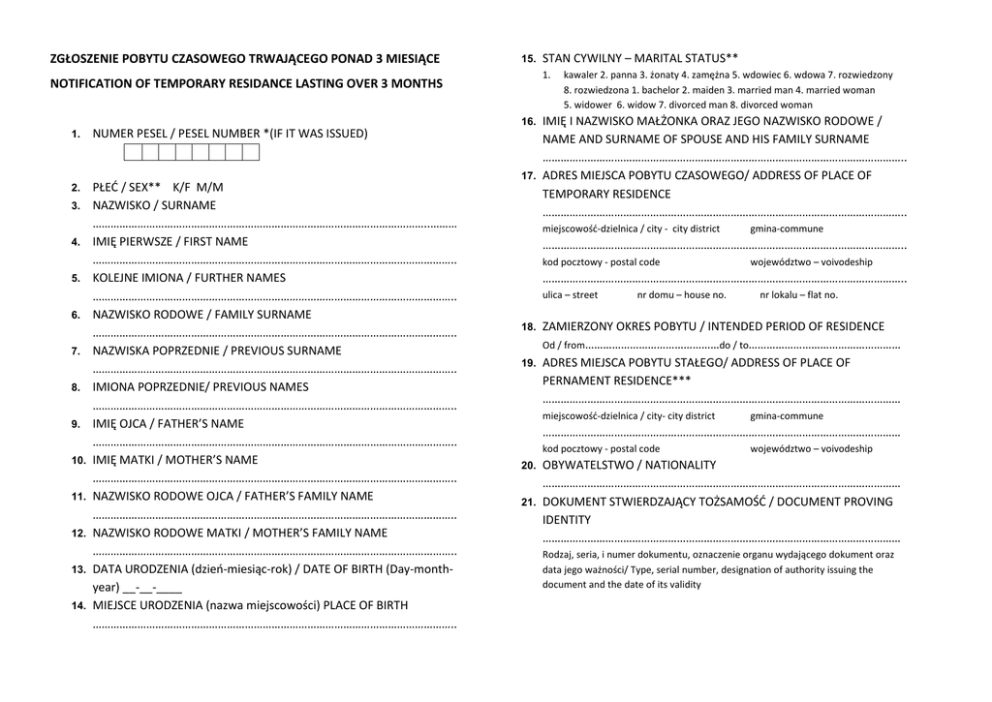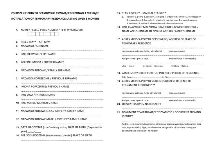 ZGŁOSZENIE POBYTU CZASOWEGO TRWAJĄCEGO PONAD 3 MIESIĄCE 15. STAN CYWILNY – MARITAL STATUS** 1. NOTIFICATION OF TEMPORARY RESIDANCE LASTING OVER 3 MONTHS kawaler 2. panna 3. żonaty 4. zamężna 5. wdowiec 6. wdowa 7. rozwiedzony 8. rozwiedzona 1. bachelor 2. maiden 3. married man 4. married woman 5. widower 6. widow 7. divorced man 8. divorced woman IMIĘ I NAZWISKO MAŁŻONKA ORAZ JEGO NAZWISKO RODOWE / NAME AND SURNAME OF SPOUSE AND HIS FAMILY SURNAME ………………………………………………………………………………………………………….. 17. ADRES MIEJSCA POBYTU CZASOWEGO/ ADDRESS OF PLACE OF TEMPORARY RESIDENCE ………………………………………………………………………………………………………….. 16. 1. NUMER PESEL / PESEL NUMBER *(IF IT WAS ISSUED) 2. PŁEĆ / SEX** K/F M/M NAZWISKO / SURNAME …………………………………………………………………………………………………..……… IMIĘ PIERWSZE / FIRST NAME ………………………………………………………………………………………………………….. KOLEJNE IMIONA / FURTHER NAMES ………………………………………………………………………………………………………….. NAZWISKO RODOWE / FAMILY SURNAME ………………………………………………………………………………………………………….. NAZWISKA POPRZEDNIE / PREVIOUS SURNAME ………………………………………………………………………………………………………….. IMIONA POPRZEDNIE/ PREVIOUS NAMES ………………………………………………………………………………………………………….. IMIĘ OJCA / FATHER’S NAME ………………………………………………………………………………………………………….. IMIĘ MATKI / MOTHER’S NAME ………………………………………………………………………………………………………….. NAZWISKO RODOWE OJCA / FATHER’S FAMILY NAME ………………………………………………………………………………………………………….. NAZWISKO RODOWE MATKI / MOTHER’S FAMILY NAME ………………………………………………………………………………………………………….. DATA URODZENIA (dzień-miesiąc-rok) / DATE OF BIRTH (Day-monthyear) __-__-____ MIEJSCE URODZENIA (nazwa miejscowości) PLACE OF BIRTH ………………………………………………………………………………………………………….. 3. 4. 5. 6. 7. 8. 9. 10. 11. 12. 13. 14. miejscowość-dzielnica / city - city district gmina-commune ………………………………………………………………………………………………………….. kod pocztowy - postal code województwo – voivodeship ………………………………………………………………………………………………………….. ulica – street nr domu – house no. nr lokalu – flat no. ZAMIERZONY OKRES POBYTU / INTENDED PERIOD OF RESIDENCE Od / from………………………………………do / to…………………………………………… 19. ADRES MIEJSCA POBYTU STAŁEGO/ ADDRESS OF PLACE OF PERNAMENT RESIDENCE*** ………………………………………………………………………………………………………… 18. miejscowość-dzielnica / city- city district gmina-commune ………………………………………………………………………………………………………… kod pocztowy - postal code województwo – voivodeship OBYWATELSTWO / NATIONALITY ………………………………………………………………………………………………………… 21. DOKUMENT STWIERDZAJĄCY TOŻSAMOŚĆ / DOCUMENT PROVING IDENTITY ………………………………………………………………………………………………………… 20. Rodzaj, seria, i numer dokumentu, oznaczenie organu wydającego dokument oraz data jego ważności/ Type, serial number, designation of authority issuing the document and the date of its validity 22. 23. DOKUMENT UPRAWNIAJĄCY DO POBYTU NA TERYTORIUM RP / DOCUMENT AUTHORIZING TO STAY IN THE RUPUBLIC OF POLAND ………………………………………………………………………………………………………… Stwierdzam wiarygodność powyższych danych/ I hereby certify that the above information is true and correct Rodzaj, seria, i numer dokumentu, oznaczenie organu wydającego dokument oraz data jego ważności/ Type, serial number, designation of authority issuing the document and the date of its validity ……………………………………... OBOWIĄZKOWI WOJSKOWEMU PODLEGA- NIE PODLEGA / SUBJET TO MILIATERY SERVICE YES-NO* ………………………………………………………………………………………………………… stopień wojskowy nazwa, seria i nr wojskowego dokumentu osobistego lub poświadczenie o zgłoszeniu się do rejestracji przedpoborowych/ military rank name, serial number of military identification card or pre-conscription registration attendance certificate ………………………………………………………………………………………………………… Wojskowa Komenda Uzupełnień, w której ewidencji osoba pozostaje Military Replenishment Command, whose files subject is the person 24. WYKSZTAŁCENIE / EDUCATION** 1.wyższe/ higher 2. policealne/ post-secondary 3. średnie/secondary 4. zasadnicze zawodowe/ vocational 5. gimnazjalne/ lower secondary 6. podstawowe/primary 7. niepełne podstawowe/incomplete primary 8. nie podlega obowiązkowi szkolnemu/ is not subject to compulsory education (miejscowość i data) (place and date) …………………………………