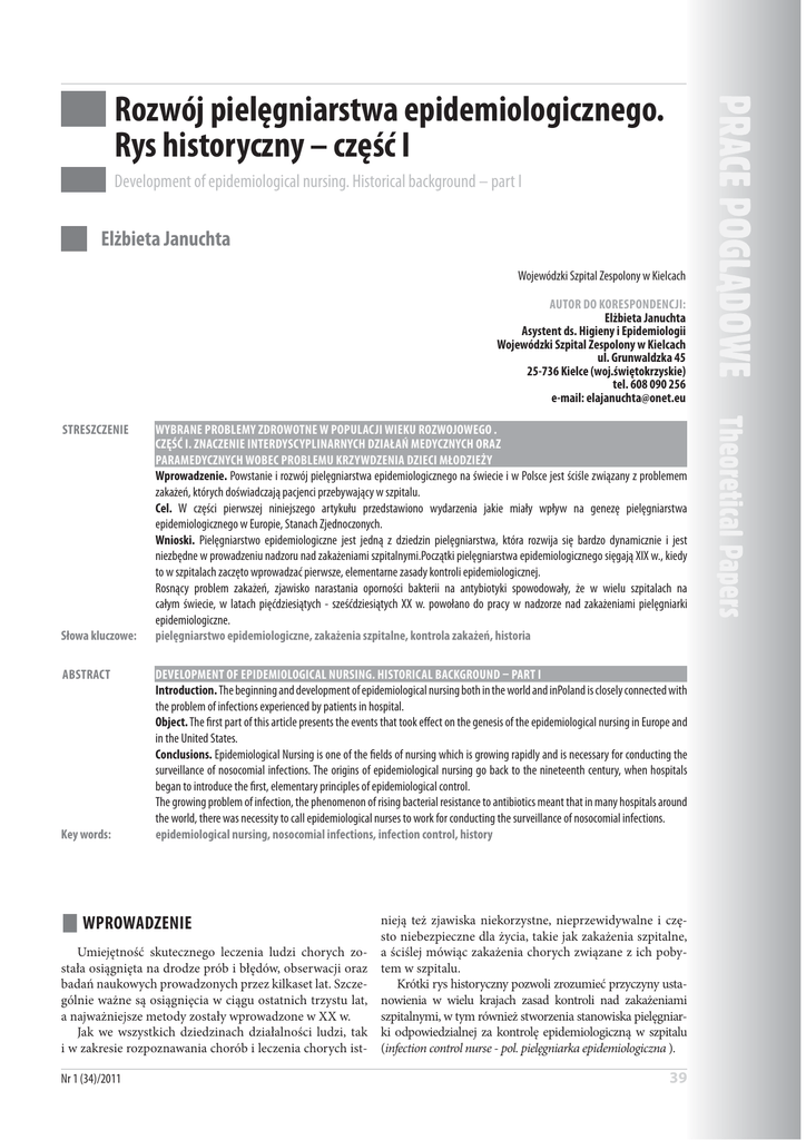 Elżbieta Januchta Rozwój pielęgniarstwa epidemiologicznego. Rys historyczny – część I Development of epidemiological nursing. Historical background – part I Elżbieta Januchta Wojewódzki Szpital Zespolony w Kielcach AUTOR DO KORESPONDENCJI: Elżbieta Januchta Asystent ds. Higieny i Epidemiologii Wojewódzki Szpital Zespolony w Kielcach ul. Grunwaldzka 45 25-736 Kielce (woj.świętokrzyskie) tel. 608 090 256 e-mail: [email protected] STRESZCZENIE Słowa kluczowe: ABSTRACT Key words: WYBRANE PROBLEMY ZDROWOTNE W POPULACJI WIEKU ROZWOJOWEGO . CZĘŚĆ I. ZNACZENIE INTERDYSCYPLINARNYCH DZIAŁAŃ MEDYCZNYCH ORAZ PARAMEDYCZNYCH WOBEC PROBLEMU KRZYWDZENIA DZIECI MŁODZIEŻY Wprowadzenie. Powstanie i rozwój pielęgniarstwa epidemiologicznego na świecie i w Polsce jest ściśle związany z problemem zakażeń, których doświadczają pacjenci przebywający w szpitalu. Cel. W części pierwszej niniejszego artykułu przedstawiono wydarzenia jakie miały wpływ na genezę pielęgniarstwa epidemiologicznego w Europie, Stanach Zjednoczonych. Wnioski. Pielęgniarstwo epidemiologiczne jest jedną z dziedzin pielęgniarstwa, która rozwija się bardzo dynamicznie i jest niezbędne w prowadzeniu nadzoru nad zakażeniami szpitalnymi.Początki pielęgniarstwa epidemiologicznego sięgają XIX w., kiedy to w szpitalach zaczęto wprowadzać pierwsze, elementarne zasady kontroli epidemiologicznej. Rosnący problem zakażeń, zjawisko narastania oporności bakterii na antybiotyki spowodowały, że w wielu szpitalach na całym świecie, w latach pięćdziesiątych - sześćdziesiątych XX w. powołano do pracy w nadzorze nad zakażeniami pielęgniarki epidemiologiczne. pielęgniarstwo epidemiologiczne, zakażenia szpitalne, kontrola zakażeń, historia DEVELOPMENT OF EPIDEMIOLOGICAL NURSING. HISTORICAL BACKGROUND – PART I Introduction. The beginning and development of epidemiological nursing both in the world and inPoland is closely connected with the problem of infections experienced by patients in hospital. Object. The first part of this article presents the events that took effect on the genesis of the epidemiological nursing in Europe and in the United States. Conclusions. Epidemiological Nursing is one of the fields of nursing which is growing rapidly and is necessary for conducting the surveillance of nosocomial infections. The origins of epidemiological nursing go back to the nineteenth century, when hospitals began to introduce the first, elementary principles of epidemiological control. The growing problem of infection, the phenomenon of rising bacterial resistance to antibiotics meant that in many hospitals around the world, there was necessity to call epidemiological nurses to work for conducting the surveillance of nosocomial infections. epidemiological nursing, nosocomial infections, infection control, history WPROWADZENIE nieją też zjawiska niekorzystne, nieprzewidywalne i często niebezpieczne dla życia, takie jak zakażenia szpitalne, Umiejętność skutecznego leczenia ludzi chorych zo- a ściślej mówiąc zakażenia chorych związane z ich pobystała osiągnięta na drodze prób i błędów, obserwacji oraz tem w szpitalu. badań naukowych prowadzonych przez kilkaset lat. SzczeKrótki rys historyczny pozwoli zrozumieć przyczyny ustagólnie ważne są osiągnięcia w ciągu ostatnich trzystu lat, nowienia w wielu krajach zasad kontroli nad zakażeniami a najważniejsze metody zostały wprowadzone w XX w. szpitalnymi, w tym również stworzenia stanowiska pielęgniarJak we wszystkich dziedzinach działalności ludzi, tak ki odpowiedzialnej za kontrolę epidemiologiczną w szpitalu i w zakresie rozpoznawania chorób i leczenia chorych ist- (infection control nurse - pol. pielęgniarka epidemiologiczna ). Nr 1 (34)/2011 39 Rozwój pielęgniarstwa epidemiologicznego. Rys historyczny – część I Problem zakażeń szpitalnych pojawił się wraz z pierwszymi zorganizowanymi oddziałami szpitalnymi. Natomiast zjawisko jakim jest choroba pojawiło się na naszym globie wraz z pojawieniem się na nim człowieka. POCZĄTKI PRZECIWDZIAŁANIA ZAKAŻENIOM Na przestrzeni wieków istota ludzka zmagała się z chorobami, starając się zwalczać je, a nawet im zapobiegać, dając przez to początek medycynie i innym pokrewnym naukom. Wykopaliska archeologiczne i badania nad początkami życia na Ziemi wskazują, że człowiek pierwotny dokonywał już różnych zabiegów operacyjnych, wykorzystując do tego celu narzędzia operacyjne wykonane z kości, ości ryb, kamienia, korzeni, następnie z cyny, brązu, ołowiu, a ok. 1200 r. p.n.e. - z żelaza. Pierwsze doniesienia o zabiegach sanitarnych obejmujących środowisko znajdujemy w poemacie greckim ,,Odyseja”. Są to informacje o ,,zażegnywaniu nieszczęścia’’. Odyseusz, po wymordowaniu zalotników nakazuje wykadzić siarką salę, w której odbył się mord. Celem tego zabiegu było przebłaganie bogów, natomiast racjonalnym wytłumaczeniem tych poleceń jest dezynfekcja powierzchni zabrudzonych krwią przy użyciu dwutlenku siarki, który ma działanie odkażające. W IX wieku p.n.e. Hindusi stosowali do celów odkażania rtęć i arszenik.[1] Hipokrates (460-377r. p.n.e.) twierdził, że choroby o charakterze zakaźnym związane są ze złym środowiskiem, gdzie znajdują się ,,miazmaty’’, czyli wyziewy gnijącej materii. Stosował jednocześnie empiryczną profilaktykę przeciw zakażeniom przez: obmywanie ran przegotowaną wodą deszczową z winem, golenie włosów dookoła ran na głowie, stosowanie w leczeniu ran: ałunu i siarczanu miedzi. Od 2400 lat w ochronie zdrowia obowiązywał Kodeks Hipokratesa, a w nim podstawowe polecenie ,,Primum non nocere”- „Po pierwsze nie szkodzić”.[1] Żydom zbiór zasad religijnych zawartych w Talmudzie zabraniał dotykania ran gołymi rękoma. Arabowie natomiast wynaleźli i wprowadzili do leczenia ran alkohol. Medycyna ludowa w wielu krajach nakazywała stosowania w leczeniu