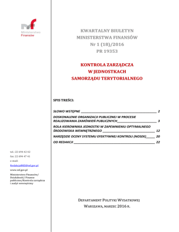 KWARTALNY BIULETYN MINISTERSTWA FINANSÓW Nr 1 (18)/2016 PR 19353 KONTROLA ZARZĄDCZA W JEDNOSTKACH SAMORZĄDU TERYTORIALNEGO SPIS TREŚCI: SŁOWO WSTĘPNE __________________________________________ 2 DOSKONALENIE ORGANIZACJI PUBLICZNEJ W PROCESIE REALIZOWANIA ZAMÓWIEŃ PUBLICZNYCH______________________ 3 ROLA KIEROWNIKA JEDNOSTKI W ZAPEWNIENIU OPTYMALNEGO ŚRODOWISKA WEWNĘTRZNEGO _____________________________ 12 NARZĘDZIE OCENY SYSTEMU EFEKTYWNEJ KONTROLI (NOSEK)_____ 20 OD REDAKCJI _____________________________________________ 22 tel.: 22 694 42 42 fax: 22 694 47 41 e-mail: [email protected] www.mf.gov.pl Ministerstwo Finansów/ Działalność/ Finanse publiczne/Kontrola zarządcza i audyt wewnętrzny DEPARTAMENT POLITYKI WYDATKOWEJ WARSZAWA, MARZEC 2016 R. SŁOWO WSTĘPNE Szanowni Państwo, w aktualnym numerze Biuletynu prezentujemy m.in. artykuł, w którym opisane zostały działania podejmowane przez organizację uczącą się, oraz informacje na temat wybranych zagadnień dotyczących środowiska wewnętrznego, będących przedmiotem dyskusji podczas konferencji zorganizowanej przez Dyrekcję Generalną ds. Budżetu Komisji Europejskiej1. Pierwszy artykuł, na przykładzie Urzędu Miejskiego w Dąbrowie Górniczej, ilustruje działania podejmowane przez organizację dążącą do stałego doskonalenia się. Autor artykułu podkreśla znaczenie aktywnego udziału całego zespołu w poszerzaniu wiedzy i doskonaleniu umiejętności dotyczących procesu udzielania zamówień publicznych. Takie podejście przyczynia się do zwiększenia świadomości i odpowiedzialności pracowników w ramach realizowania obowiązków, co w konsekwencji wpływa na usprawnienie organizacji publicznej oraz przynosi poprawę gospodarowaniem środkami publicznymi. Kolejny artykuł porusza wybrane aspekty środowiska wewnętrznego organizacji, które stanowi fundament pozostałych elementów kontroli zarządczej, oraz oddziałuje na wszystkie obszary działalności jednostki. Ogólne wymogi w zakresie środowiska wewnętrznego zostały zasygnalizowane w poprzednich wydaniach Biuletynu w odniesieniu do regulacji Unii Europejskiej w zakresie systemów zarządzania i kontroli w nowym okresie programowania 2014-20202. Tym razem artykuł w Biuletynie, odwołując się do materiałów konferencyjnych, wskazuje praktyczne narzędzia, z których kierownik jednostki może skorzystać usprawniając ten obszar. Przedstawiamy Państwu również informacje na temat autorskiego narzędzia oceny systemu efektywnej kontroli, opracowanego przez Śląski Związek Gmin i Powiatów, znajdującego się aktualnie w fazie testów. Katarzyna Szarkowska Redaktor Naczelny 1 Konferencja dla centralnych jednostek harmonizujących pełniących funkcję koordynacyjną w zakresie kontroli zarządczej (wewnętrznej) i audytu wewnętrznego w krajach UE. 2 Biuletyn Nr 3 i 4 2015 r. Strona 2 z 22 DOSKONALENIE ORGANIZACJI PUBLICZNEJ REALIZOWANIA ZAMÓWIEŃ PUBLICZNYCH W PROCESIE Jednym z warunków skutecznego zarządzania w organizacji, zarówno publicznej, jak i prywatnej, jest aktywne uczestnictwo zespołu w procesie uczenia się. Wymaga to otwartości na procesy zachodzące w nieustannie zmieniającym się otoczeniu, m.in. poprzez analizowanie i doskonalenie istniejących procedur, wdrażanie dobrych praktyk ograniczających zidentyfikowane ryzyka, a także elastyczne reagowanie w sytuacjach nieprzewidzianych. Takie podejście pomaga w unikaniu popełniania błędów. Powyższe reguły można odnieść do różnych obszarów działalności jednostki. W artykule zostaną one zilustrowane na przykładzie wydatkowania środków publicznych i zawierania umów w sprawie zamówień publicznych przez jednostki samorządu terytorialnego (gminy). Ryzyko popełnienia błędów w tym obszarze jest stosunkowo wysokie, dlatego zespołowe uczenie się, usprawniające system zamówień publicznych, jest niezbędne dla doskonalenia organizacji i zapewnienia jej prawidłowego funkcjonowania. ORGANIZACJA UCZĄCA SIĘ NA PRZYKŁADZIE URZĘDU MIEJSKIEGO W DĄBROWIE GÓRNICZEJ Elementy procesu uczenia się, które wyróżniają system zamówień publicznych, zostaną przedstawione na przykładzie rozwiązań zastosowanych w Biurze Koordynacji Zamówień Publicznych i Opinii Prawnych (dalej jako „BZP”) w Urzędzie Miejskim w Dąbrowie Górniczej. Właściwość BZP obejmuje realizację m.in. takich obowiązków, jak3: 1) analiza harmonogramów zamówień publicznych opracowanych przez dysponentów środków budżetowych, a w szczególności prawidłowości określenia progów finansowych i zaproponowanych trybów udzielenia zamówienia; 2) opracowywanie i przedkładanie Prezydentowi Miasta wniosków dotyczących zamówień publicznych scentralizowanych; 3) nadzór nad realizacją i aktualizacją planu prowadzonych postępowań o udzielenie zamówień publicznych w oparciu o harmonogramy; 4) przygotowanie specyfikacji istotnych warunków zamówienia na podstawie składanego do BZP wniosku o wszczęcie postępowania o udzielenie zamówienia; 3 Tekst Regulaminu Organizacyjnego Urzędu Miejskiego w Dąbrowie Górniczej jest dostępny na stronie http://www.bip.dabrowa-gornicza.pl/BIP.aspx?ident=71963. Strona 3 z 22 5) redagowanie i publikacja, z zachowaniem wymaganych terminów, ogłoszeń o postępowaniach i wynikach postępowań o udzielenie zamówień publicznych na tablicy ogłoszeń oraz na stronie internetowej, a w przypadkach wymaganych ustawą Prawo zamówień publicznych – także w Biuletynie Zamówień Publicznych oraz Dzienniku Urzędowym Unii Europejskiej; 6) uczestnictwo w postępowaniach o udzielenie zamówień publicznych organizowanych przez komórki organizacyjne Urzędu; 7) prowadzenie instruktażu, sprawozdawczości, analityki, kontroli procedur i pomocy prawnej w zakresie udzielanych zamówień publicznych w Urzędzie Miejskim. Wybrane rozwiązania stosowane w BZP, przedstawione w tym artykule, są interesujące ze względu na ich innowa