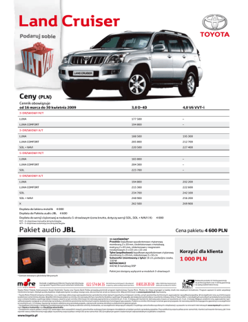 Land Cruiser Ceny (PLN) Cennik obowiązuje od 16 marca do 30 kwietnia 2009 3,0 D-4D 4,0 V6 VVT-i LUNA 177 500 – LUNA COMFORT 194 800 – LUNA 188 500 195 300 LUNA COMFORT 205 800 212 700 SOL + NAVI 220 500 227 400 LUNA 183 800 – LUNA COMFORT 204 300 – SOL 223 700 – LUNA 194 800 202 200 LUNA COMFORT 215 300 222 600 SOL 234 700 242 100 SOL + NAVI 248 900 256 200 X 262 500 269 900 3-drzwiowy M/T 3-drzwiowy A/T 5-drzwiowy M/T 5-drzwiowy A/T Dopłata do lakieru metalik 4 000 Dopłata do Pakietu audio JBL 4 600 Dopłata do wersji ciężarowej w nadwoziu 5-drzwiowym (cena brutto, dotyczy wersji SOL, SOL + NAVI i X) 4 000 M/T – 6-stopniowa manualna skrzynia biegów A/T – 5-stopniowa automatyczna skrzynia biegów Pakiet audio JBL Cena pakietu 4 600 PLN 11 Głośników* Przednie: kopułkowe wysokotonowe z tytanową membraną 2 x 20 mm, średniotonowe z metalową matrycą 2 x 65 mm, niskotonowe z magnesem neodymowym 2 x (15 cm x 22 cm) Tylne (współosiowe): kopułkowe wysokotonowe z tytanową membraną 2 x 20 mm, niskotonowe 2 x 16 cm Subwoofer (montowany z tyłu): 16 cm, podwójna cewka, 110 W Wzmacniacz 440 W, 8-kanałowy DSP Korzyść dla klienta 1 000 PLN Pakiet jest dostępny wyłącznie w modelach 5-drzwiowych * Zamiast dziewięciu głośników fabrycznych Kontakt z najbliższym Dilerem Toyoty lub informacja o programie Toyota More pod numerami telefonów: 022 574 04 35 dla telefonów komórkowych i dla połączeń z zagranicy, opłata według stawek operatora 0 801 20 20 20 tylko z telefonów stacjonarnych, opłata jak za połączenie lokalne Nadwozie posiada 12-letnią gwarancję na perforację blach oraz 3-letnią gwarancję na wady powłoki lakierniczej Toyota Motor Poland, Autoryzowane Stacje Dealerskie Toyoty oraz Toyota Bank Polska prowadzą pionierski program lojalnościowy Toyota More. Możesz do niego przystąpić w każdej chwili, bez zbędnych formalności. Program zapewni Ci wiele satysfakcji i konkretne korzyści. Zdobyte punkty będziesz mógł wykorzystać na zakup nowego auta, akcesoriów lub serwis w niższej cenie. Więcej informacji na www.toyotamore.pl. Zapraszamy. • Toyota Motor Poland Company Limited sp. z o.o. zastrzega sobie prawo wprowadzenia bez uprzedzenia zmian danych zawartych w niniejszym cenniku, w tym parametrów technicznych, wyposażenia i specyfikacji pojazdów. W szczególności ceny są zróżnicowane w zależności od terminów dostaw. Wszelkie informacje podane w cenniku nie stanowią oferty w rozumieniu Kodeksu cywilnego. W wypadku sprzedaży konsumenckiej w rozumieniu Ustawy z dnia 27 lipca 2002 r. o szczególnych warunkach sprzedaży konsumenckiej oraz o zmianie Kodeksu cywilnego (dalej: Ustawa), zawarte w tym cenniku informacje nie stanowią zapewnienia w rozumieniu art. 4 ust. 3 Ustawy, jak również nie stanowią opisu towaru w rozumieniu art. 4 ust. 2 Ustawy. Wiążące ustalenie ceny, wyposażenia i specyfikacji pojazdu następuje w umowie jego sprzedaży, a określenie parametrów technicznych zawiera świadectwo homologacji typu pojazdu. Podane w cenniku informacje na temat gwarancji pojazdu nie stanowią udzielenia kupującemu gwarancji, w szczególności w rozumieniu art. 13 Ustawy. Gwarancja zostanie udzielona przy sprzedaży pojazdu, a jej warunki zostaną określone w dokumencie gwarancyjnym. • Szczegółowe informacje o działaniach podejmowanych przez Toyotę w zakresie ochrony środowiska, a w szczególności dotyczących odzysku i recyklingu samochodów wycofanych z eksploatacji, są zawarte na stronach internetowych www.toyota.pl na podstronach Toyota a środowisko oraz Recykling samochodów. • Zestawienie zużycia paliwa i emisji CO2 zawierające dane wszystkich nowych samochodów osobowych jest dostępne nieodpłatnie w każdym punkcie sprzedaży pojazdów. Poza wielkością zużycia paliwa przez samochód, również zachowanie kierowcy, jak i inne czynniki natury nietechnicznej mają wpływ na poziomy zużycia paliwa i emisji CO2 przez samochód. CO2 jest głównym gazem cieplarnianym odpowiedzialnym za globalne ocieplenie. www.toyota.pl