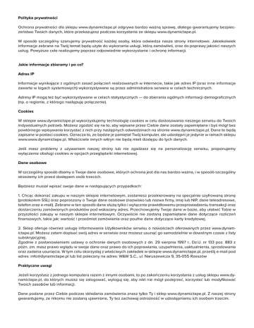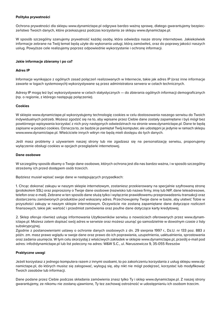 Polityka prywatności Ochrona prywatności dla sklepu www.dynamictape.pl odgrywa bardzo ważną sprawę, dlatego gwarantujemy bezpieczeństwo Twoich danych, które przekazujesz podczas korzystania ze sklepu www.dynamictape.pl. W sposób szczególny szanujemy prywatność każdej osoby, która odwiedza nasze strony internetowe. Jakiekolwiek informacje zebrane na Twój temat będą użyte do wykonania usługi, którą zamówiłeś, oraz do poprawy jakości naszych usług. Powyższe cele realizujemy poprzez odpowiednie wykorzystanie i ochronę informacji. Jakie informacje zbieramy i po co? Adres IP Informacje wynikające z ogólnych zasad połączeń realizowanych w Internecie, takie jak adres IP (oraz inne informacje zawarte w logach systemowych) wykorzystywane są przez administratora serwera w celach technicznych. Adresy IP mogą też być wykorzystywane w celach statystycznych — do zbierania ogólnych informacji demograficznych (np. o regionie, z którego następuję połączenie). Cookies W sklepie www.dynamictape.pl wykorzystujemy technologię cookies w celu dostosowania naszego serwisu do Twoich indywidualnych potrzeb. Możesz zgodzić się na to, aby wpisane przez Ciebie dane zostały zapamiętane i byś mógł bez powtórnego wpisywania korzystać z nich przy następnych odwiedzinach na stronie www.dynamictape.pl. Dane te będą zapisane w postaci cookies. Oznacza to, ze będzie je pamiętał Twój komputer, ale udostępni je jedynie w ramach sklepu www.www.dynamictape.pl. Właściciele innych witryn nie będą mieli dostępu do tych danych. Jeśli masz problemy z używaniem naszej strony lub nie zgadzasz się na personalizację serwisu, proponujemy wyłączenie obsługi cookies w opcjach przeglądarki internetowej. Dane osobowe W szczególny sposób dbamy o Twoje dane osobowe, których ochrona jest dla nas bardzo ważna, i w sposób szczególny strzeżemy ich przed dostępem osób trzecich. Będziesz musiał wpisać swoje dane w następujących przypadkach: 1. Chcąc dokonać zakupu w naszym sklepie internetowym, zostaniesz przekierowany na specjalnie szyfrowaną stronę (protokołem SSL) oraz poproszony o Twoje dane osobowe (nazwisko lub nazwa firmy, imię lub NIP, dane teleadresowe, telefon oraz e-mail). Zebrane w ten sposób dane służą tylko i wyłącznie prawidłowemu przeprowadzeniu transakcji oraz dostarczeniu zamówionych produktów pod wskazany adres. Przechowujemy Twoje dane w bazie, aby ułatwić Tobie w przyszłości zakupy w naszym sklepie internetowym. Oczywiście nie zostaną zapamiętane dane dotyczące rozliczeń finansowych, takie jak: wartość i przedmiot zamówienia oraz poufne dane dotyczące karty kredytowej. 2. Sklep oferuje również usługę informowania Użytkowników serwisu o nowościach oferowanych przez www.dynamictape.pl. Możesz zatem dopisać swój adres w serwisie oraz możesz usunąć go samodzielnie w dowolnym czasie z listy subskrypcyjnej. Zgodnie z postanowieniami ustawy o ochronie danych osobowych z dn. 29 sierpnia 1997 r., Dz.U. nr 133 poz. 883 z późn. zm. masz prawo wglądu w swoje dane oraz prawo do ich poprawiania, uzupełnienia, uaktualnienia, sprostowania oraz zadania usunięcia. W tym celu skorzystaj z właściwych zakładek w sklepie www.dynamictape.pl, prześlij e-mail pod adres: [email protected] lub list polecony na adres: W&W S.C., ul. Naruszewicza 9, 35-055 Rzeszów Praktyczne uwagi Jeżeli korzystasz z jednego komputera razem z innymi osobami, to po zakończeniu korzystania z usług sklepu www.dynamictape.pl, do których musisz się zalogować, wyloguj się, aby nikt nie mógł podejrzeć, korzystać lub modyfikować Twoich zasobów lub informacji. Dane podane przez Ciebie podczas składania zamówienia znasz tylko Ty i sklep www.dynamictape.pl. Z naszej strony gwarantujemy, ze nikomu nie zostaną ujawnione, Ty tez zachowaj ostrożność w udostępnianiu ich osobom trzecim.