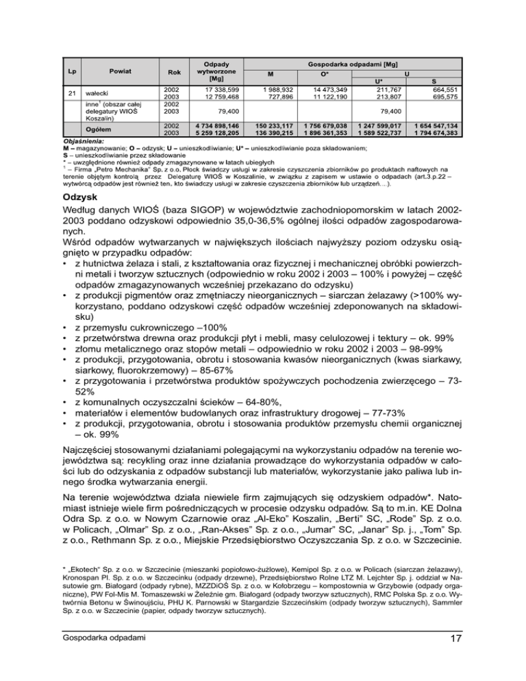 21 wa∏ecki inne1 (obszar ca∏ej delegatury WIOÂ Koszalin) Ogó∏em 2003 2002 2003 2002 2003 19 937,677 17 338,599 12 759,468 12,634 1 988,932 727,896 19 025,452 14 473,349 11 122,190 79,400 2002 4 734 898,146 2003 5 259 128,205 209,910 211,767 213,807 689,680 664,551 695,575 79,400 150 233,117 136 390,215 1 756 679,038 1 896 361,353 1 247 599,017 1 654 547,134 1 589 522,737 1 794 674,383 ObjaÊnienia: M – magazynowanie; O – odzysk; U – unieszkodliwianie; U* – unieszkodliwianie poza sk∏adowaniem; S – unieszkodliwianie przez sk∏adowanie * – uwzgl´dnione równie˝ odpady zmagazynowane w latach ubieg∏ych 1 – Firma „Petro Mechanika” Sp. z o.o. P∏ock Êwiadczy us∏ugi w zakresie czyszczenia zbiorników po produktach naftowych na terenie obj´tym kontrolà przez Delegatur´ WIOÂ w Koszalinie, w zwiàzku z zapisem w ustawie o odpadach (art.3.p.22 – wytwórcà odpadów jest równie˝ ten kto Êwiadczy us∏ugi w zakresie czyszczenia zbiorników lub urzàdzeƒ....). Odzysk Wed∏ug danych WIOÂ (baza SIGOP) w województwie zachodniopomorskim w latach 20022003 poddano odzyskowi odpowiednio 35,0-36,5% ogólnej iloÊci odpadów zagospodarowanych. WÊród odpadów wytwarzanych w najwi´kszych iloÊciach najwy˝szy poziom odzysku osiàgni´to w przypadku odpadów: • z hutnictwa ˝elaza i stali, z kszta∏towania oraz fizycznej i mechanicznej obróbki powierzchni metali i tworzyw sztucznych (odpowiednio w roku 2002 i 2003 – 100% i powy˝ej – cz´Êç odpadów zmagazynowanych wczeÊniej przekazano do odzysku) • z produkcji pigmentów oraz zm´tniaczy nieorganicznych – siarczan ˝elazawy (>100% wykorzystano, poddano odzyskowi cz´Êç odpadów wczeÊniej zdeponowanych na sk∏adowisku) • z przemys∏u cukrowniczego –100% • z przetwórstwa drewna oraz produkcji p∏yt i mebli, masy celulozowej i tektury – ok. 99% • z∏omu metalicznego oraz stopów metali – odpowiednio w roku 2002 i 2003 – 98-99% • z produkcji, przygotowania, obrotu i stosowania kwasów nieorganicznych (kwas siarkawy, siarkowy, fluorokrzemowy) – 85-67% • z przygotowania i przetwórstwa produktów spo˝ywczych pochodzenia zwierz´cego – 7352% • z komunalnych oczyszczalni Êcieków – 64-80%, • materia∏ów i elementów budowlanych oraz infrastruktury drogowej – 77-73% • z produkcji, przygotowania, obrotu i stosowania produktów przemys∏u chemii organicznej – ok. 99% Najcz´Êciej stosowanymi dzia∏aniami polegajàcymi na wykorzystaniu odpadów na terenie województwa sà: recykling oraz inne dzia∏ania prowadzàce do wykorzystania odpadów w ca∏oÊci lub do odzyskania z odpadów substancji lub materia∏ów, wykorzystanie jako paliwa lub innego Êrodka wytwarzania energii. Na terenie województwa dzia∏a niewiele firm zajmujàcych si´ odzyskiem odpadów*. Natomiast istnieje wiele firm poÊredniczàcych w procesie odzysku odpadów. Sà to m.in. KE Dolna Odra Sp. z o.o. w Nowym Czarnowie oraz „Al-Eko” Koszalin, „Berti” SC, „Rode” Sp. z o.o. w Policach, „Olmar” Sp. z o.o., „Ran-Akses” Sp. z o.o., „Jumar” SC, „Janar” Sp. j., „Tom” Sp. z o.o., Rethmann Sp. z o.o., Miejskie Przedsi´biorstwo Oczyszczania Sp. z o.o. w Szczecinie. * „Ekotech“ Sp. z o.o. w Szczecinie (mieszanki popio∏owo-˝u˝lowe), Kemipol Sp. z o.o. w Policach (siarczan ˝elazawy), Kronospan Pl. Sp. z o.o. w Szczecinku (odpady drzewne), Przedsi´biorstwo Rolne LTZ M. Lejchter Sp. j. oddzia∏ w Nasutowie gm. Bia∏ogard (odpady rybne), MZZDiOÂ Sp. z o.o. w Ko∏obrzegu – kompostownia w Grzybowie (odpady organiczne), PW Fol-Mis M. Tomaszewski w ˚eleênie gm. Bia∏ogard (odpady tworzyw sztucznych), RMC Polska Sp. z o.o. Wytwórnia Betonu w ÂwinoujÊciu, PHU K. Parnowski w Stargardzie Szczeciƒskim (odpady tworzyw sztucznych), Sammler Sp. z o.o. w Szczecinie (papier, odpady tworzyw sztucznych). Gospodarka odpadami 17